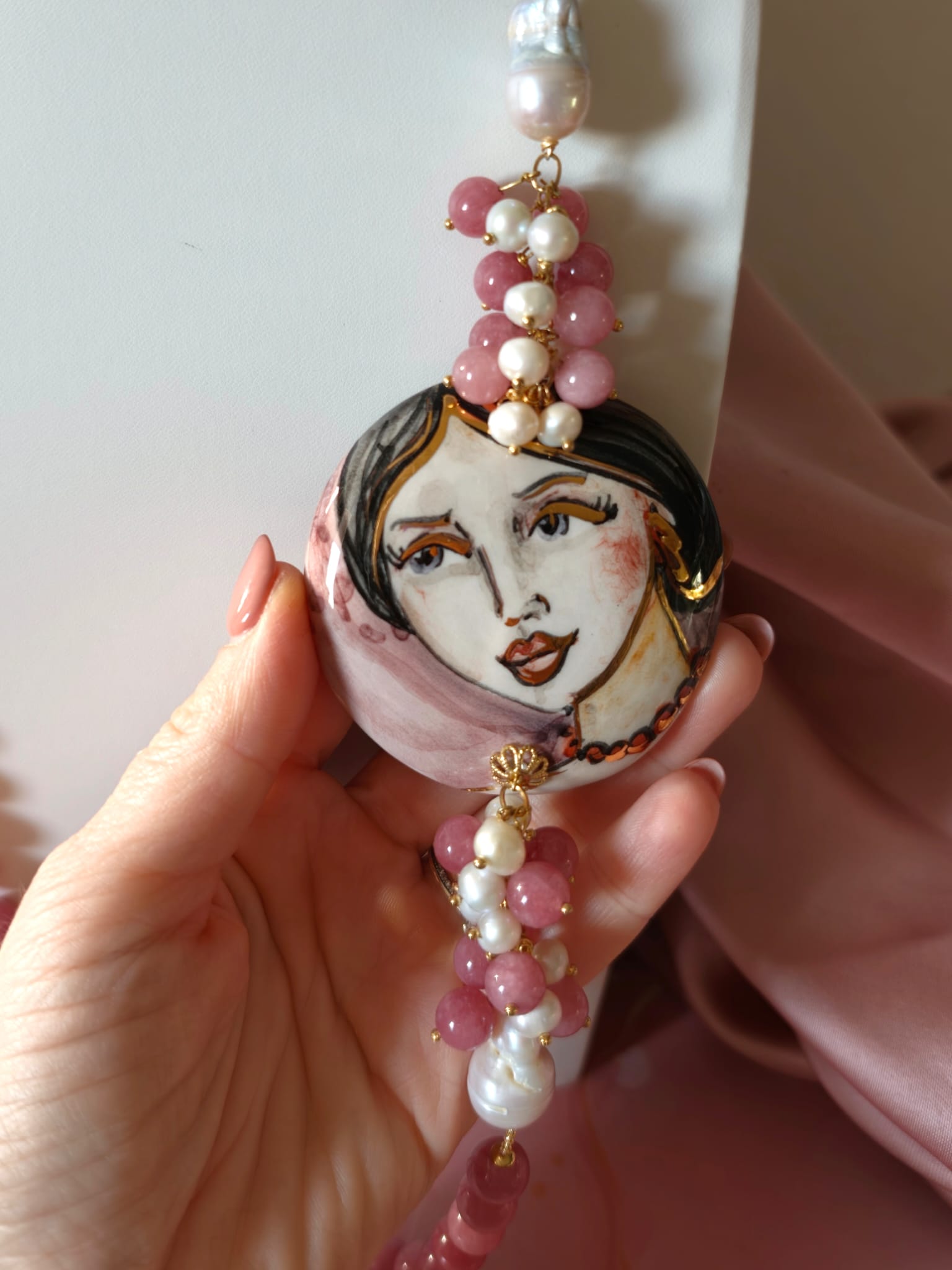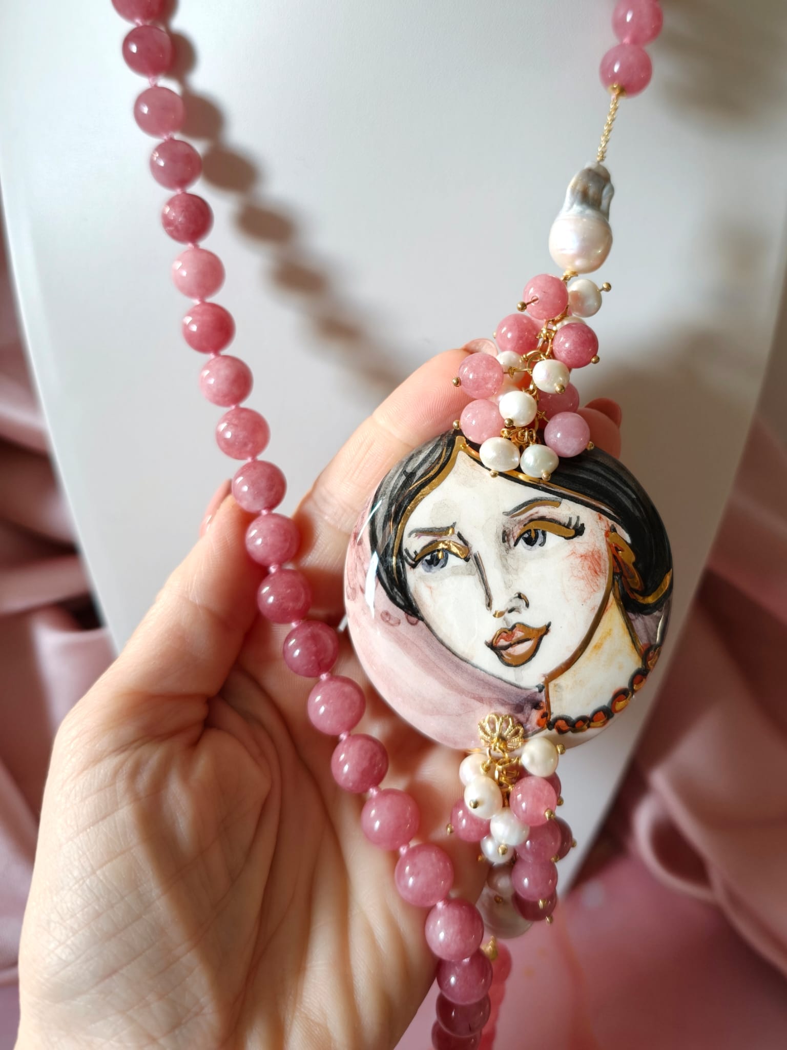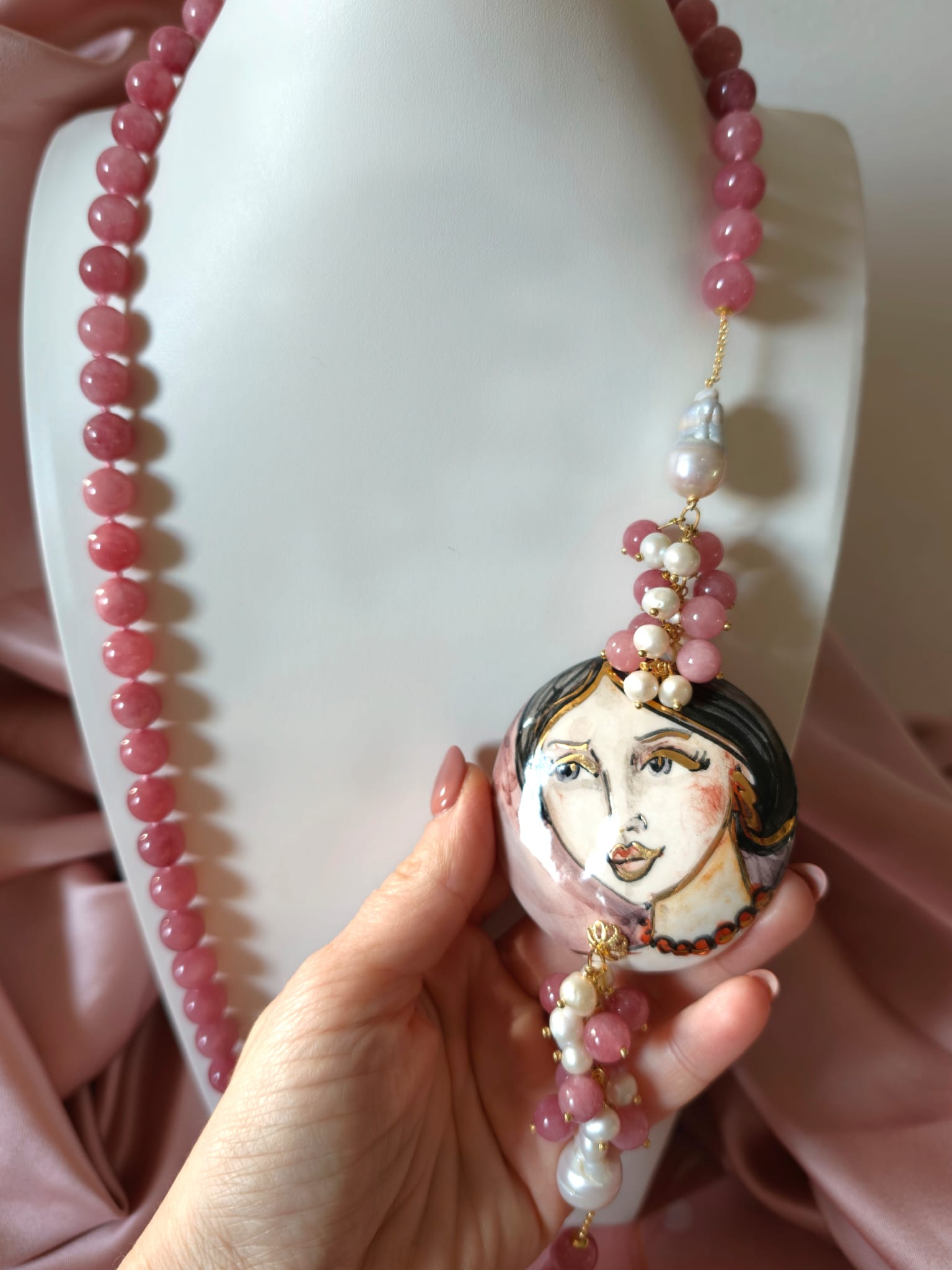 La collana giada e volto donna è un pezzo unico artigianale realizzato con giada rosa da 10 mm annodata a mano, perle barocche e un raffinato connettore in ceramica dipinto a mano. Lunga circa 83 cm, si appoggia elegantemente al seno.