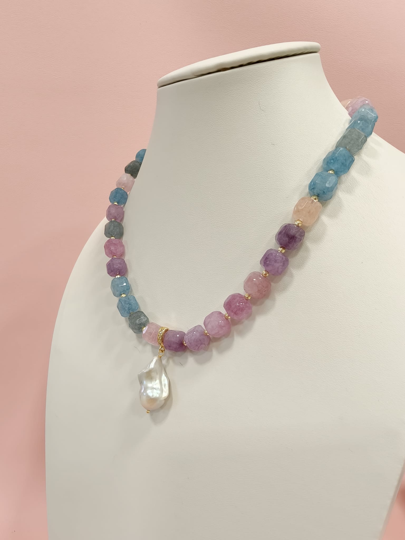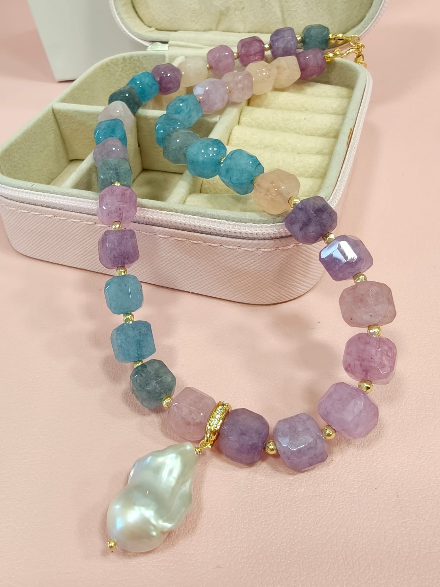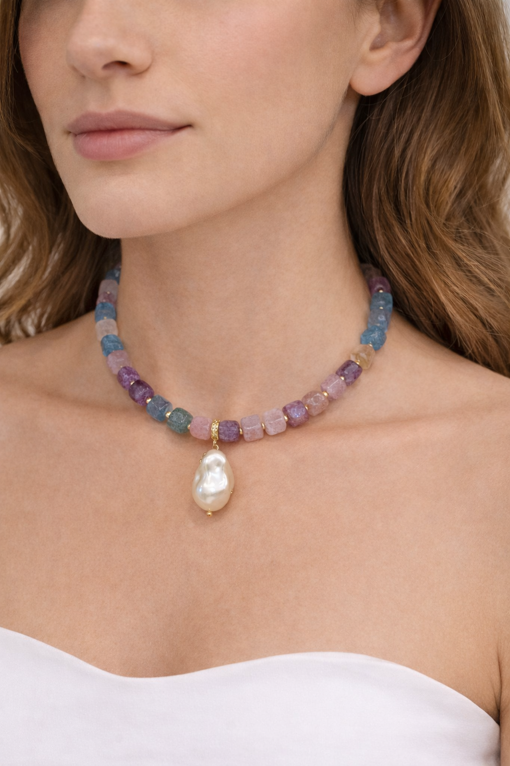 La collana giade multicolor è un gioiello luminoso e raffinato. Unisce colori delicati, pietre naturali e una grande perla barocca centrale. Il risultato è un girocollo elegante ma allo stesso tempo moderno.