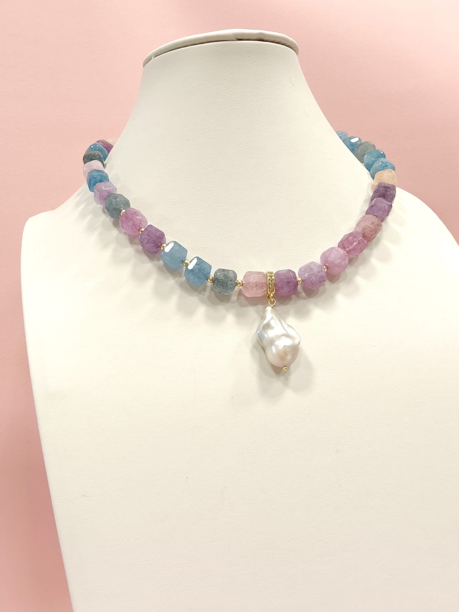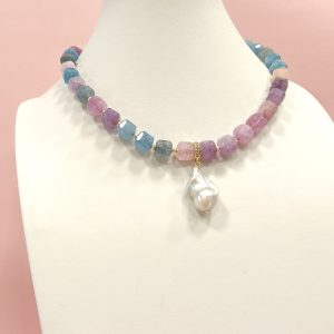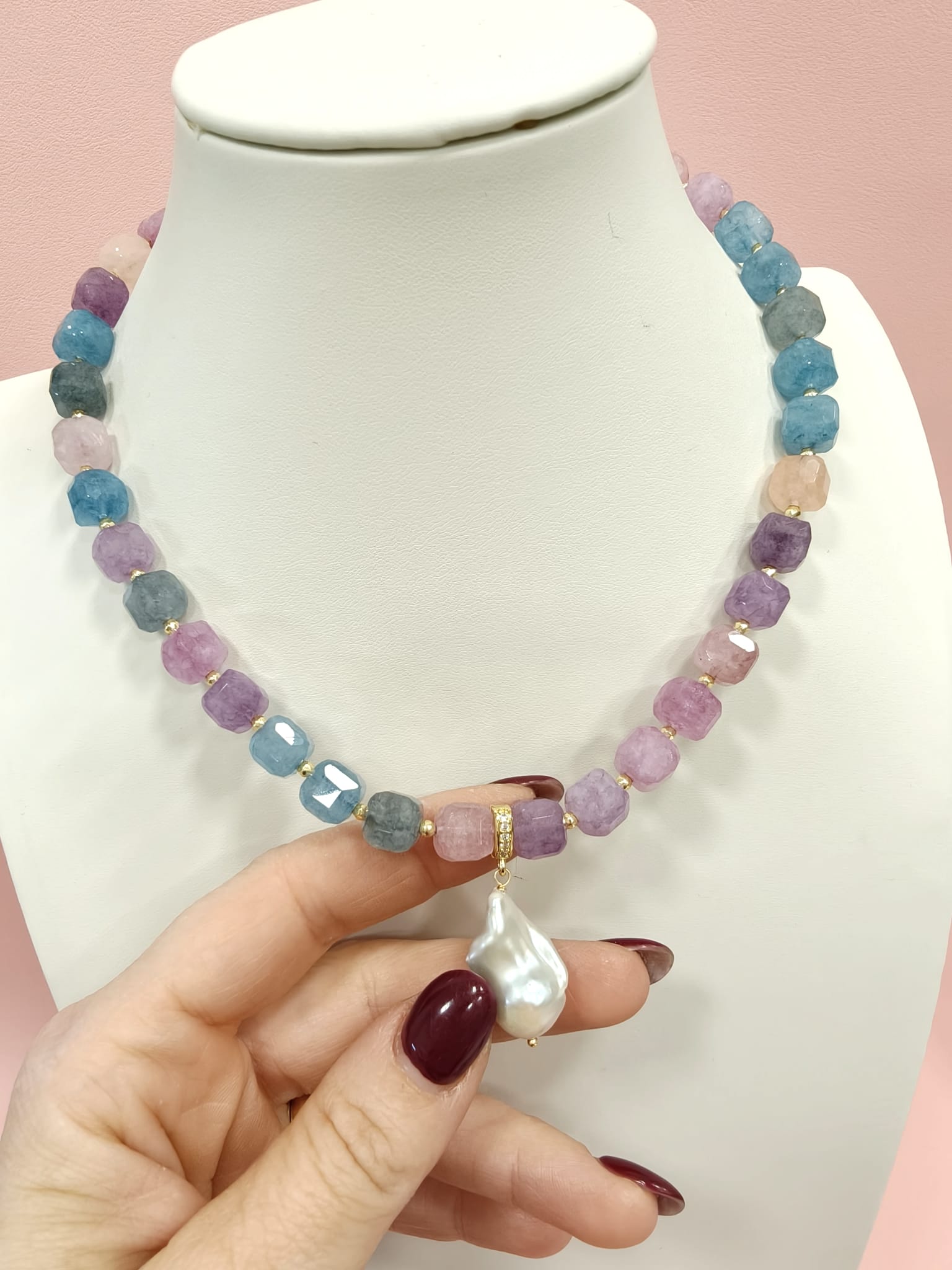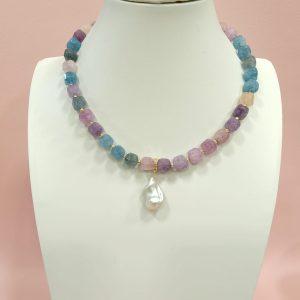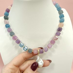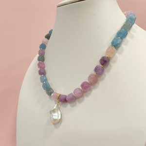 La palette cromatica è morbida e armoniosa. Infatti alterna tonalità di azzurro, lilla, rosa e sfumature più neutre. Questo mix rende la collana estremamente versatile. Può essere indossata facilmente sia con abiti eleganti sia con look più quotidiani.