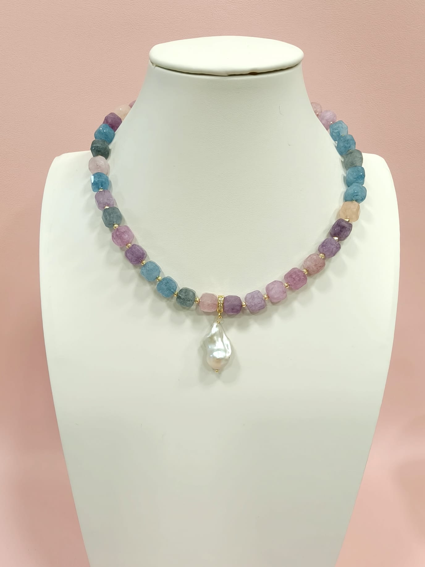 Materiali: giade multicolor, ematite dorata, perla barocca naturale