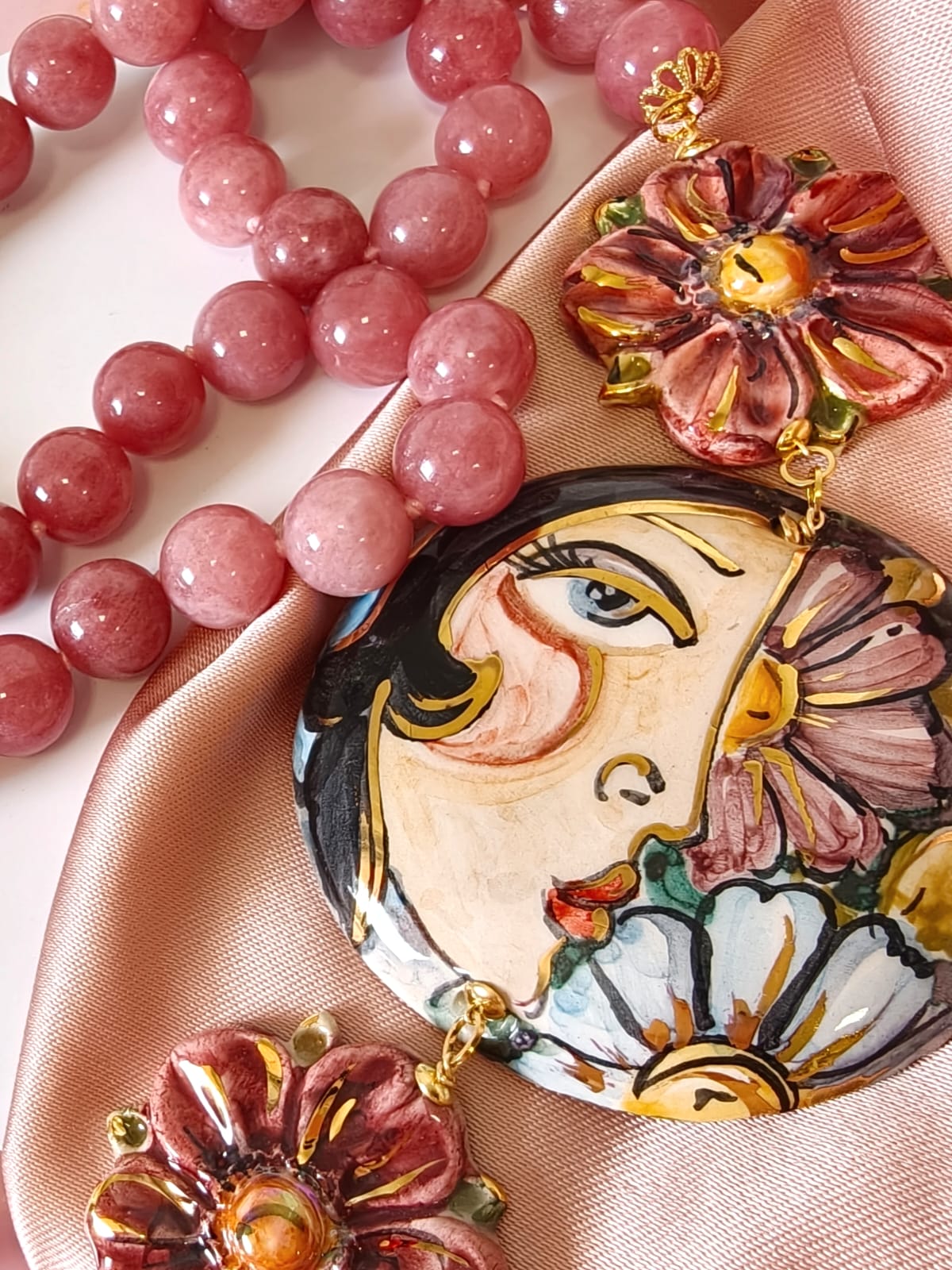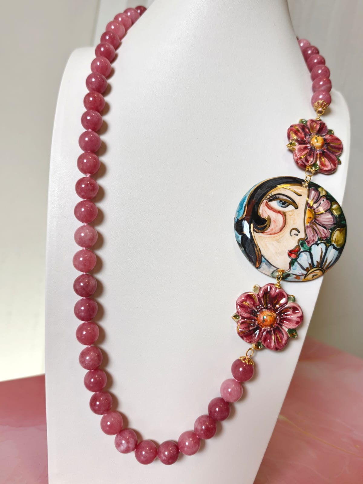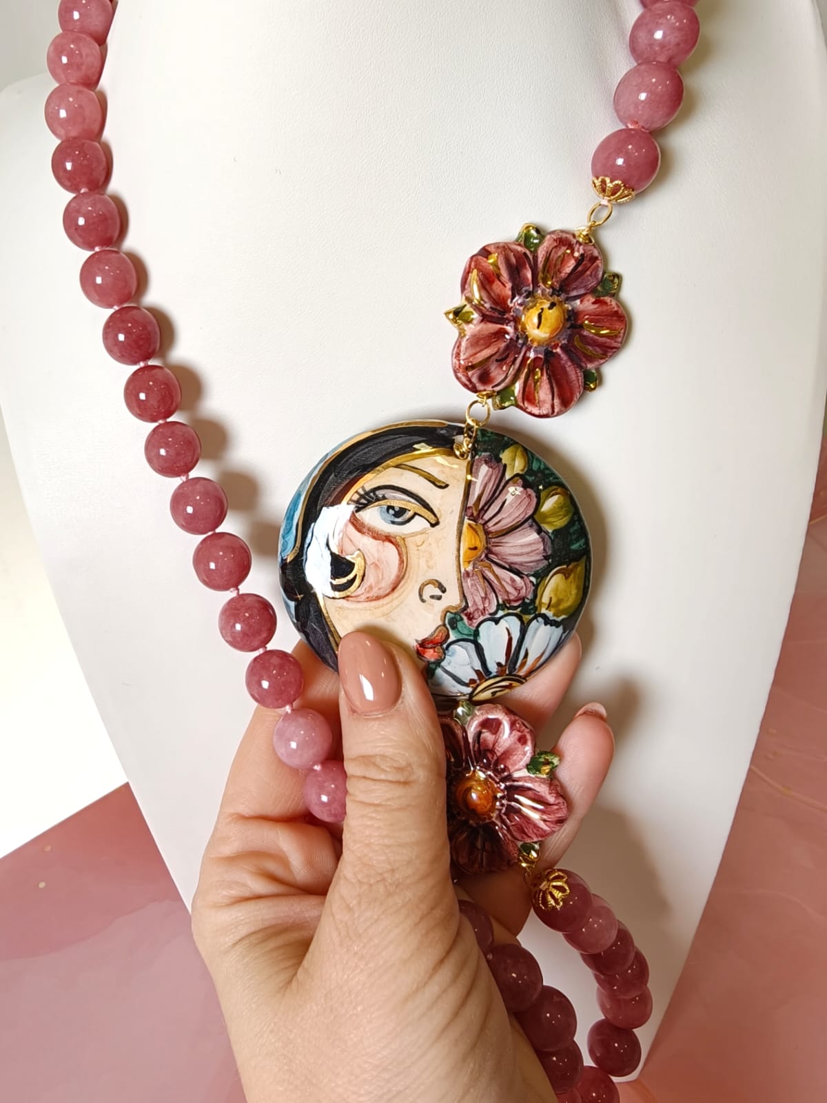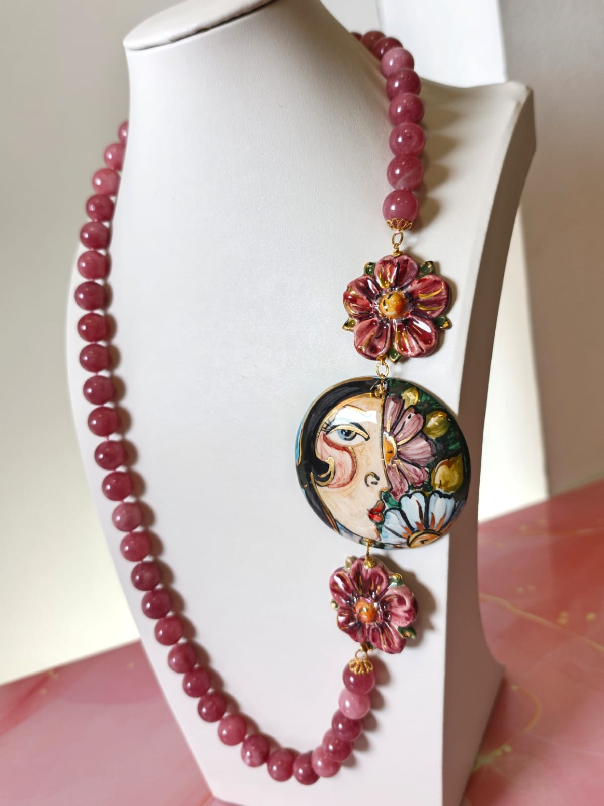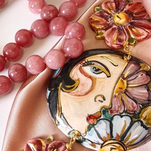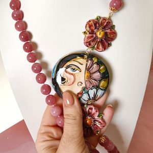 Il punto focale della collana è il connettore in ceramica di Caltagirone dipinta a mano, raffigurante un volto di donna arricchito da motivi floreali. Le pennellate sono morbide e i colori caldi. Inoltre, la smaltatura dona profondità e luminosità alla decorazione.