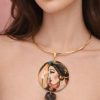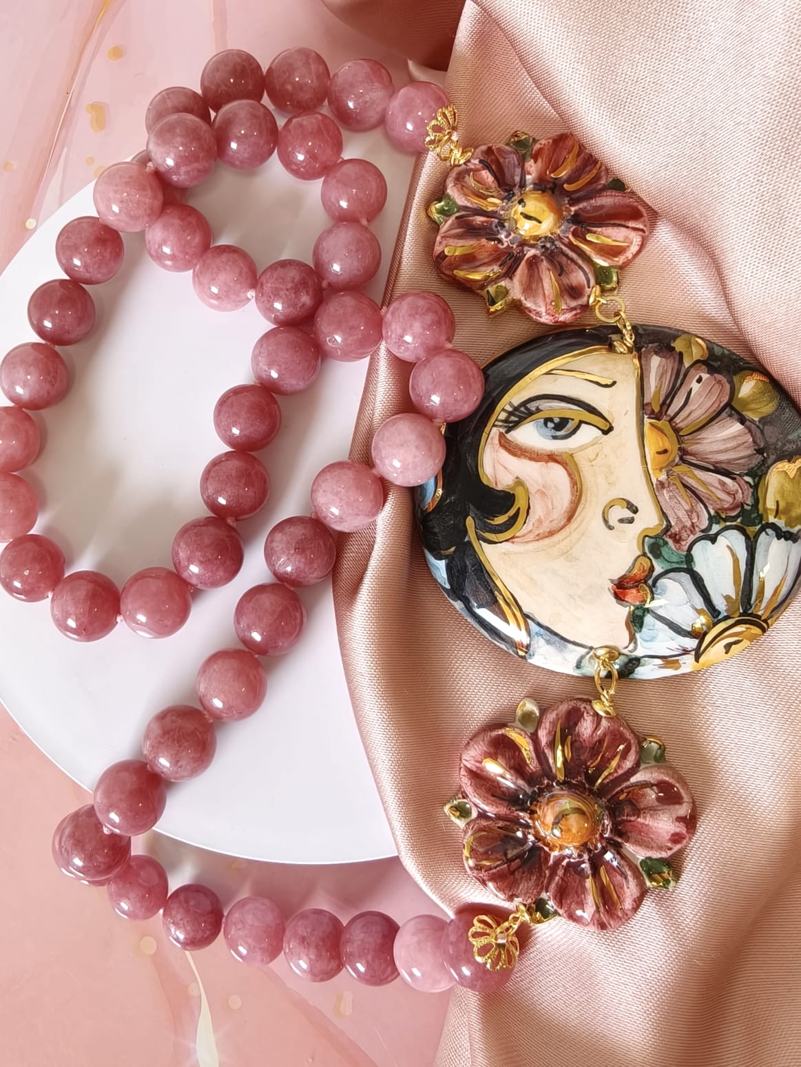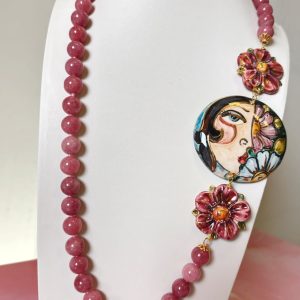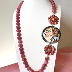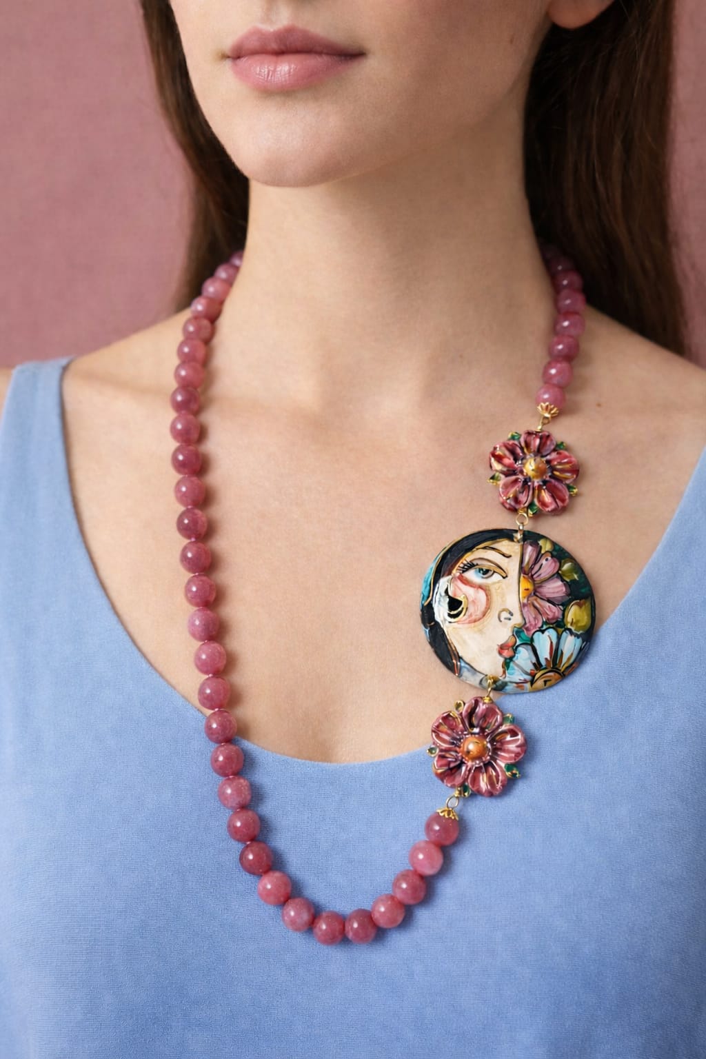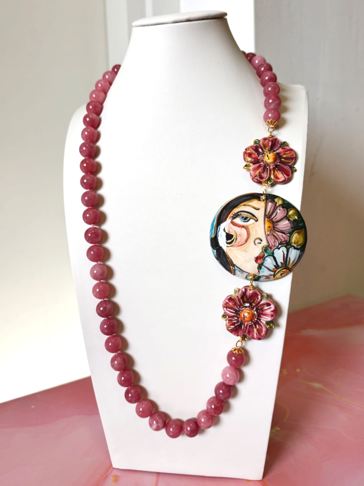 Il punto focale della collana è il connettore in ceramica di Caltagirone dipinta a mano, raffigurante un volto di donna arricchito da motivi floreali. Le pennellate sono morbide e i colori caldi. Inoltre, la smaltatura dona profondità e luminosità alla decorazione.