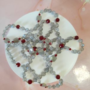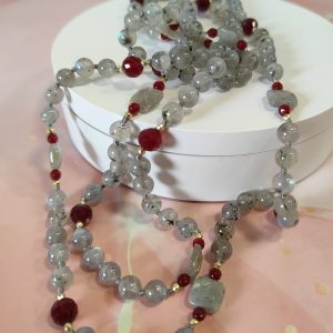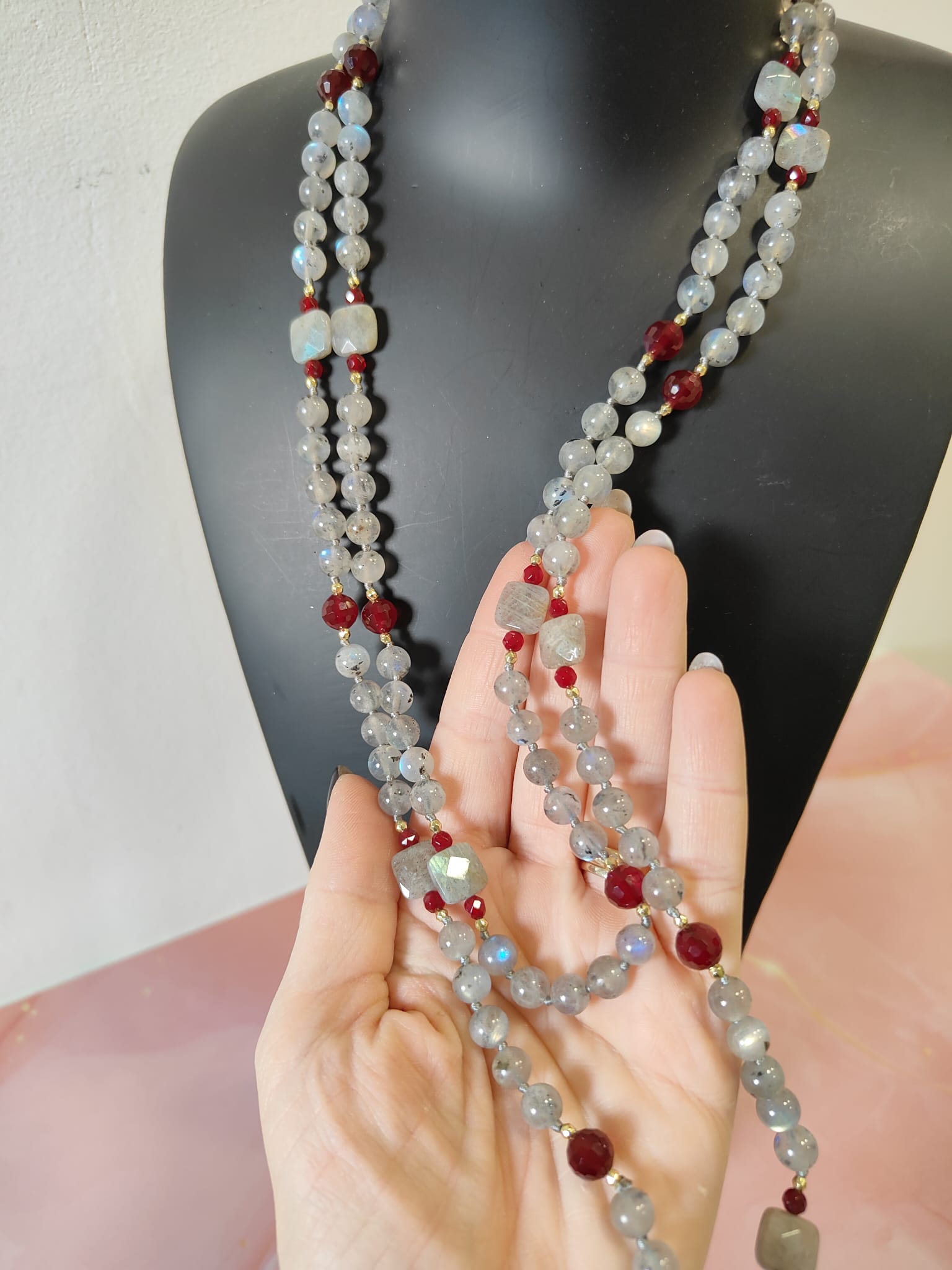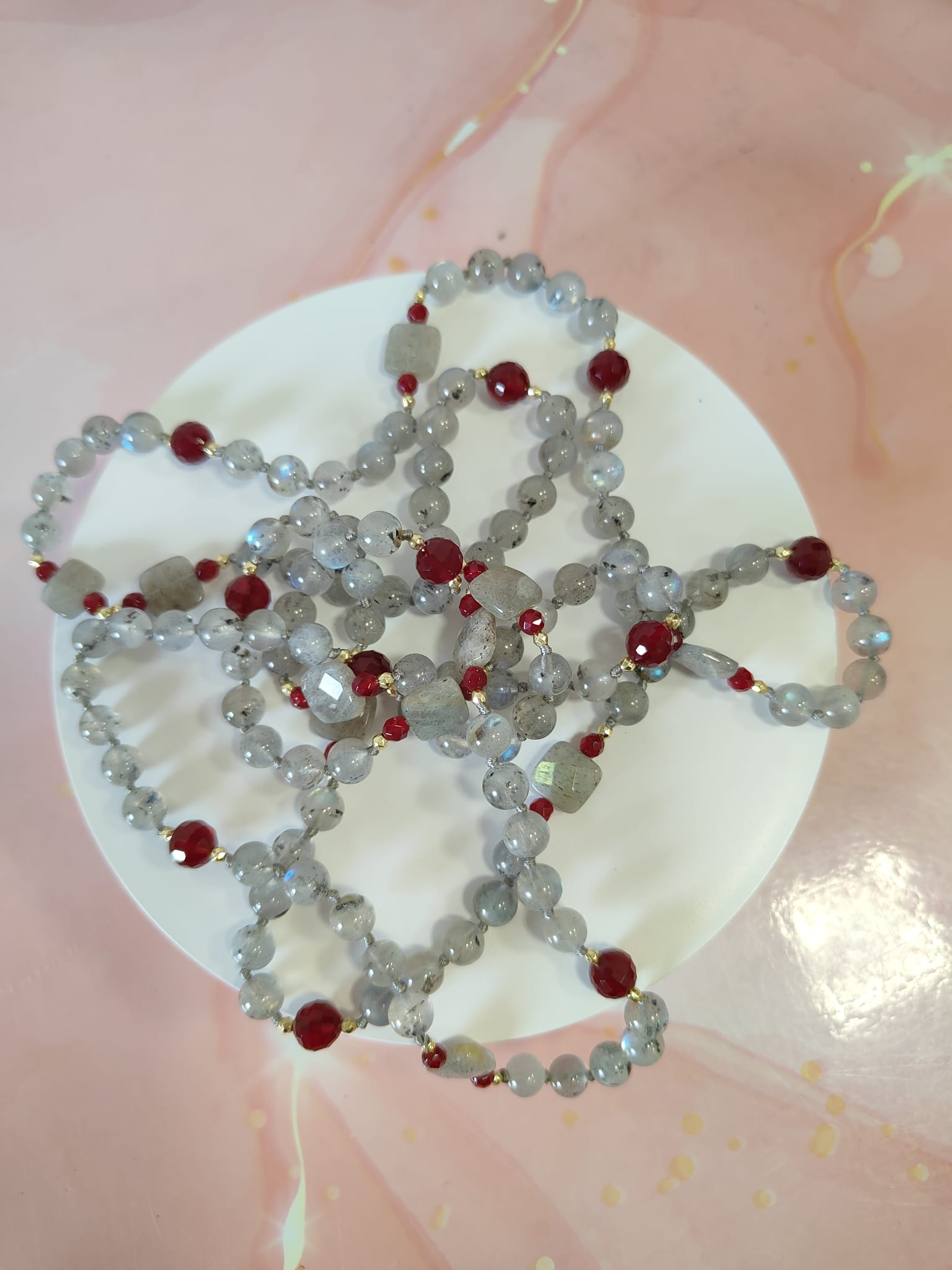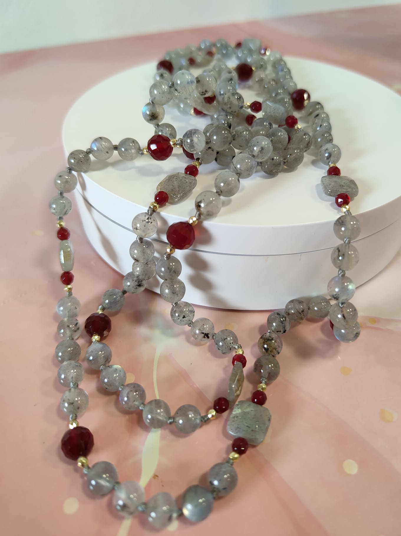 Le perle di labradorite mostrano riflessi cangianti, con lampi blu e grigi che emergono a ogni movimento. Accanto a queste, le sfere in agata borgogna aggiungono una nota intensa e profonda. I piccoli elementi in ematite dorata, inoltre, portano una brillantezza metallica discreta. Insieme, tutte queste pietre creano un equilibrio elegante tra toni freddi e accenti caldi.