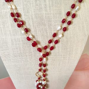 l’essenza di questo gioiello è presentata da una combinazione calda e vibrante di agata rossa, dal colore intenso e brillante, unita alla delicatezza delle perle naturali. L’alternanza regolare delle pietre crea un ritmo visivo elegante, arricchito da punti luce bianchi che donano equilibrio e armonia alla composizione.