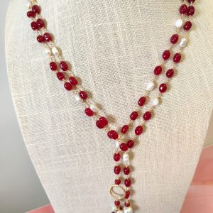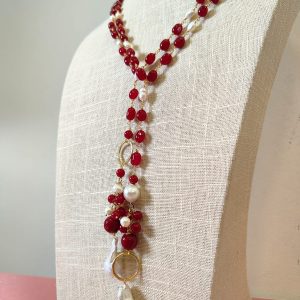 La Collana Lariat Agata Rossa è una creazione dal carattere deciso e luminoso, perfetta per chi ama i gioielli scenografici ma eleganti. Realizzata come modello lariat, è priva di chiusura e si indossa con facilità lasciando ricadere i due pendenti in modo naturale ed equilibrato. Il montaggio è eseguito completamente a rosario con un filo dorato in ottone, lavorato artigianalmente per conferire morbidezza, armonia e resistenza all’intera struttura.