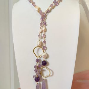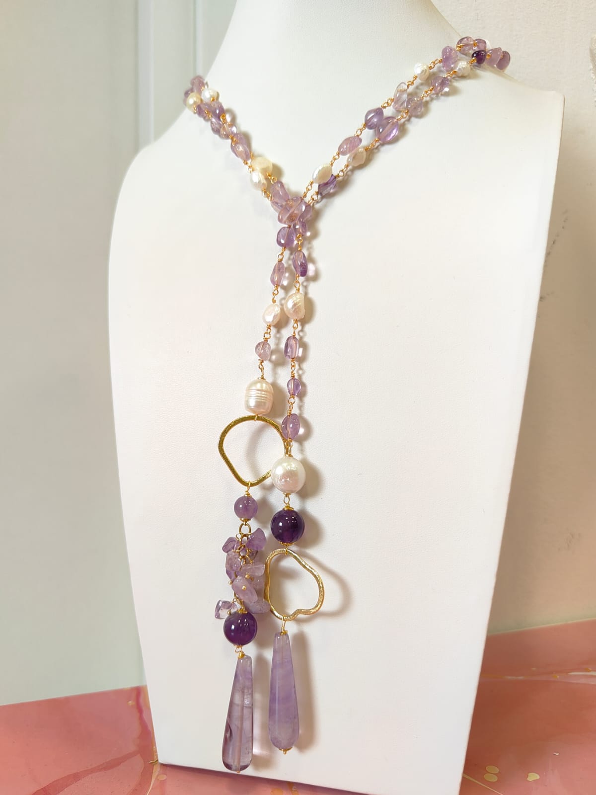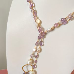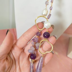 La frase chiave collana lariat ametista lavanda cattura perfettamente l’essenza di questo gioiello: un incontro raffinato tra le sfumature viola dell’ametista e i toni più morbidi e lattiginosi dell’ametista lavanda. Le perle naturali aggiungono un tocco luminoso e femminile, mentre la catena dorata incornicia i colori freddi delle pietre, creando un contrasto elegante e contemporaneo.