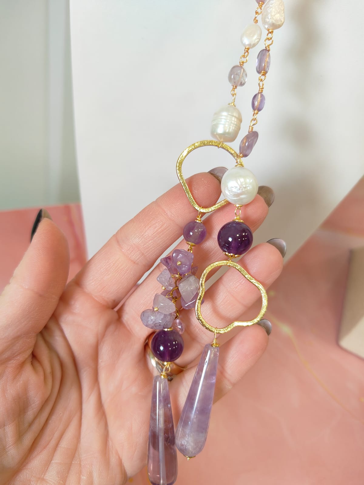 I ciondoli pendenti sono composti da cerchi irregolari in ottone dorato martellato, sfere di ametista viola intensa, frammenti naturali di ametista lavanda e due gocce lunghe sfaccettate che scendono in modo leggero e slanciato, contribuendo a un effetto finale raffinato e molto chic. Il design asimmetrico dona dinamismo al gioiello e permette di indossarlo sia con outfit semplici, per un tocco ricercato, sia con abiti più eleganti.
