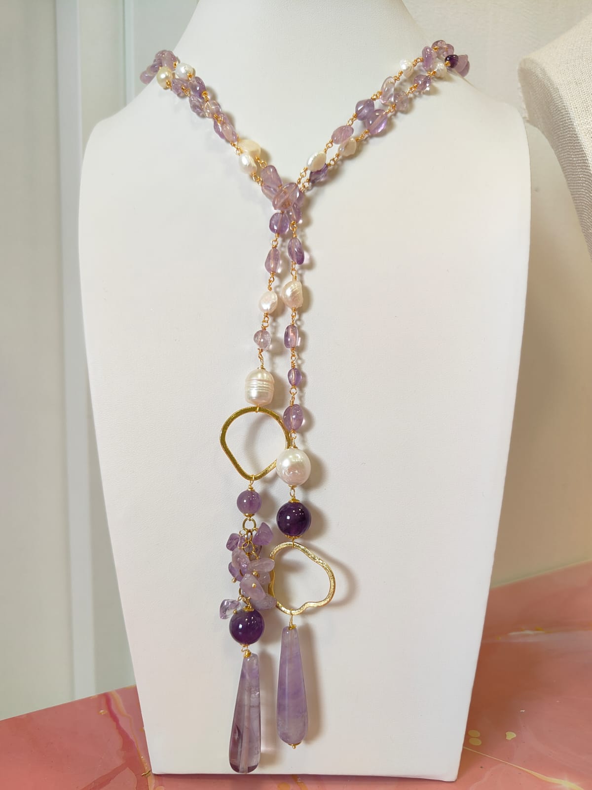 La frase chiave collana lariat ametista lavanda cattura perfettamente l’essenza di questo gioiello: un incontro raffinato tra le sfumature viola dell’ametista e i toni più morbidi e lattiginosi dell’ametista lavanda. Le perle naturali aggiungono un tocco luminoso e femminile, mentre la catena dorata incornicia i colori freddi delle pietre, creando un contrasto elegante e contemporaneo.