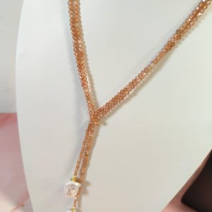 Realizzata interamente a mano, unisce la brillantezza dei zirconi color pesca alla naturale irregolarità delle perle barocche, in un equilibrio di forme e tonalità che esprime femminilità e armonia.