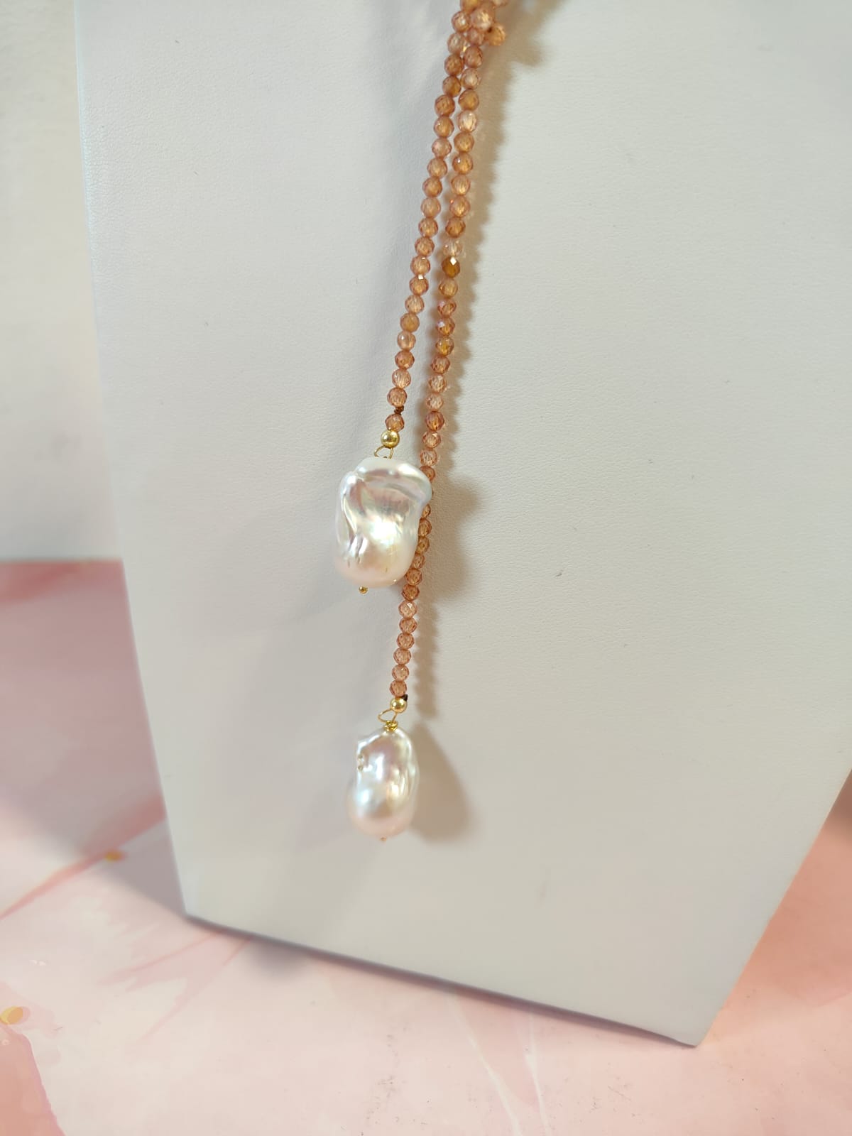 Materiali: zirconi color pesca, perle barocche naturali, inserti in argento dorato.