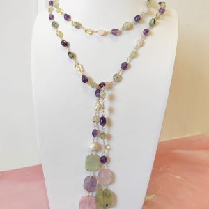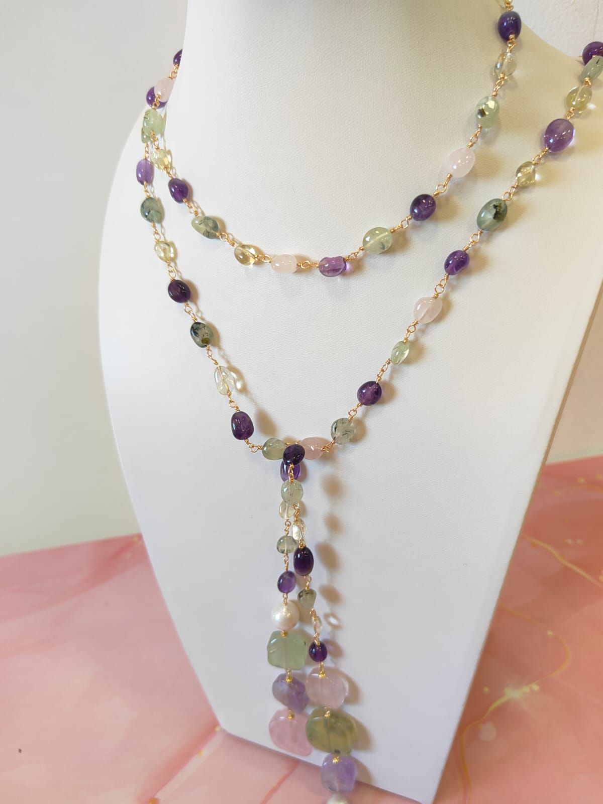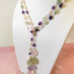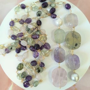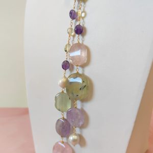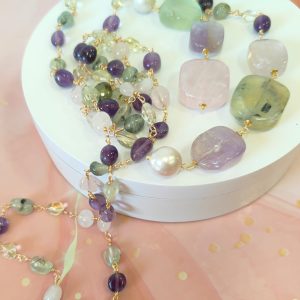 Pietre: ametista naturale, quarzo rosa naturale, prehnite naturale, perle d’acqua dolce