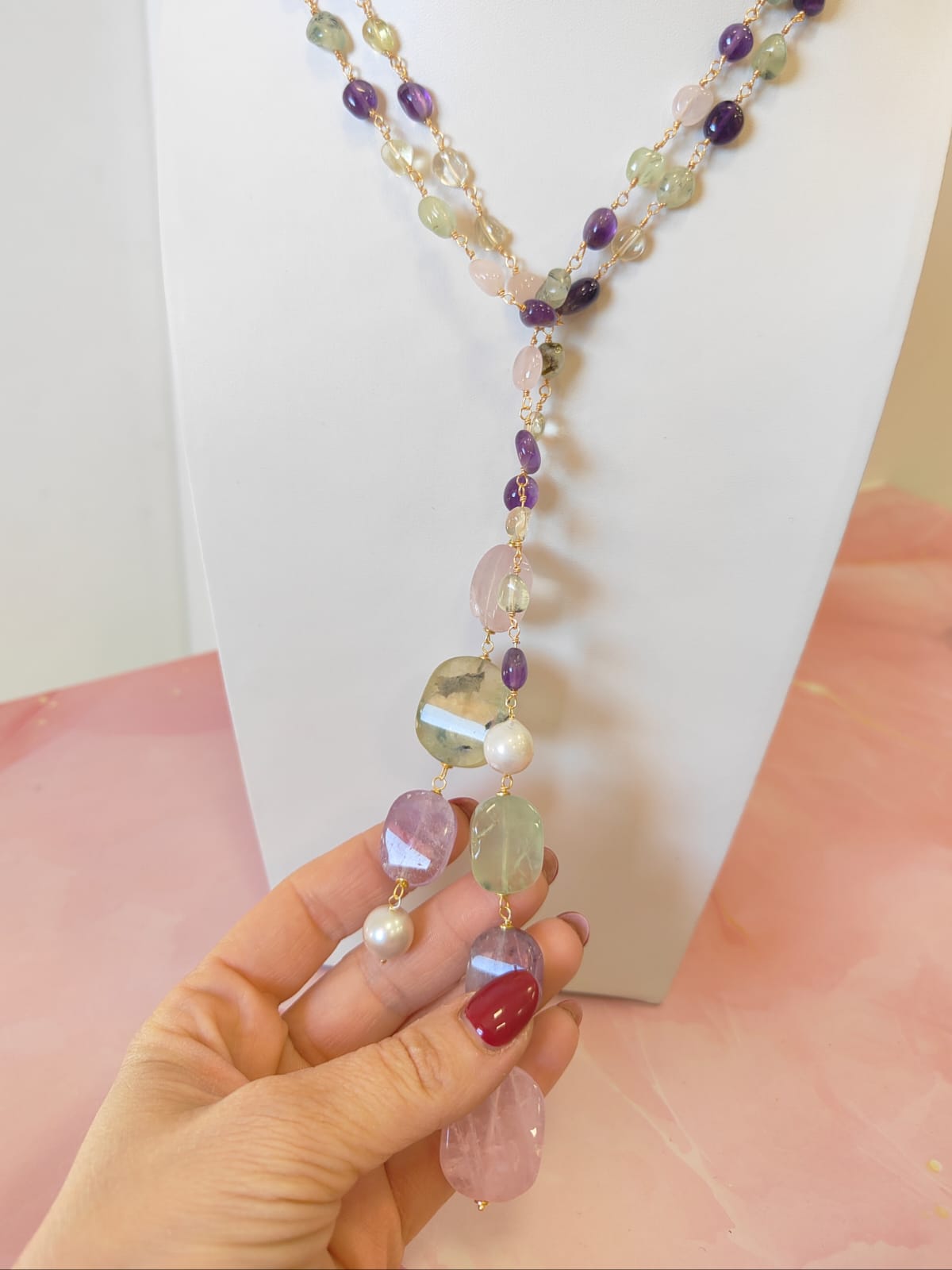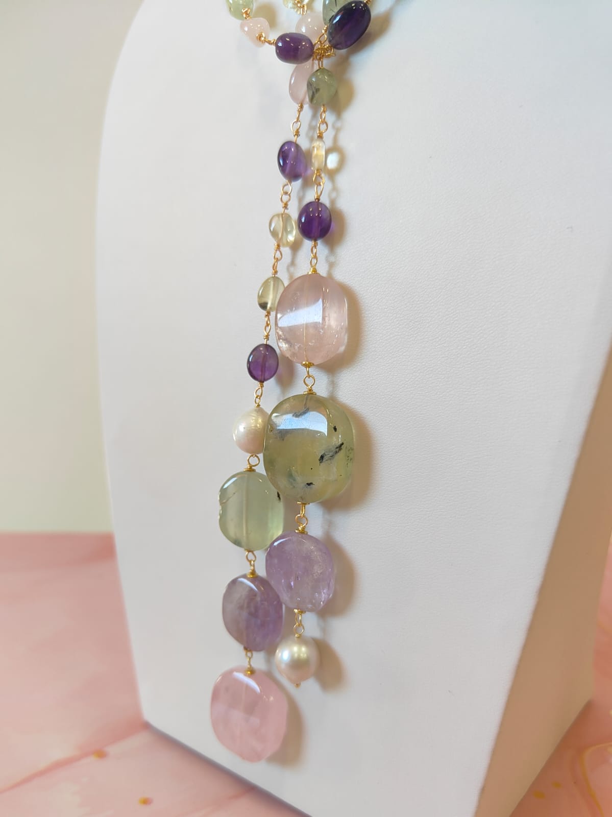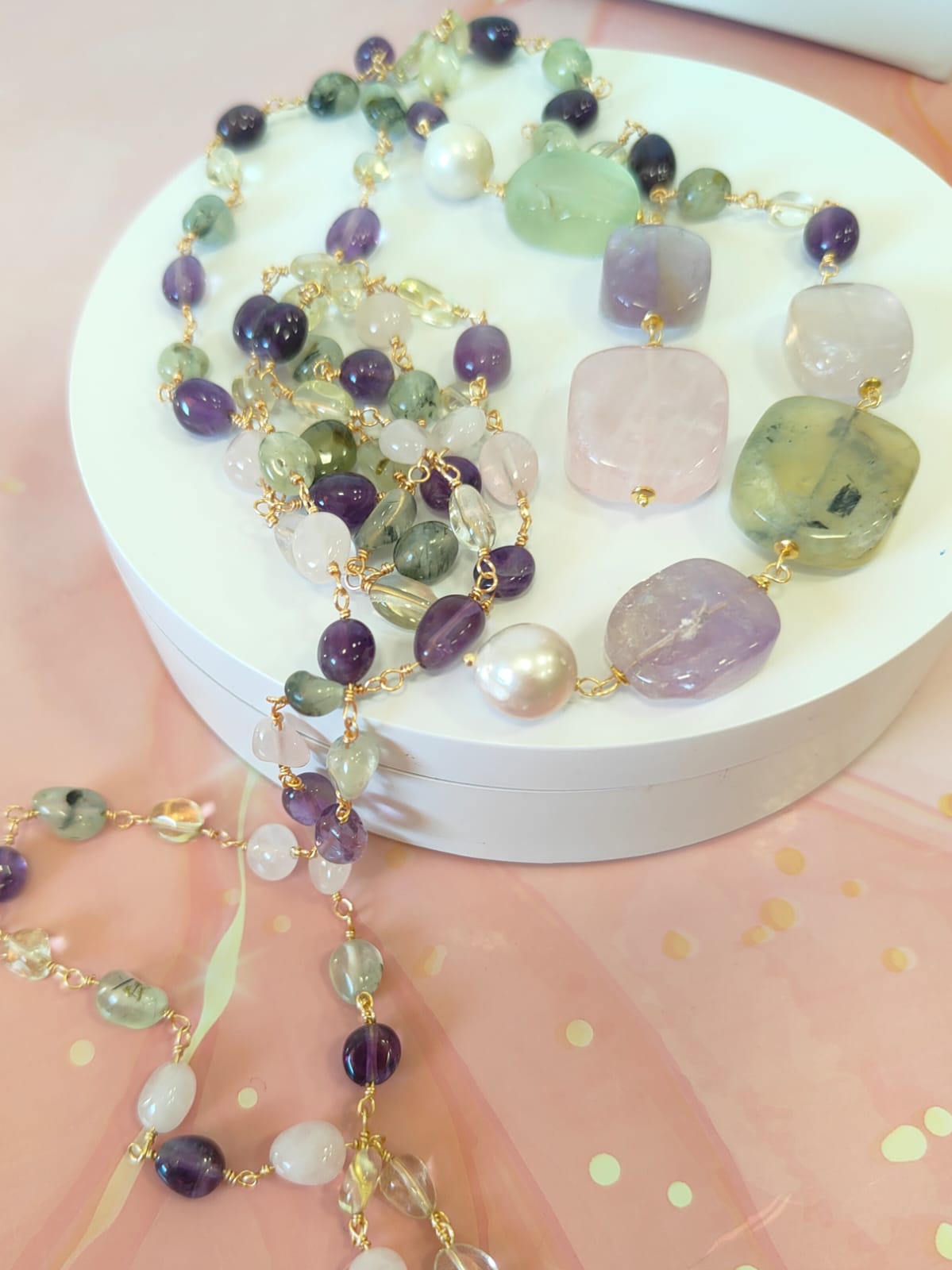 Le pietre naturali selezionate creano un’armonia cromatica delicata ma decisa. L’ametista, con le sue tonalità viola, dona profondità e carattere. Il quarzo rosa introduce una nota morbida e luminosa, mentre la prehnite, con le sue sfumature verdi e le inclusioni naturali, rende ogni elemento irripetibile. Le perle d’acqua dolce completano la composizione con punti luce eleganti e senza tempo.
