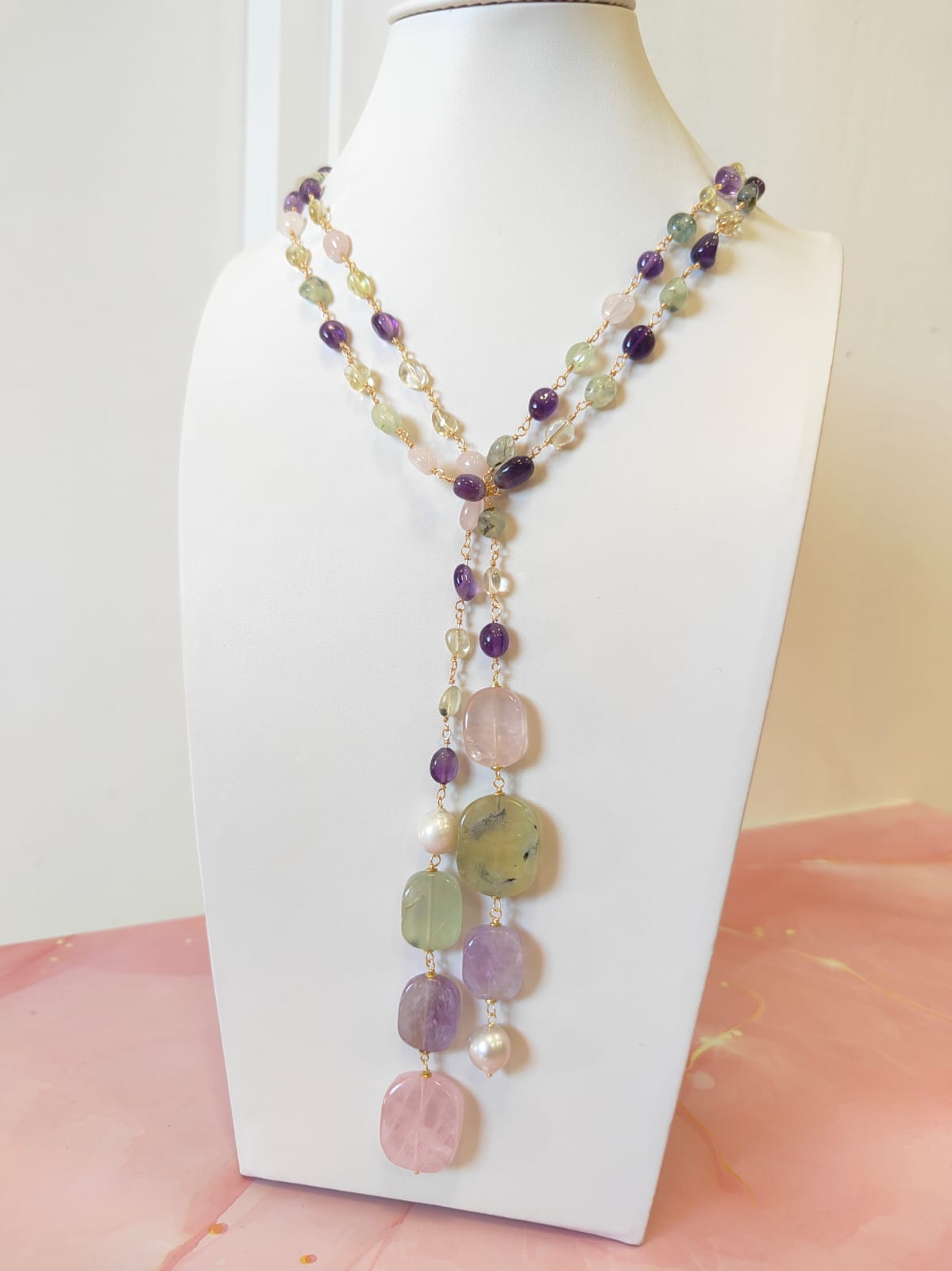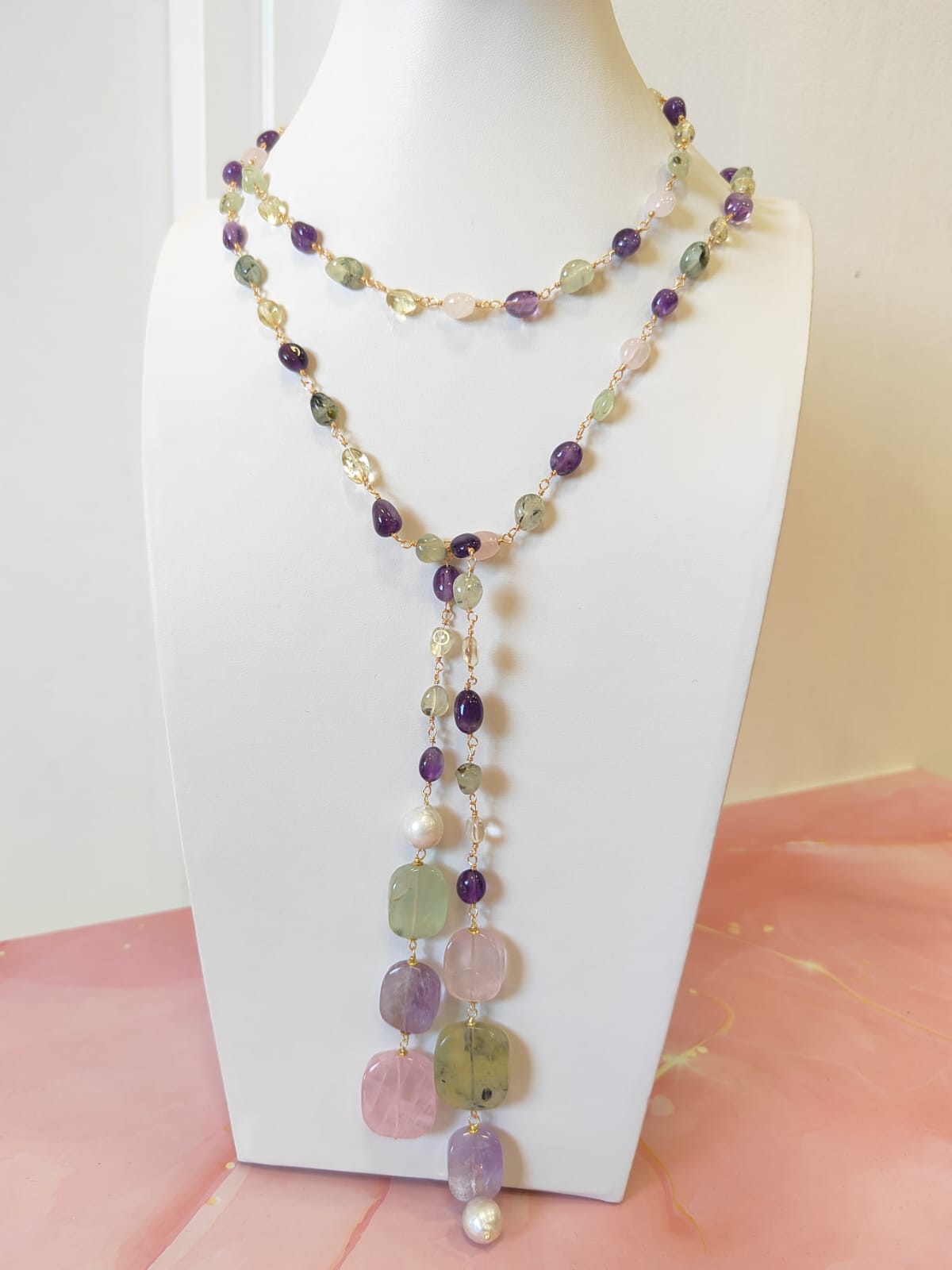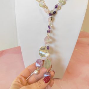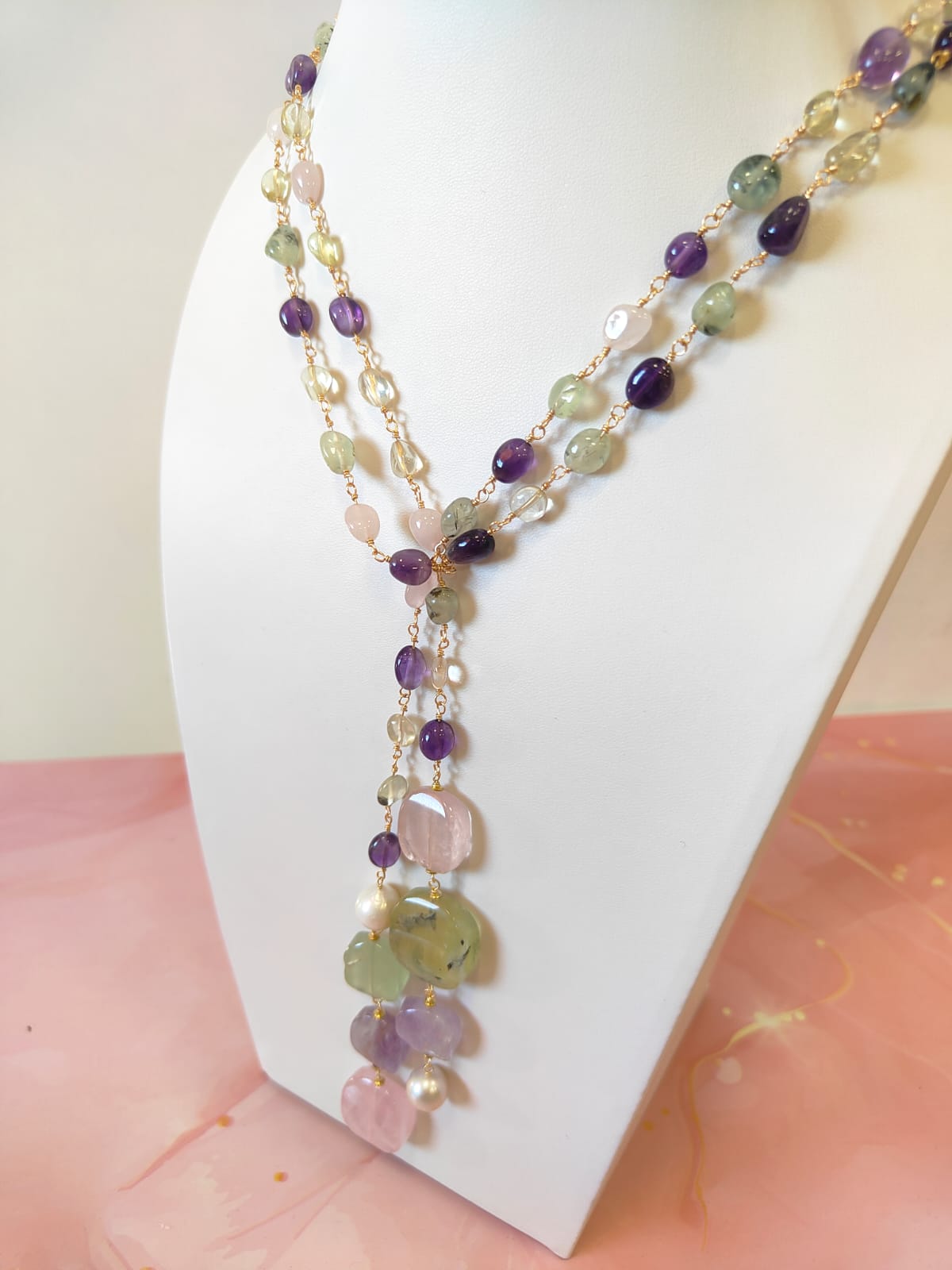 Le pietre naturali selezionate creano un’armonia cromatica delicata ma decisa. L’ametista, con le sue tonalità viola, dona profondità e carattere. Il quarzo rosa introduce una nota morbida e luminosa, mentre la prehnite, con le sue sfumature verdi e le inclusioni naturali, rende ogni elemento irripetibile. Le perle d’acqua dolce completano la composizione con punti luce eleganti e senza tempo.