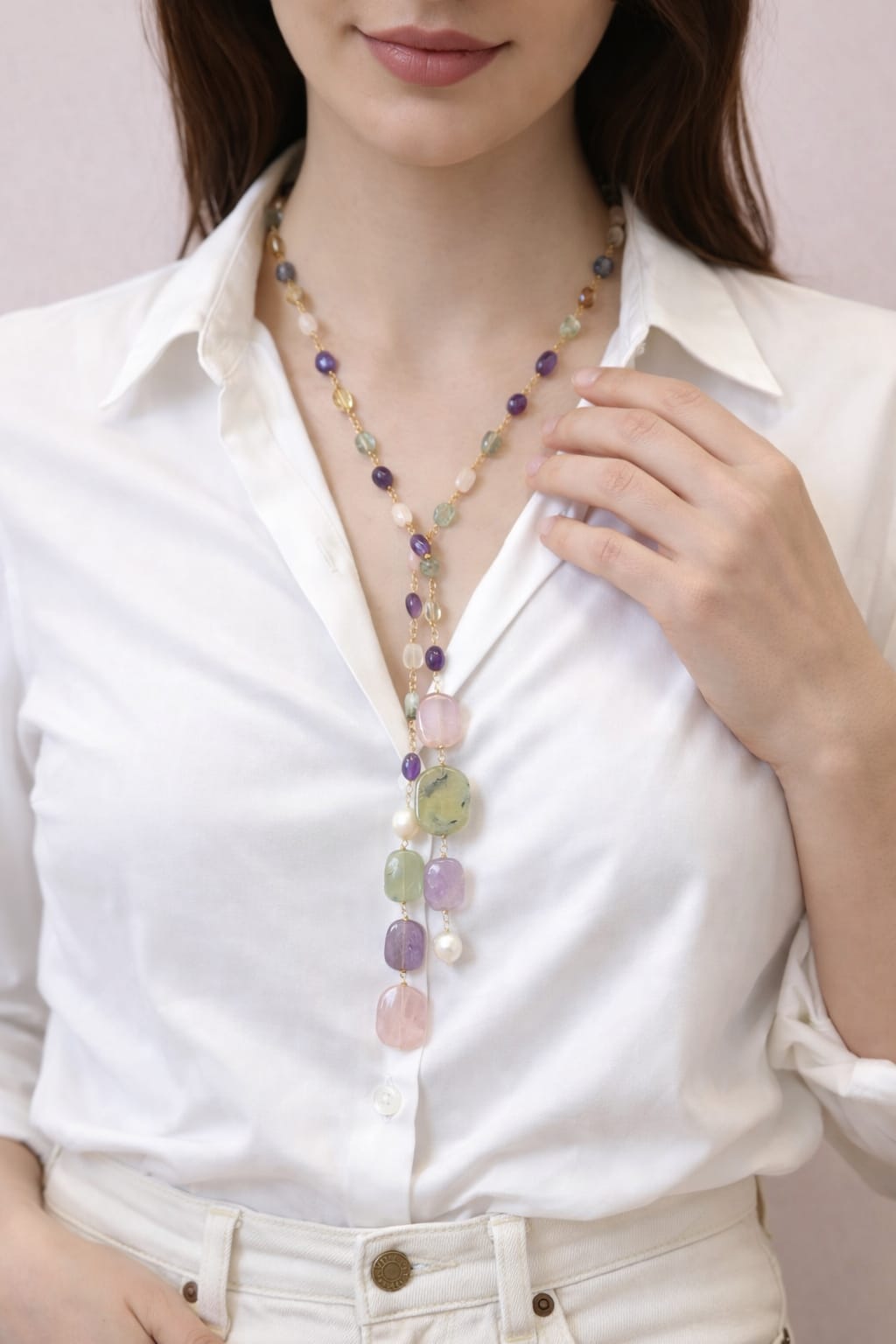 La collana lariat pietre naturali è una creazione artigianale elegante e scenografica, pensata per chi ama gioielli trasformabili e ricchi di personalità. Il suo design senza chiusura consente una libertà totale di indosso, adattandosi con naturalezza a stili diversi, dal quotidiano raffinato alle occasioni speciali.