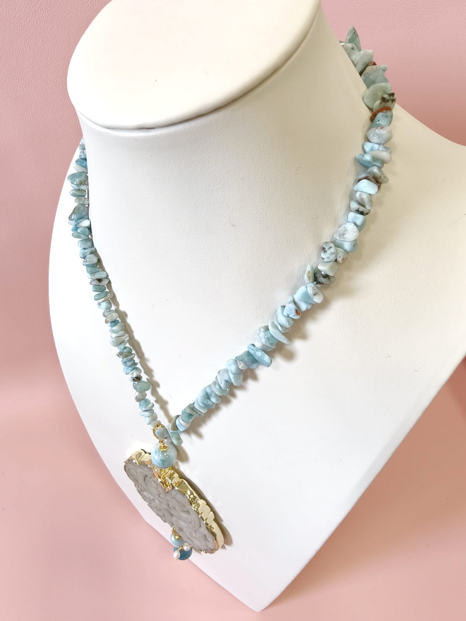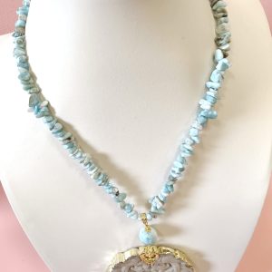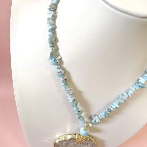 Collana Larimar E Giada Intagliata con chips naturali, grande ciondolo estraibile e dettagli dorati. Elegante e versatile, trasformabile in girocollo.