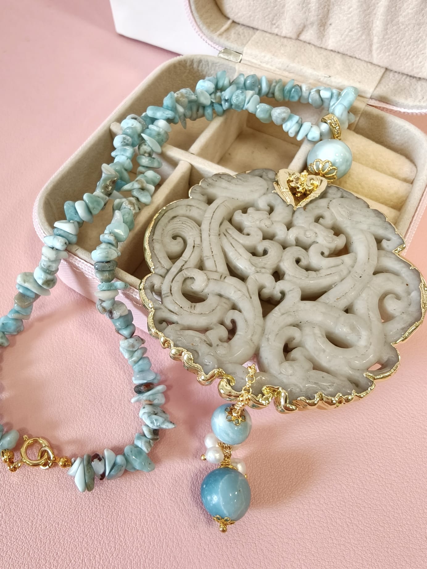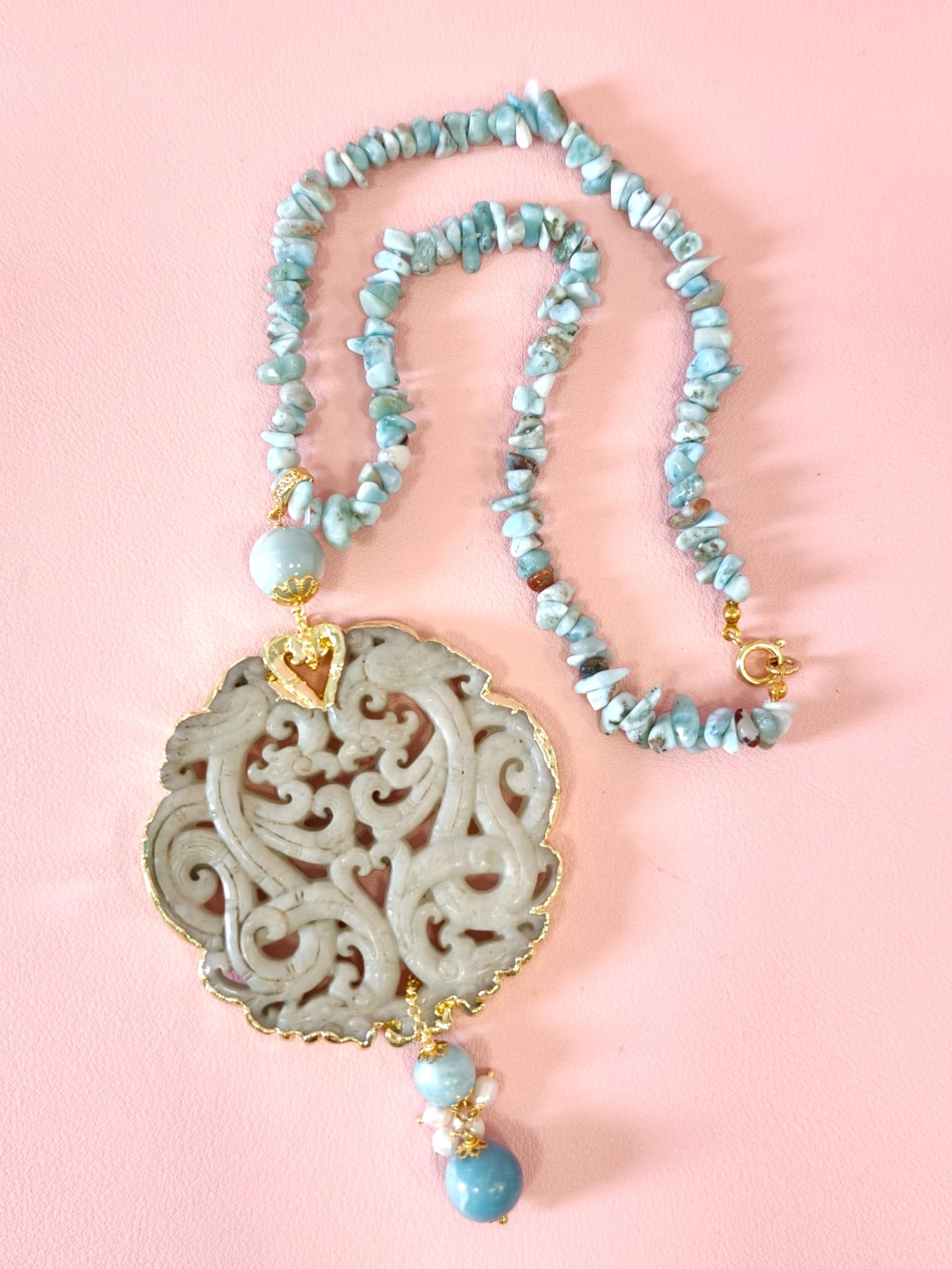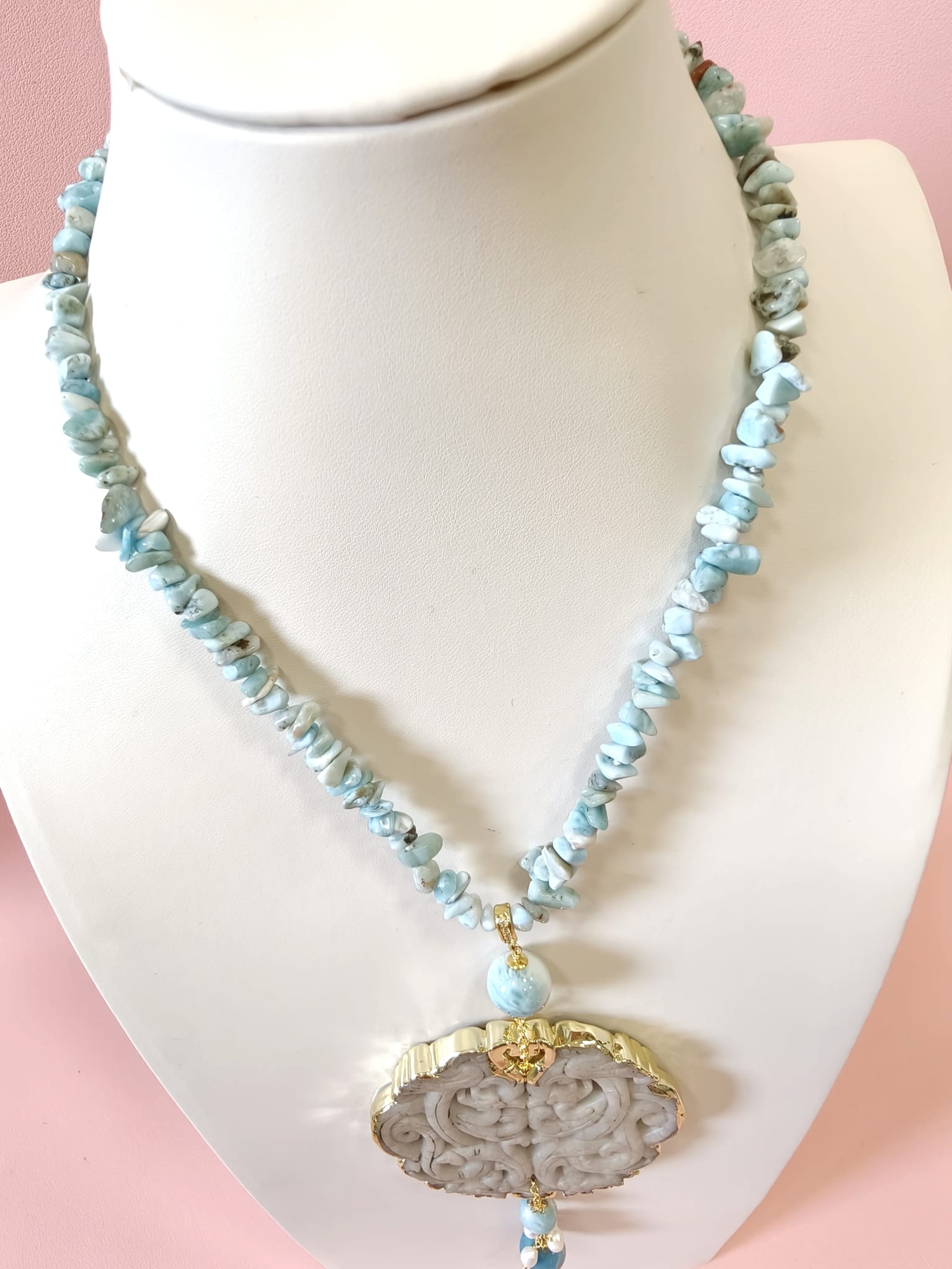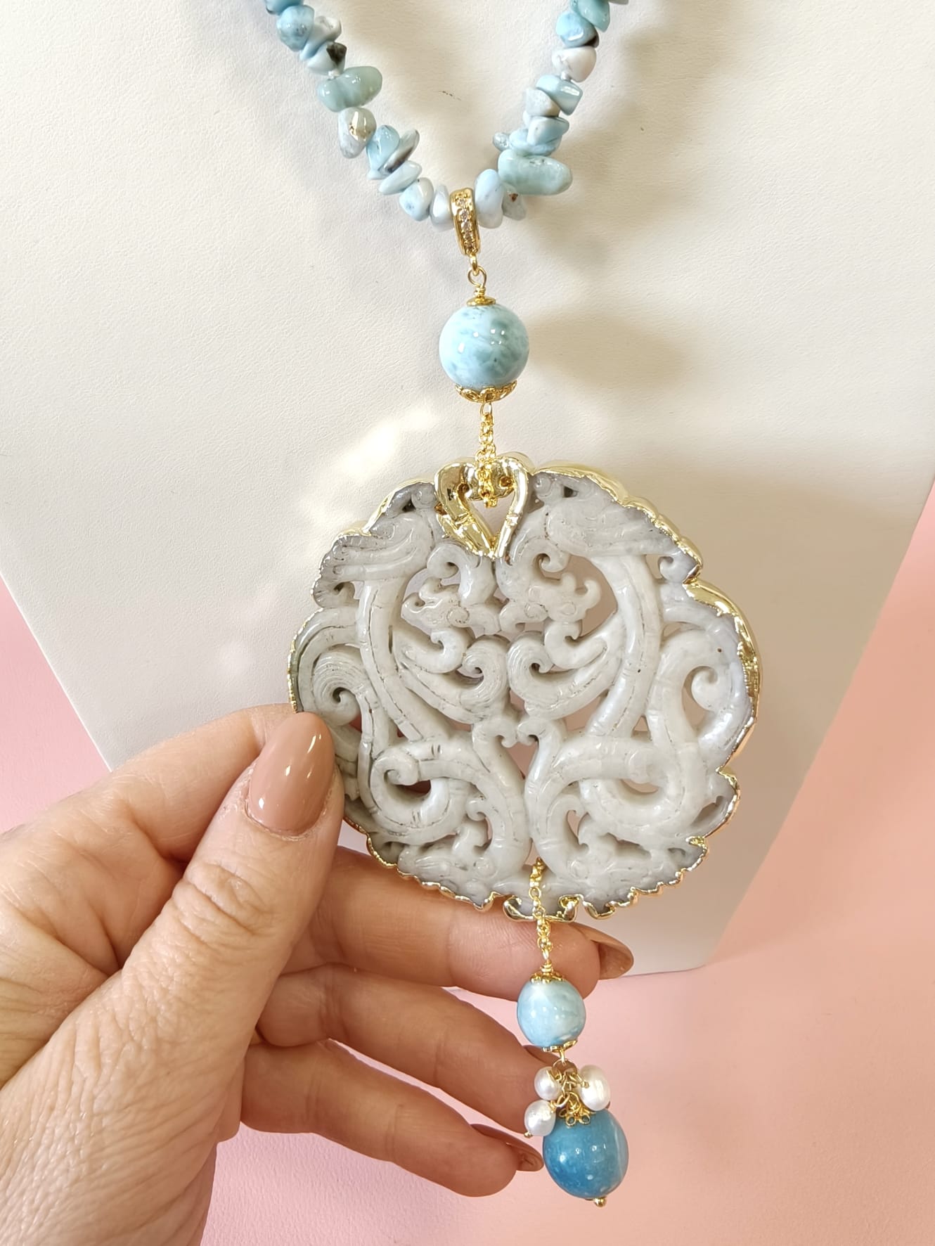 Collana Larimar E Giada Intagliata Ispirata Al Mare E Alla Luce