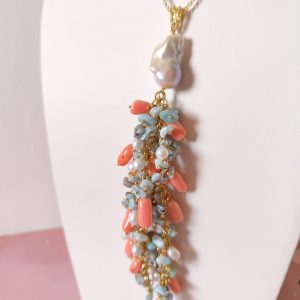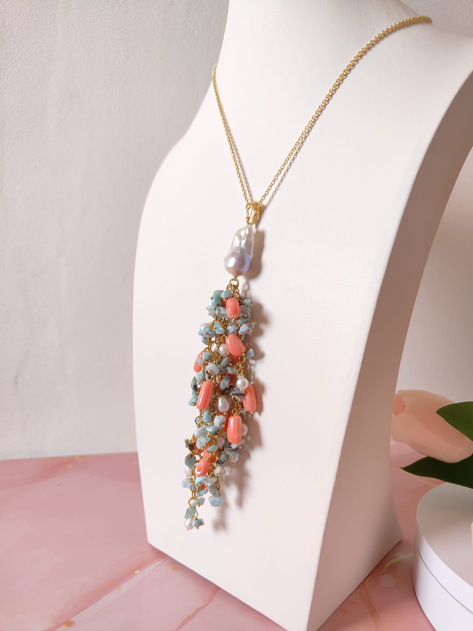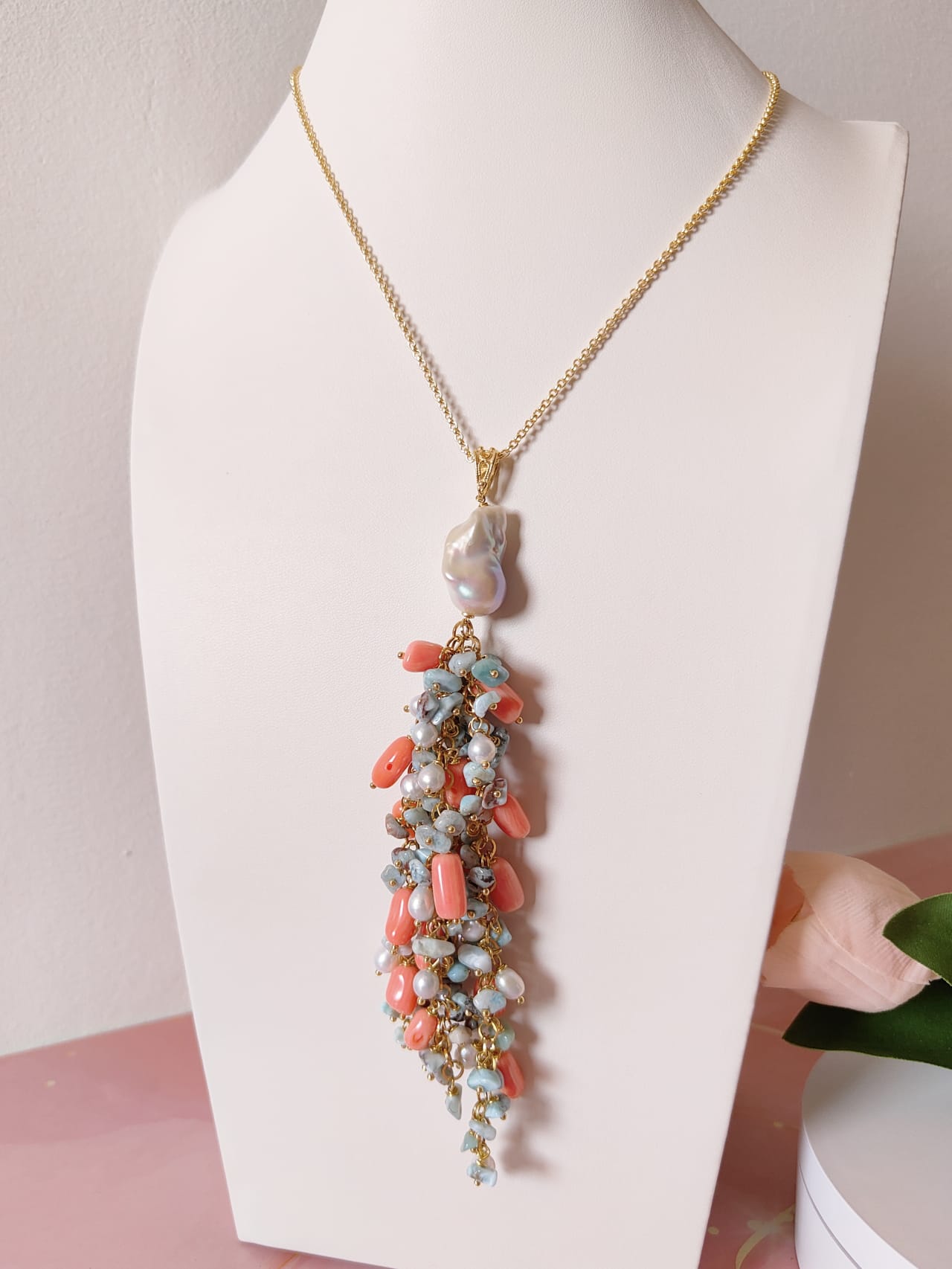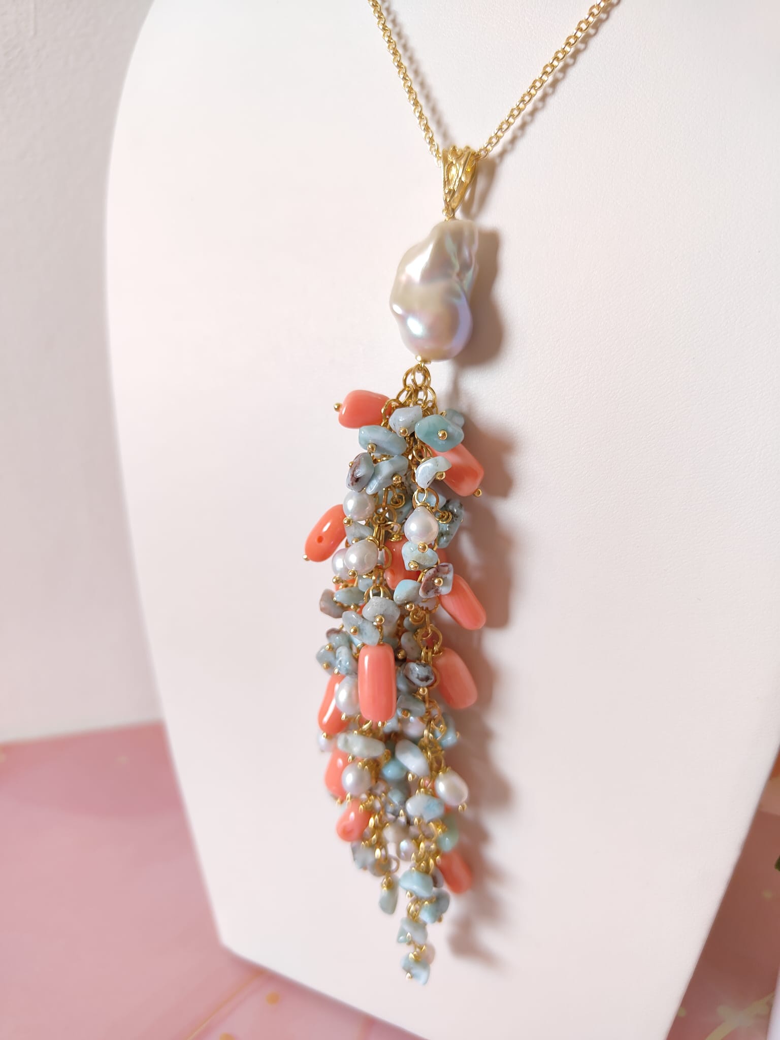 Ciondolo: perla barocca con cascata di chips di larimar, corallo bamboo color salmone e perle