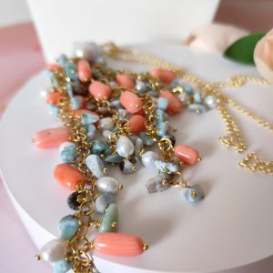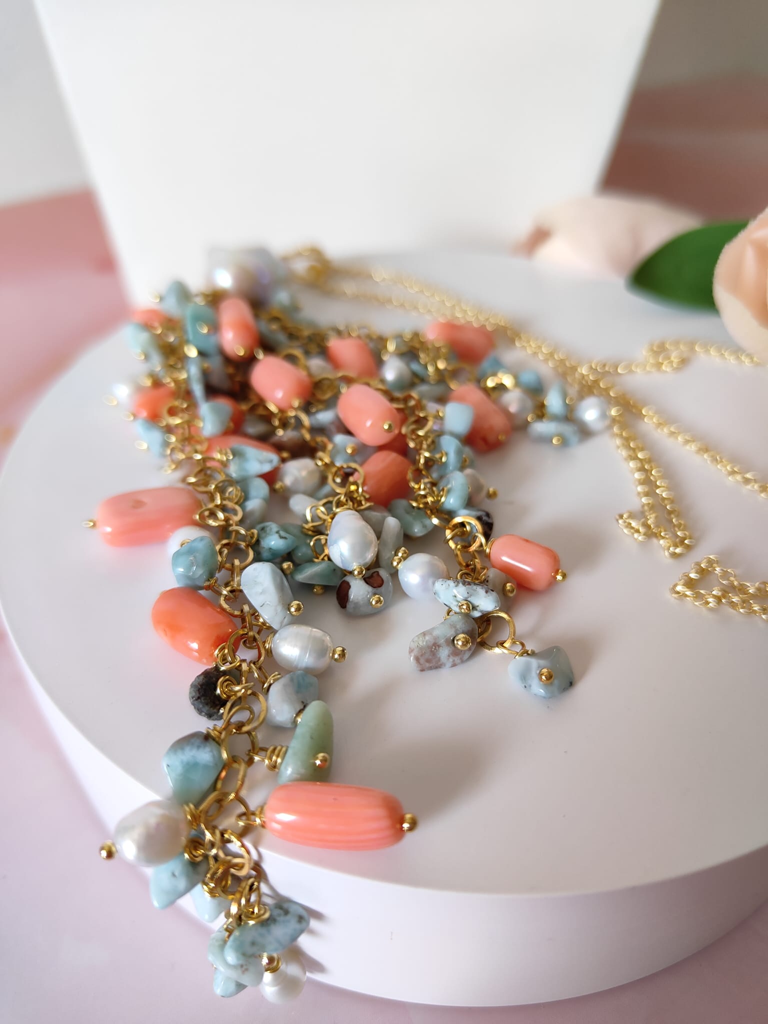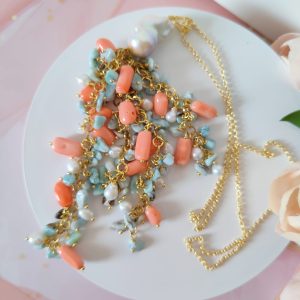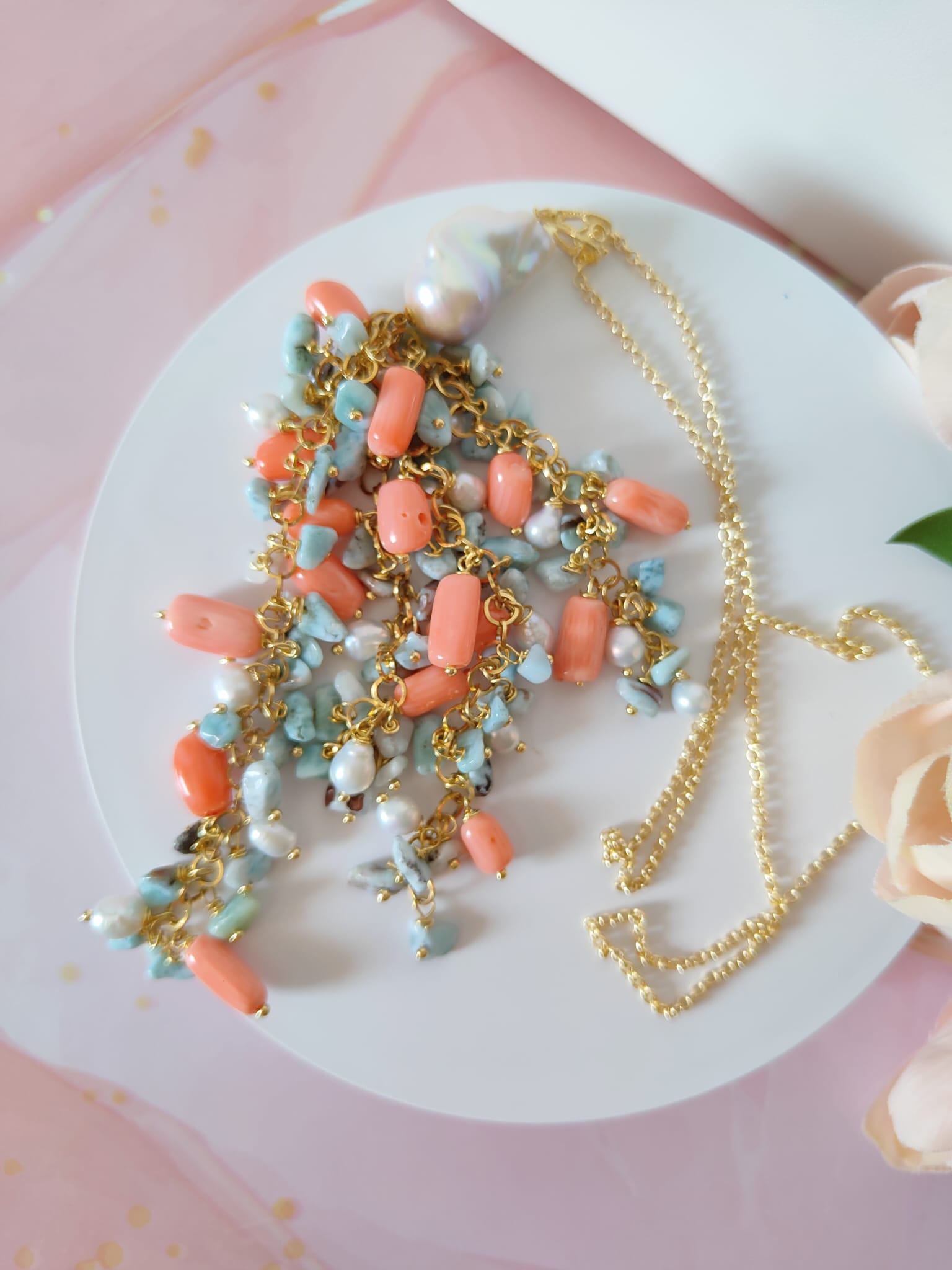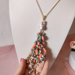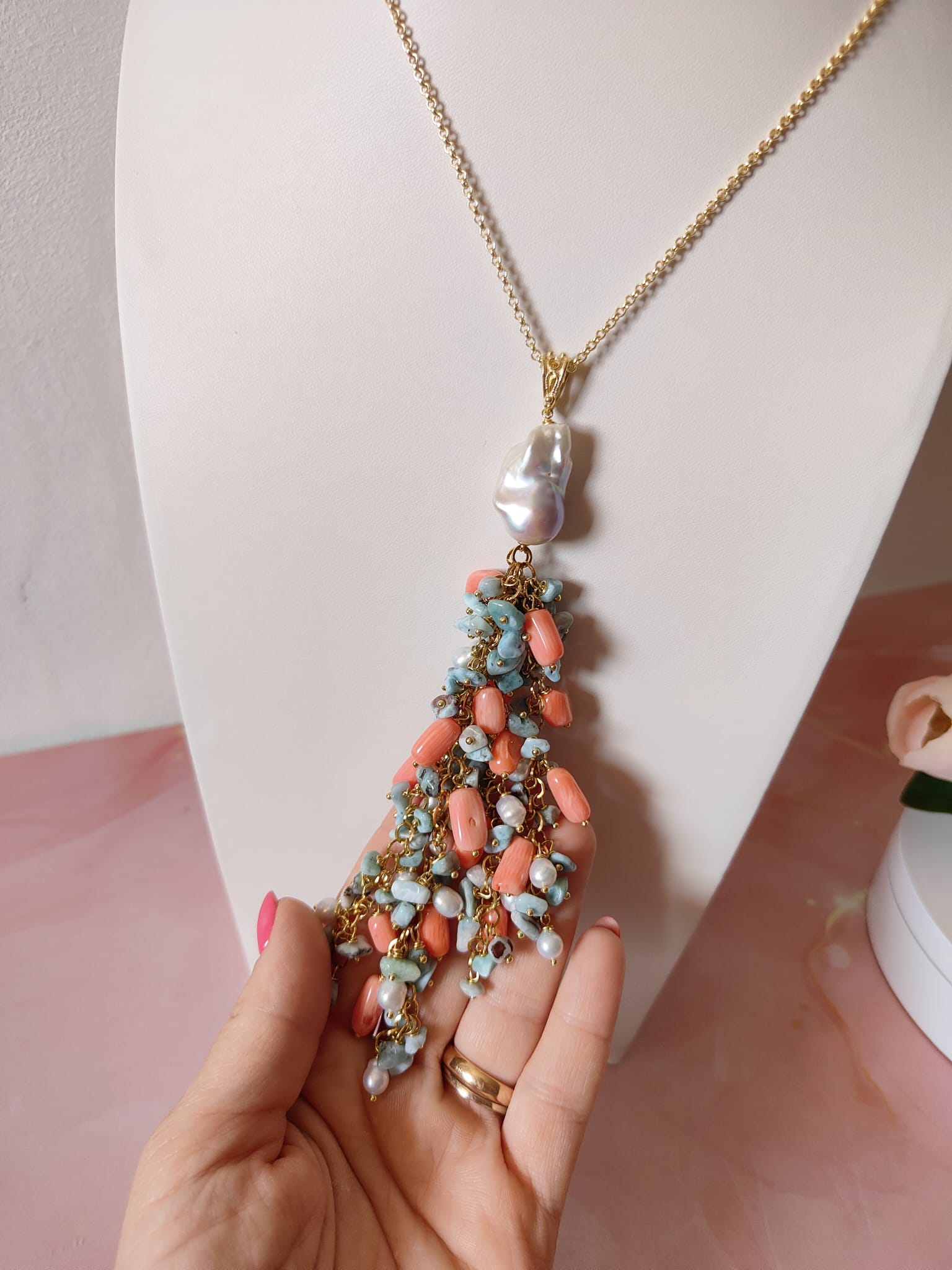Il cuore della creazione è il ciondolo con perla barocca, luminosa e irregolare, che si sposa con una cascata scenografica di chips di larimar, corallo bamboo color salmone e delicate perle naturali. Il gioco cromatico, tra l’azzurro cristallino del larimar e le sfumature calde del corallo, richiama i riflessi del mare e la vitalità delle coste mediterranee.