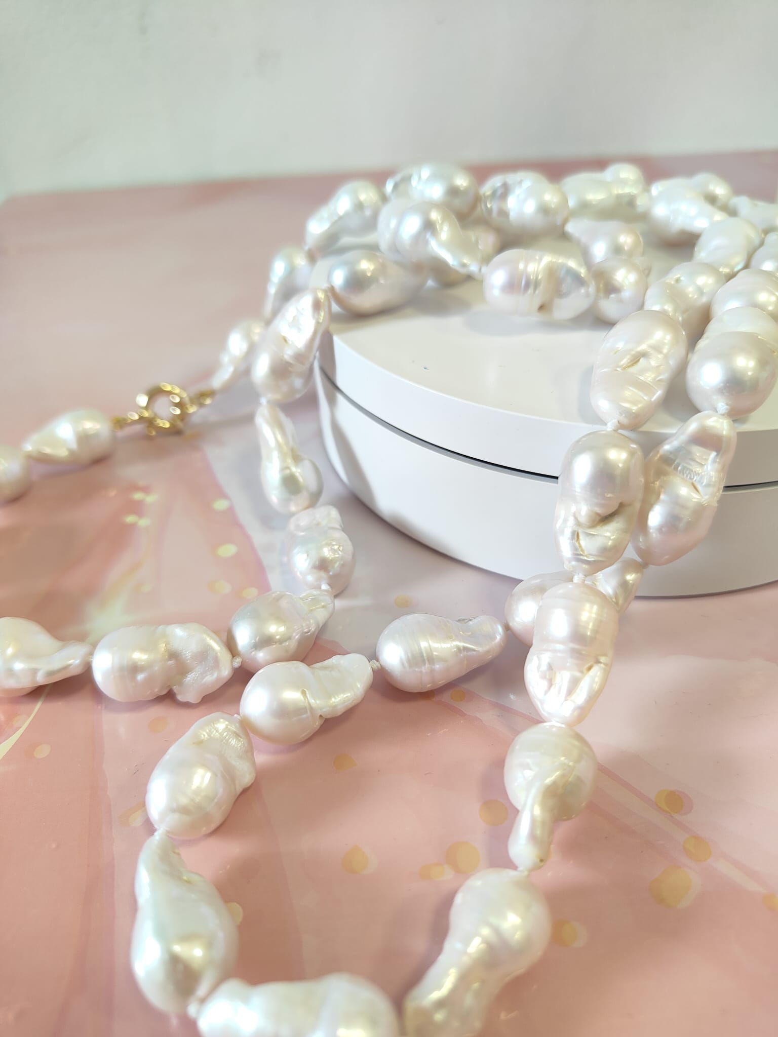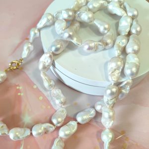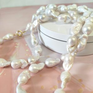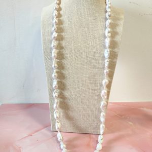 La collana lunga perle barocche è una celebrazione dell’eleganza naturale e dell’artigianato raffinato. Ogni perla, con la sua forma unica e la superficie irregolare, racconta la poesia dell’imperfezione: nessuna è identica all’altra, ma tutte insieme creano un’armonia di luce e movimento che cattura lo sguardo.