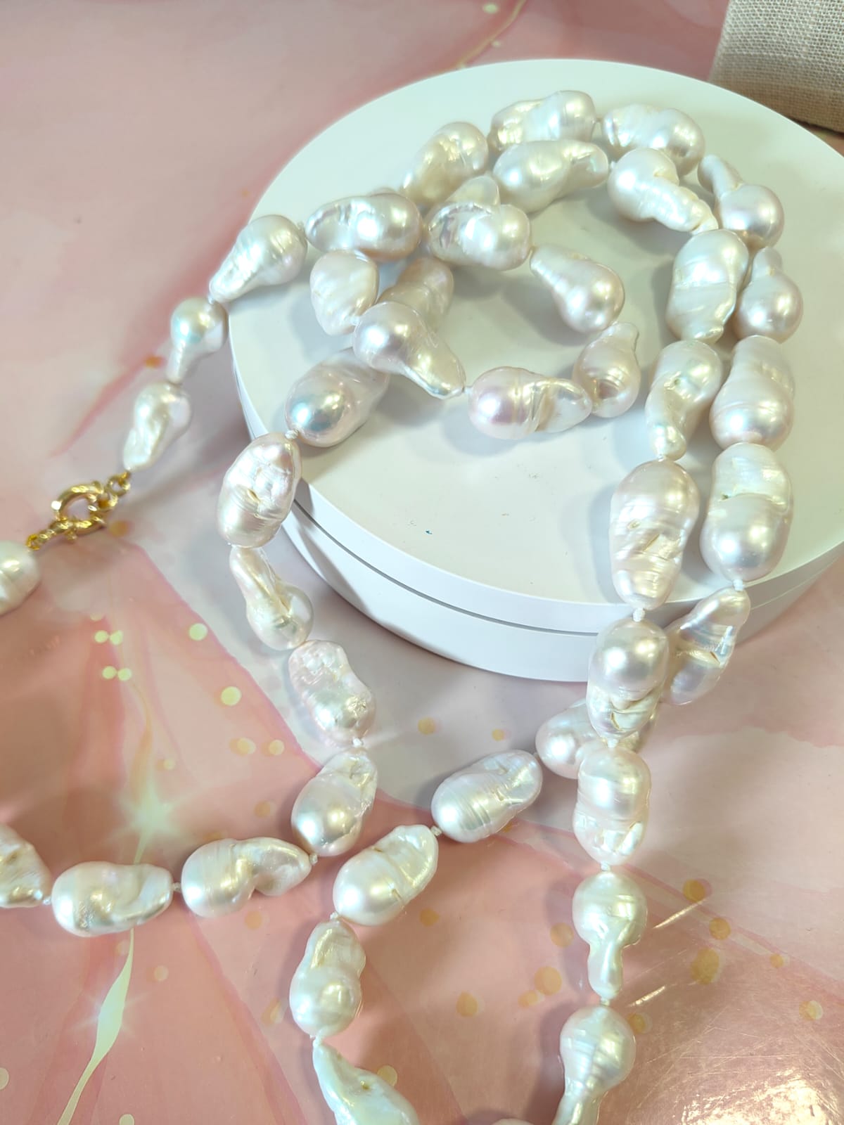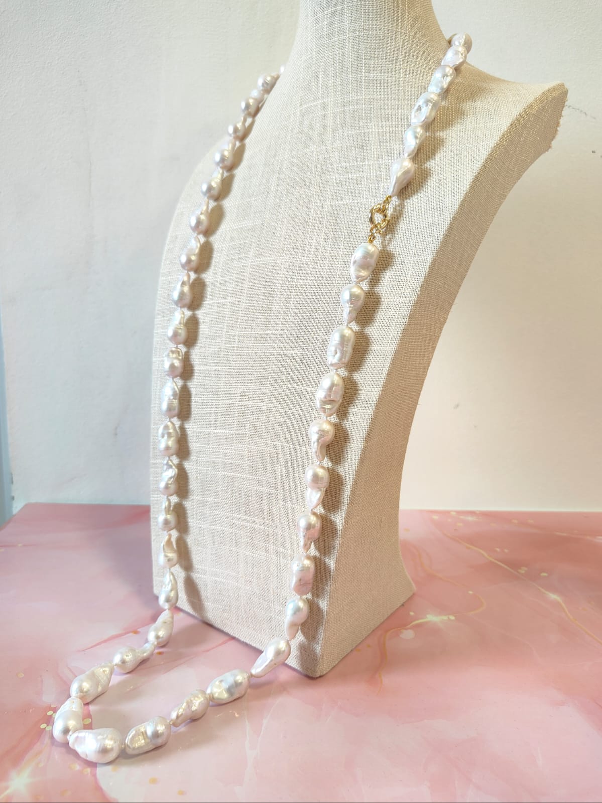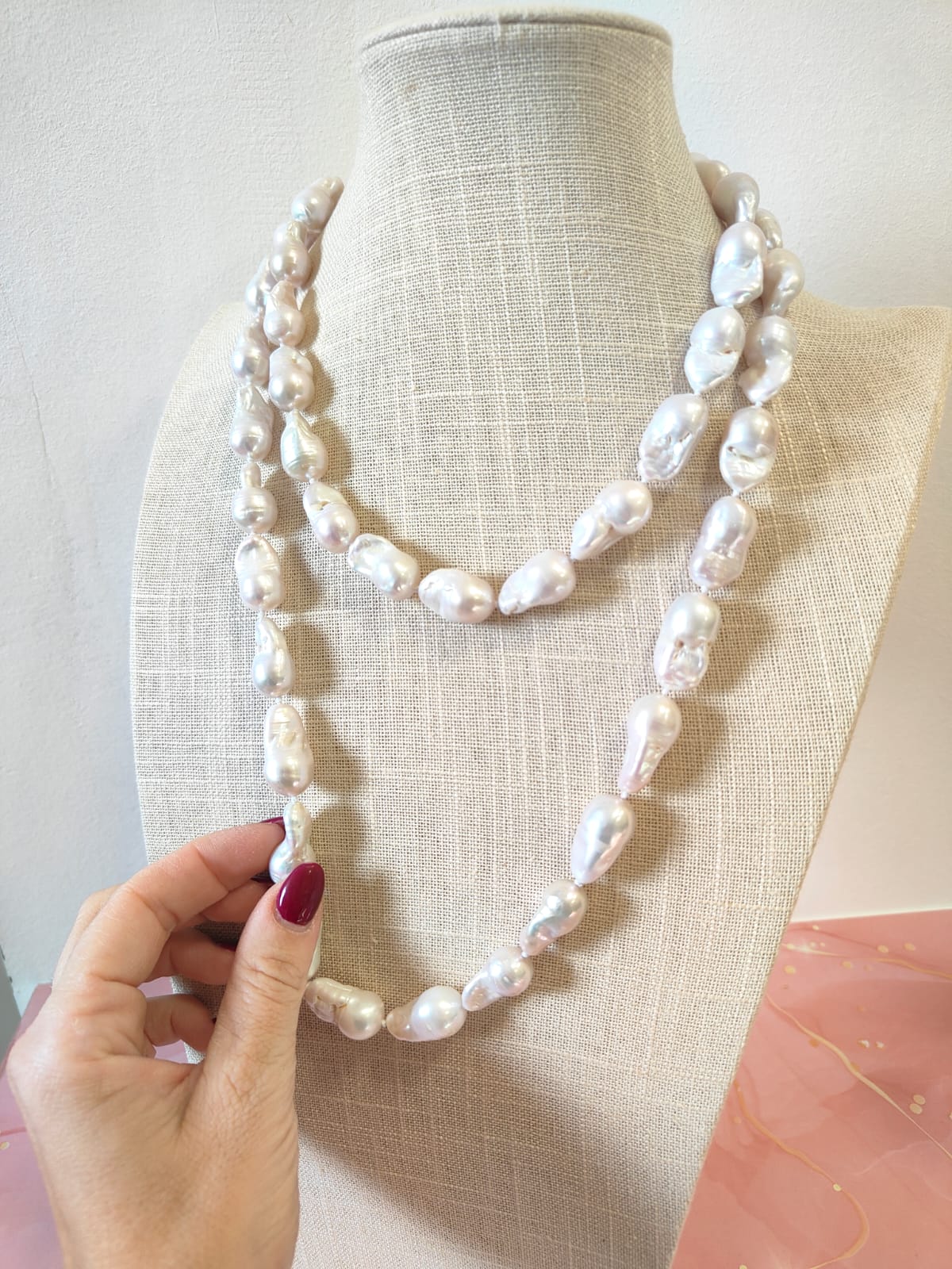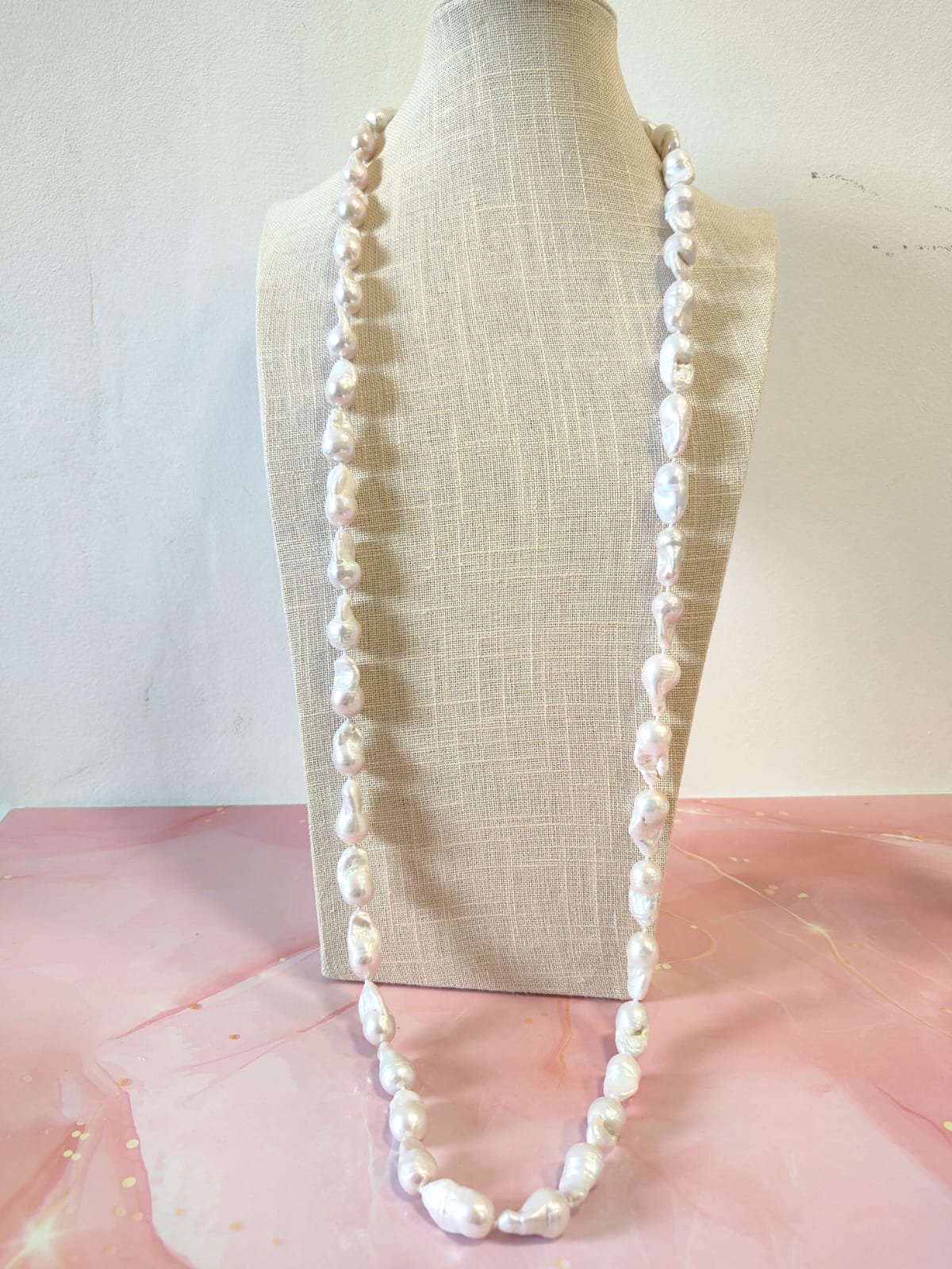 La collana lunga perle barocche si adatta perfettamente a ogni stile: elegante con un abito da sera, raffinata con una camicia bianca o un top in seta. È un gioiello che illumina, che accompagna con discrezione ma lascia il segno, unendo naturalezza e prestigio.