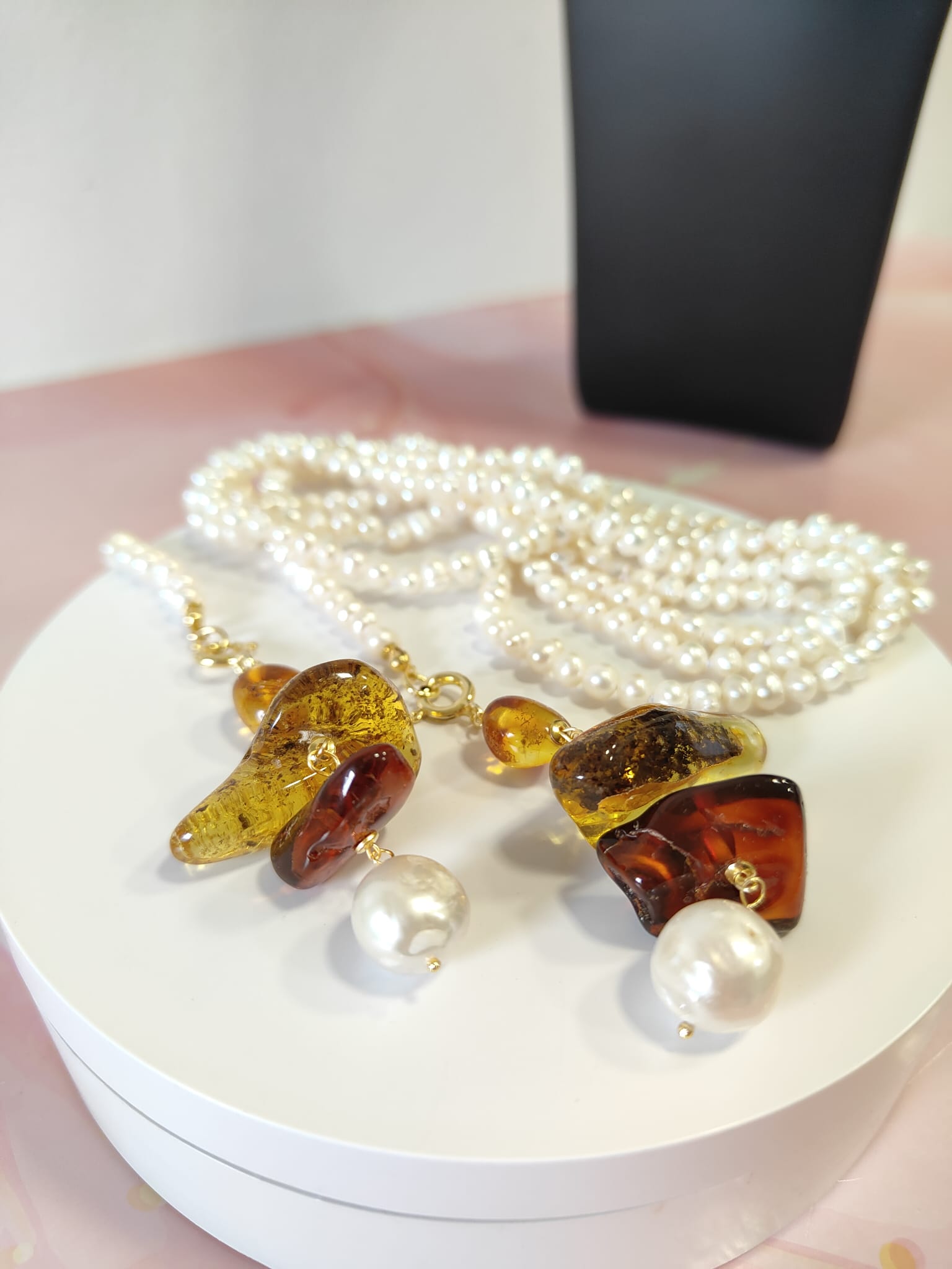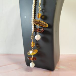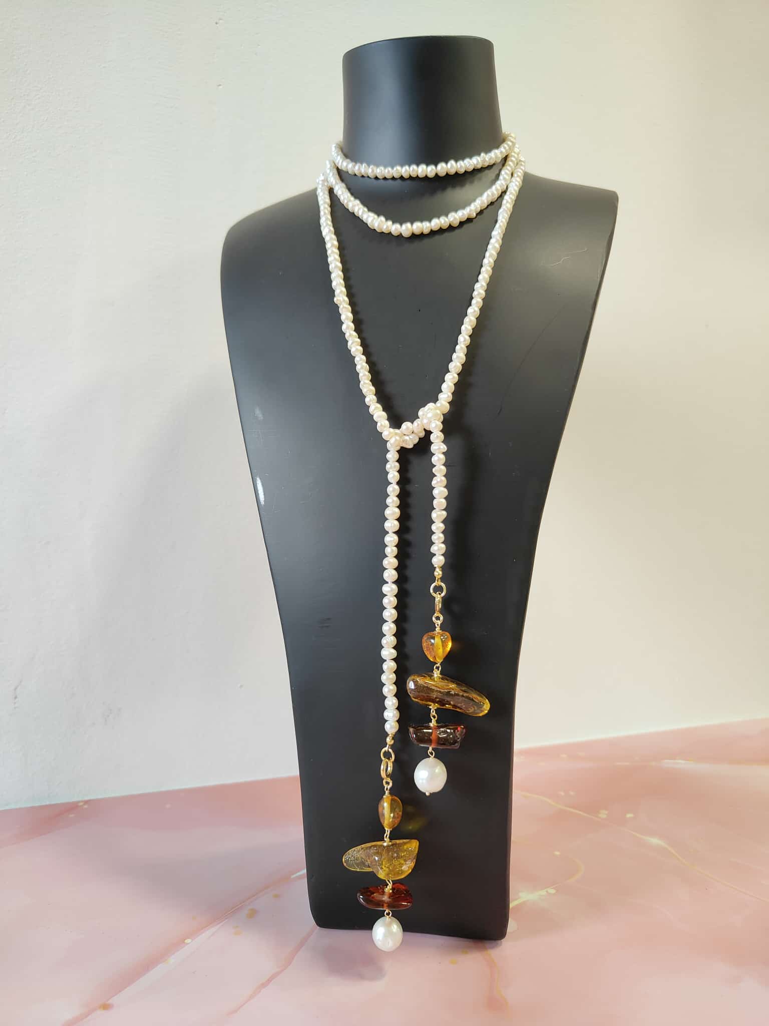 Collana Lunga Perle E Ambra In Materiali Naturali