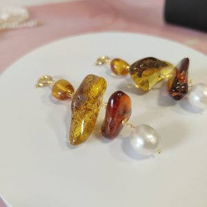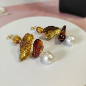 L’ambra, con le sue inclusioni e riflessi caldi, racconta una storia antica e materica. Le perle naturali, invece, introducono un contrasto delicato e luminoso. Inoltre, le minuterie dorate valorizzano le tonalità calde delle pietre, creando un equilibrio elegante. Il risultato è un gioiello che unisce luce, texture e autenticità artigianale.