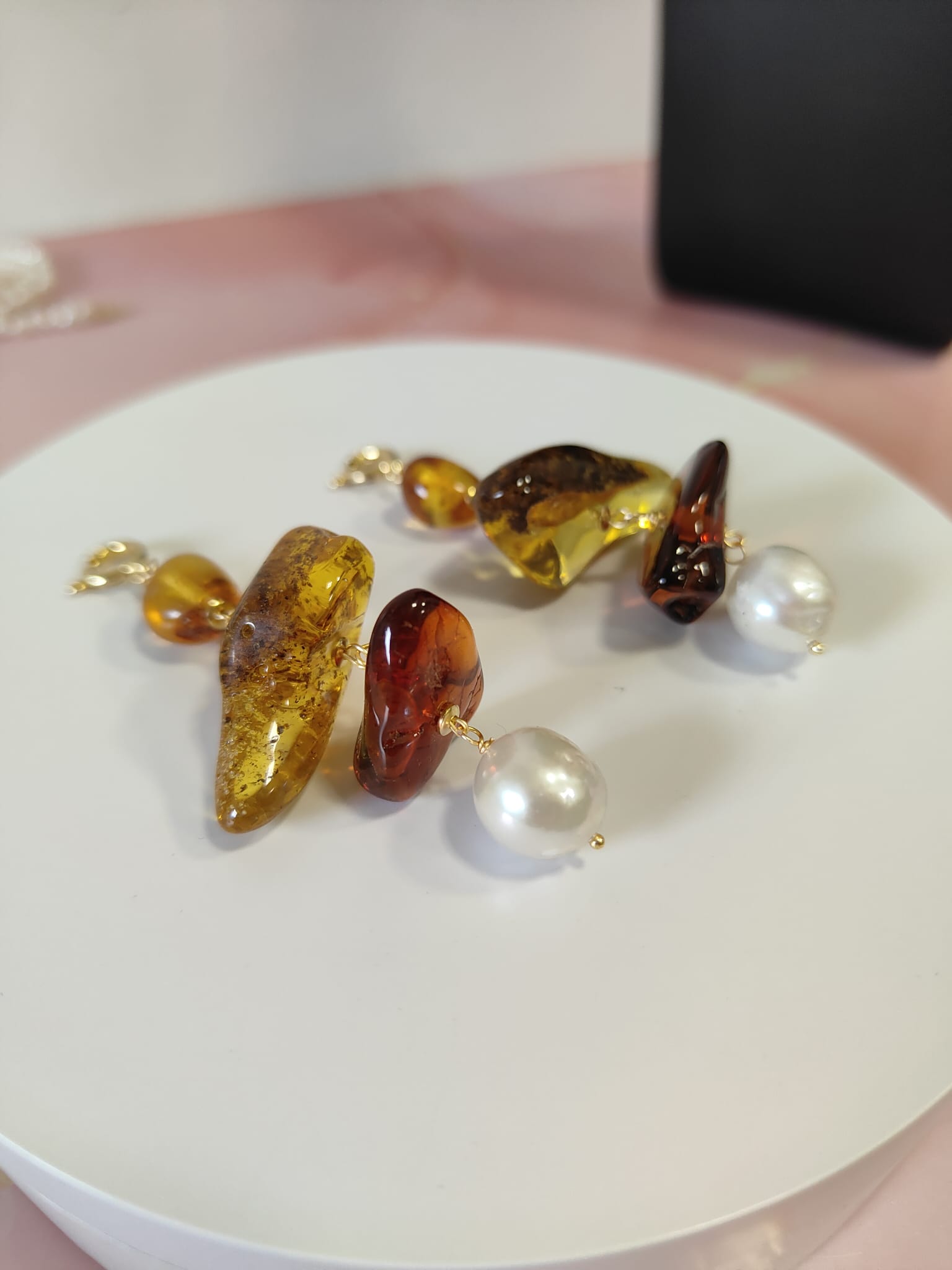 La parte più caratteristica del design è la presenza di due ciondoli rimovibili in ambra baltica naturale. Presentano diverse sfumature, dal miele trasparente al cognac profondo, e sono completati da perle pendenti luminose. Ogni ciondolo è dotato di una chiusura dorata, quindi può essere staccato e applicato a catene o collane differenti. In questo modo puoi indossarli entrambi, solo uno oppure nessuno, trasformando l’aspetto del gioiello con pochi gesti.