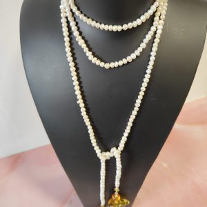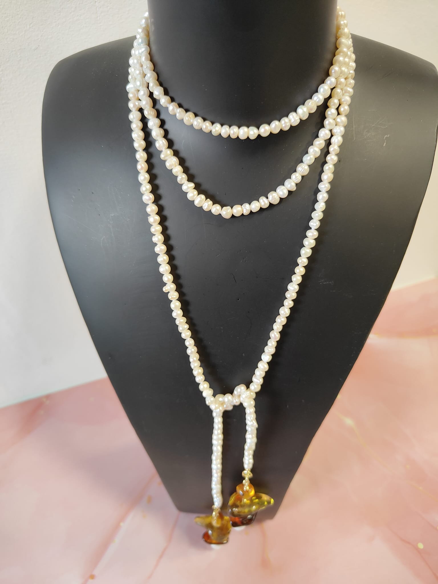 La collana lunga perle e ambra è un gioiello trasformabile pensato per chi desidera un accessorio elegante e allo stesso tempo versatile. È composta da una sequenza di piccole perle naturali dalla luminosità morbida e irregolare. Inoltre, la collana non presenta chiusura, quindi può essere indossata in diversi modi: lunga e lineare, annodata sul davanti oppure avvolta più volte attorno al collo per un effetto più voluminoso. Questo la rende adatta sia a look quotidiani sia ad abbinamenti più raffinati da sera.