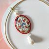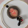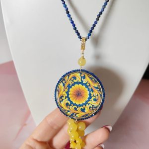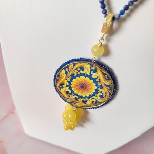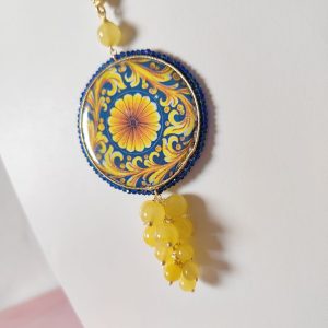 Il pendente rotondo è realizzato in maiolica tipica siciliana, con motivi floreali giallo-oro su fondo blu. Ogni dettaglio è realizzato, secondo la tradizione delle botteghe artigiane dell’isola. Una cornice di cristalli blu incastonati esalta la luce e crea un elegante contrasto con i toni dorati del disegno.