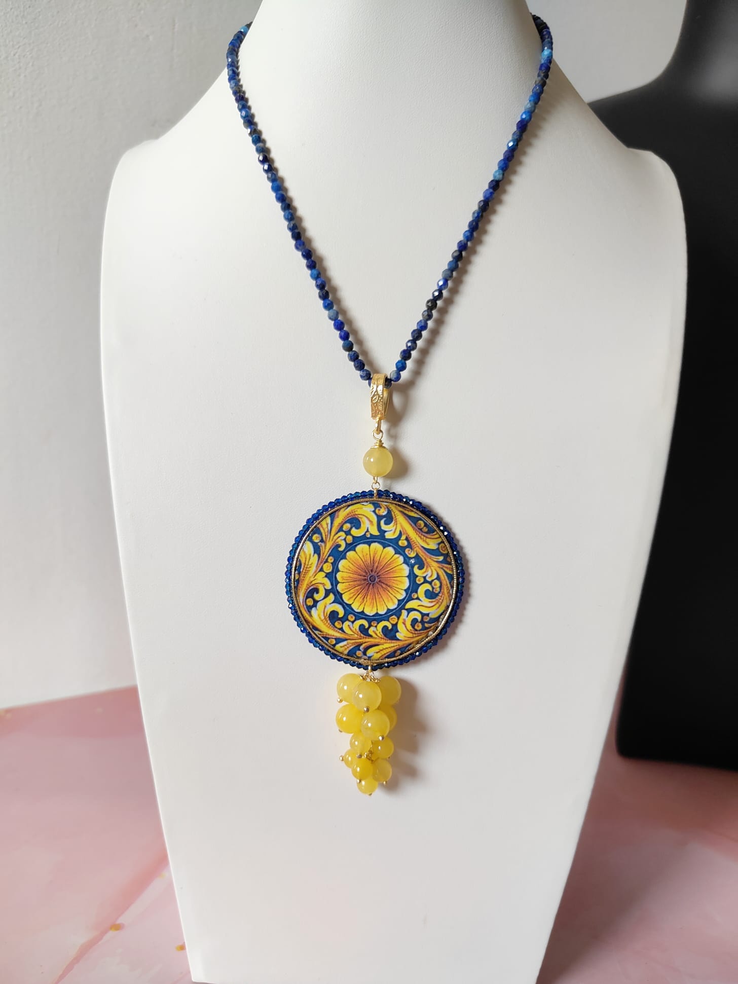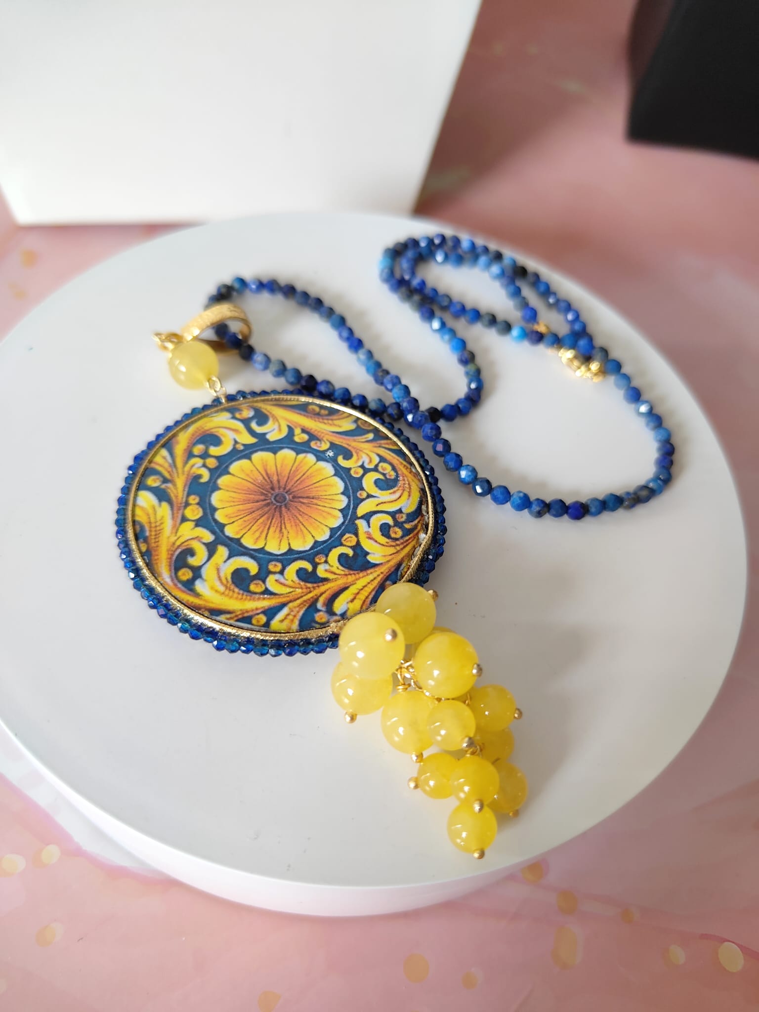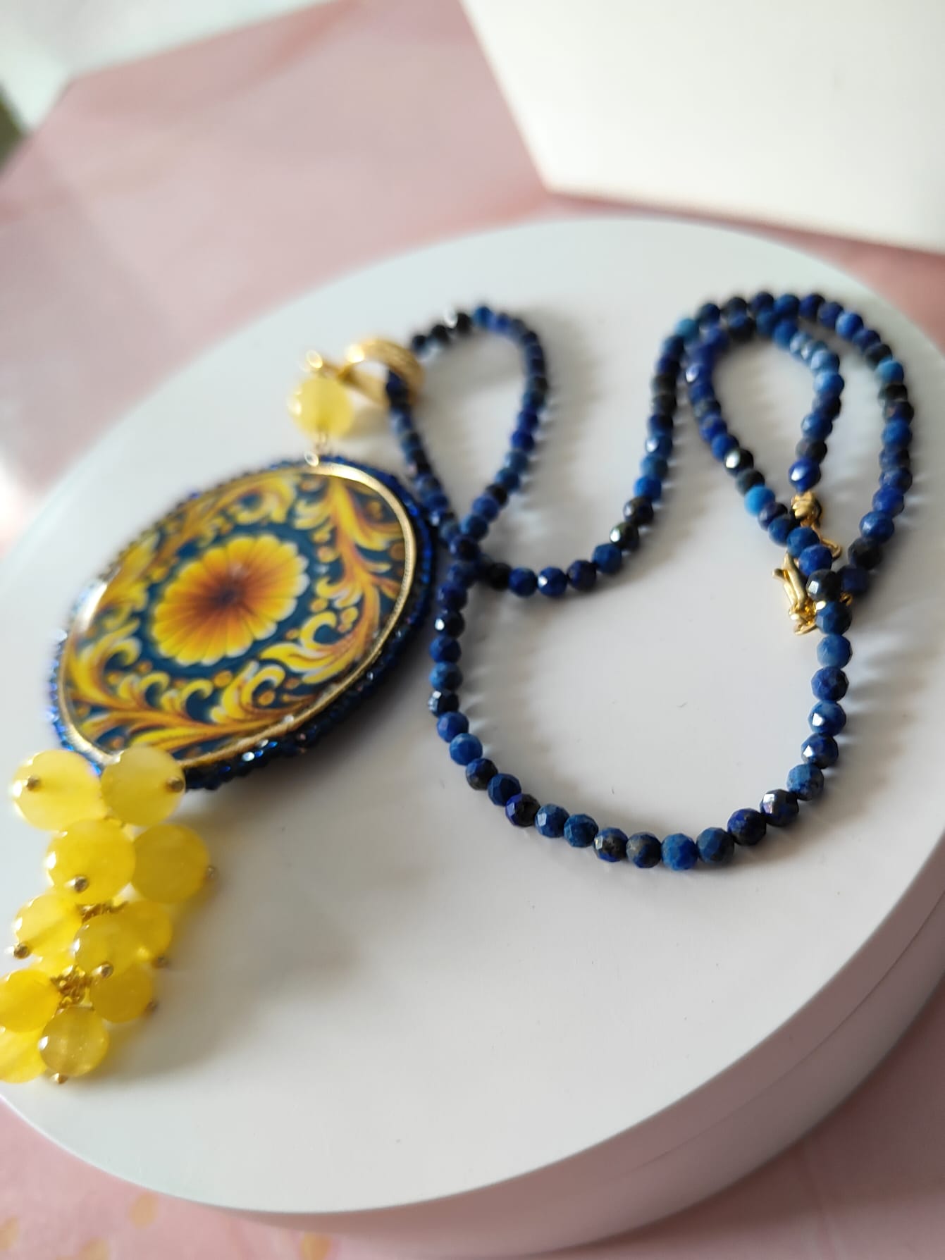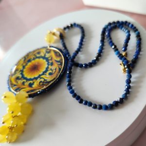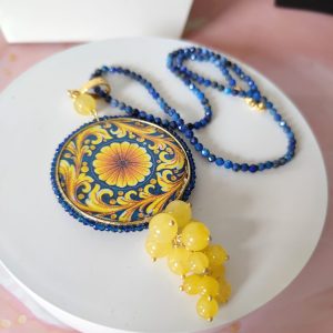 Materiali: sodalite naturale sfaccettata, maiolica tipica siciliana, agata gialla naturale, ottone dorato con zirconi, cristalli blu.