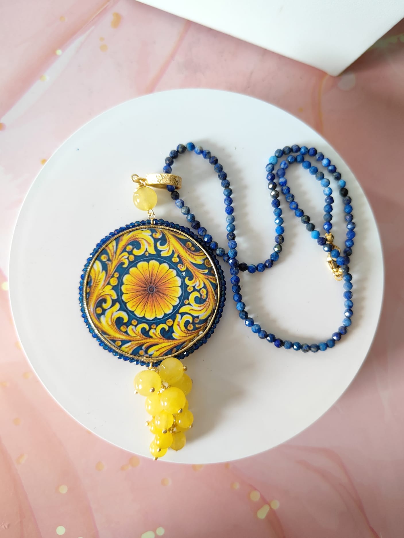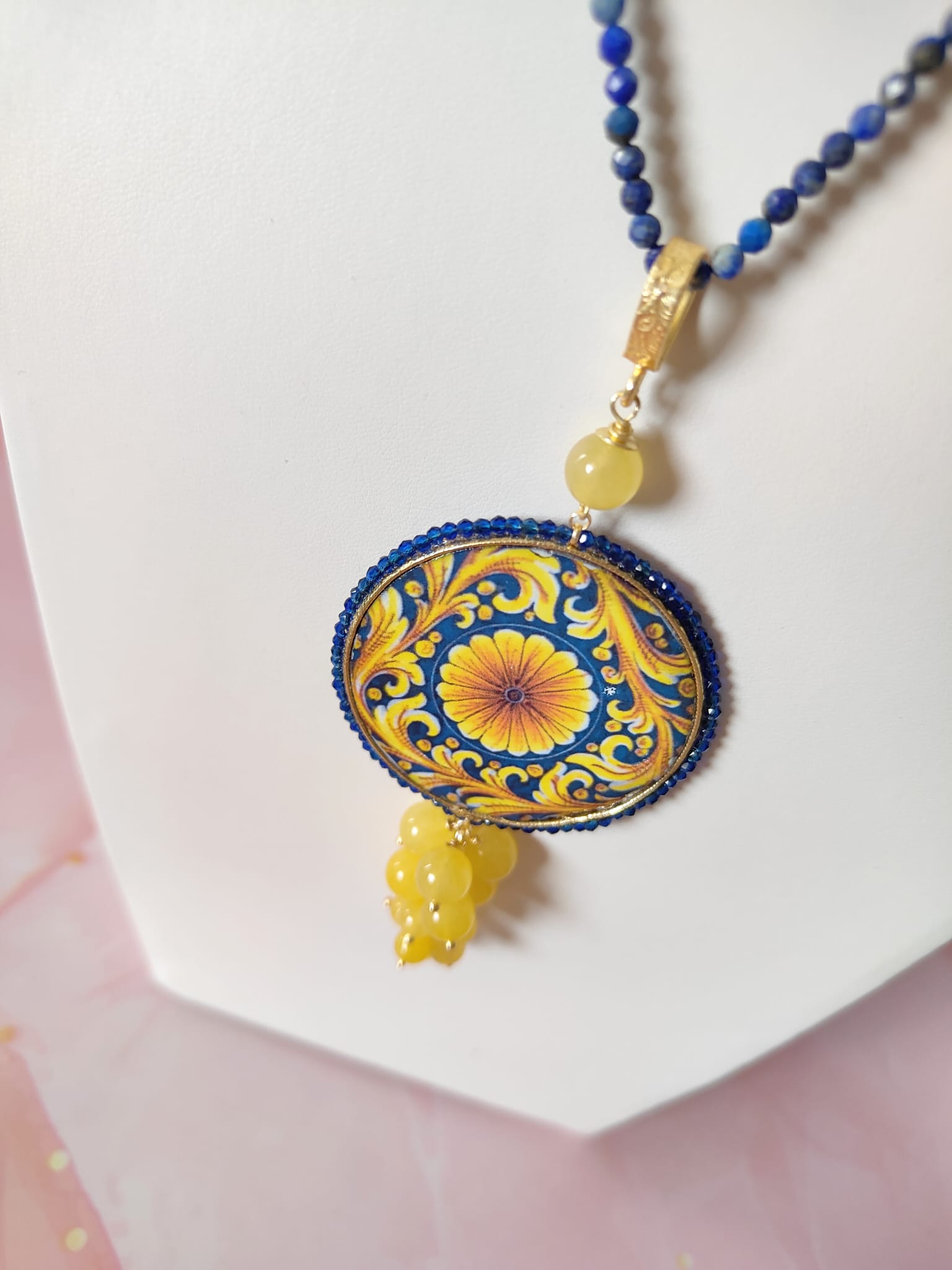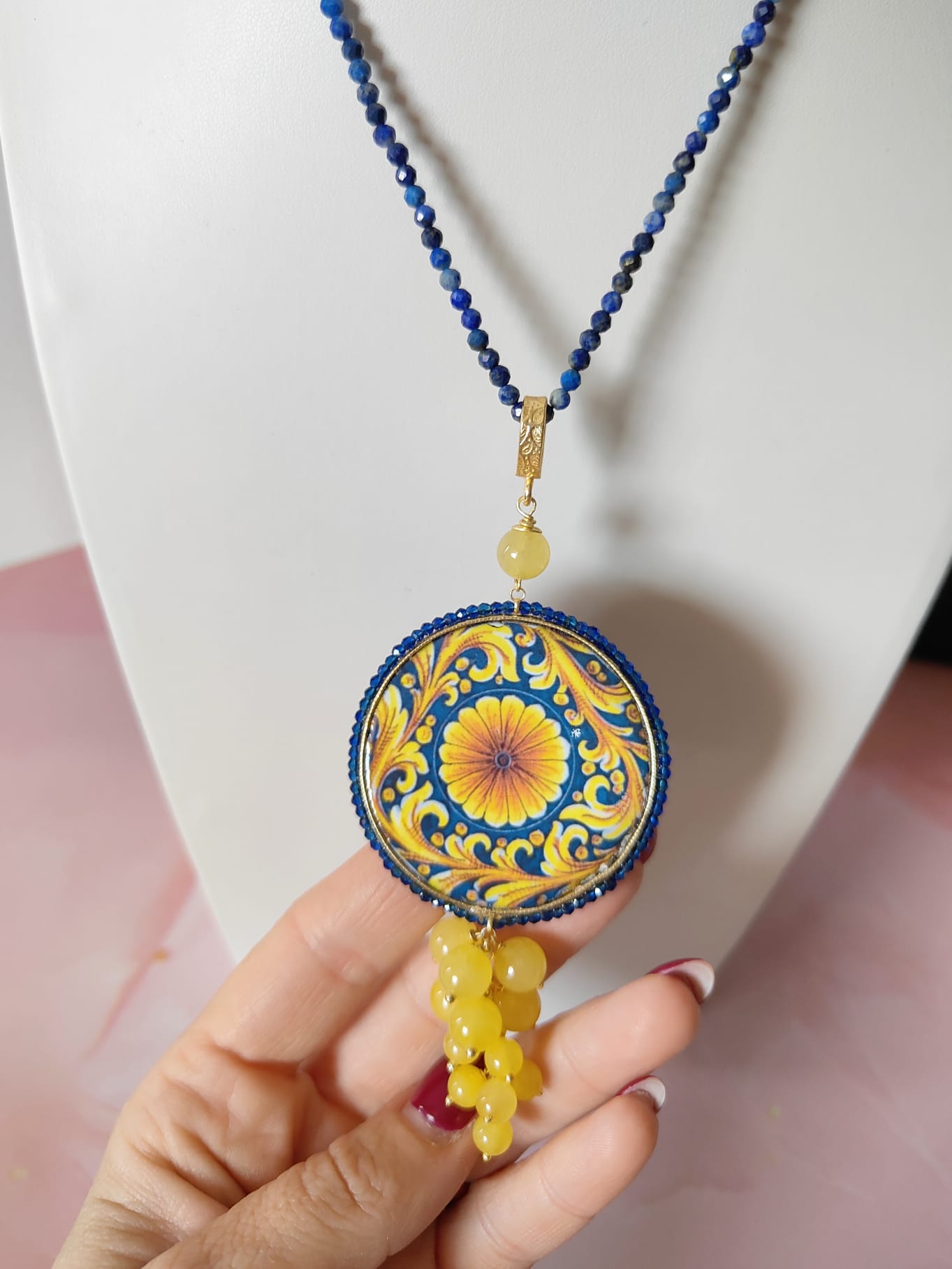 Materiali: sodalite naturale sfaccettata, maiolica tipica siciliana, agata gialla naturale, ottone dorato con zirconi, cristalli blu.