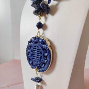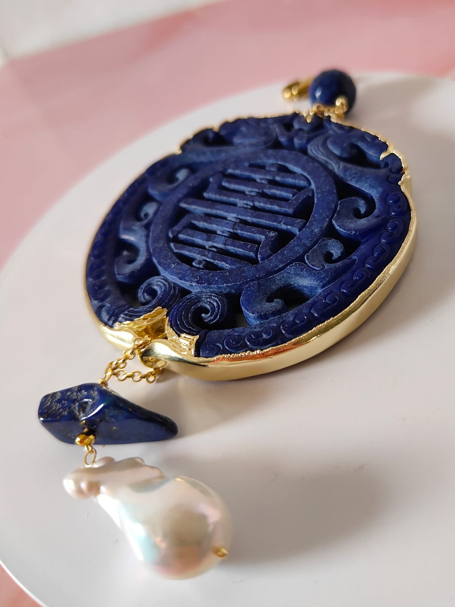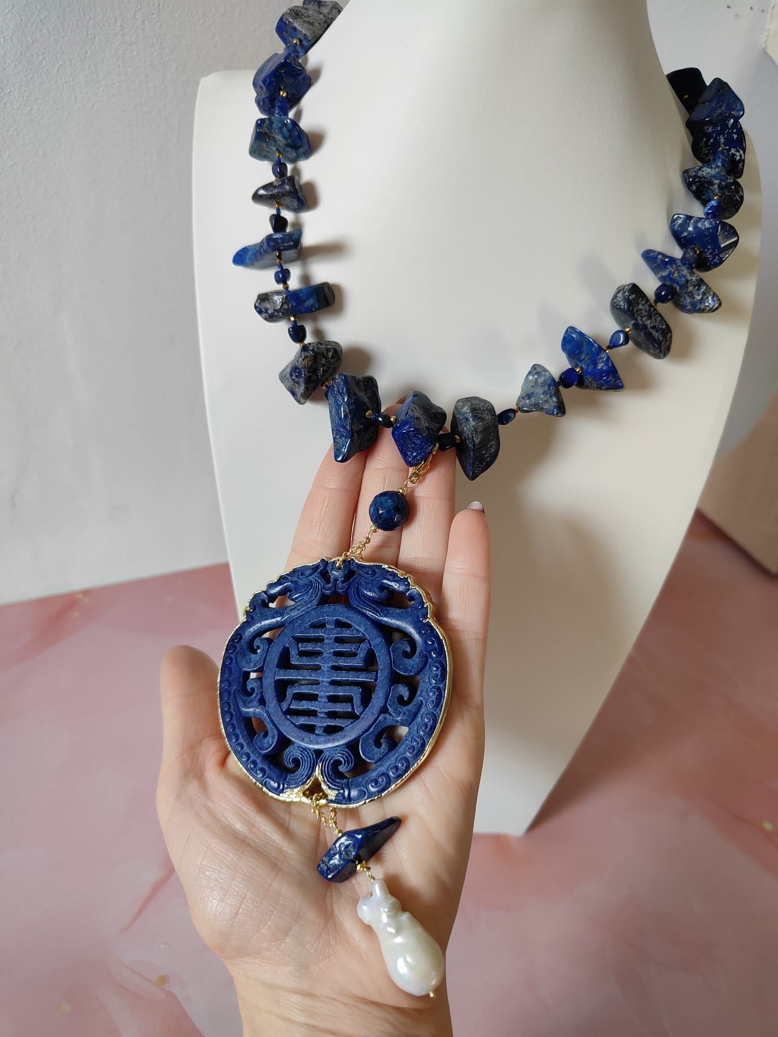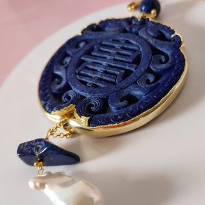 Materiali: giada blu intagliata e bordata oro, lapislazzuli naturale, perla barocca