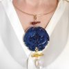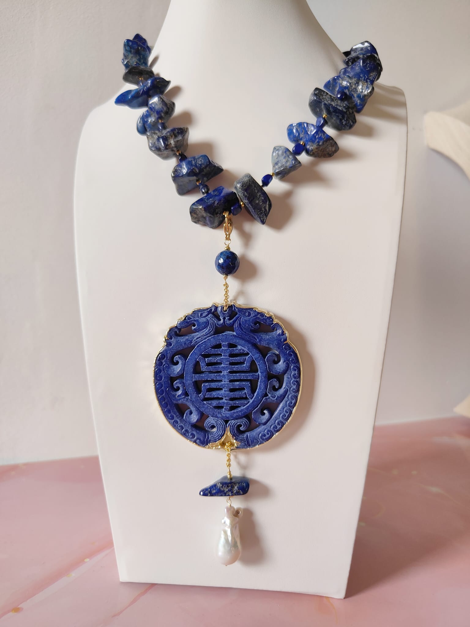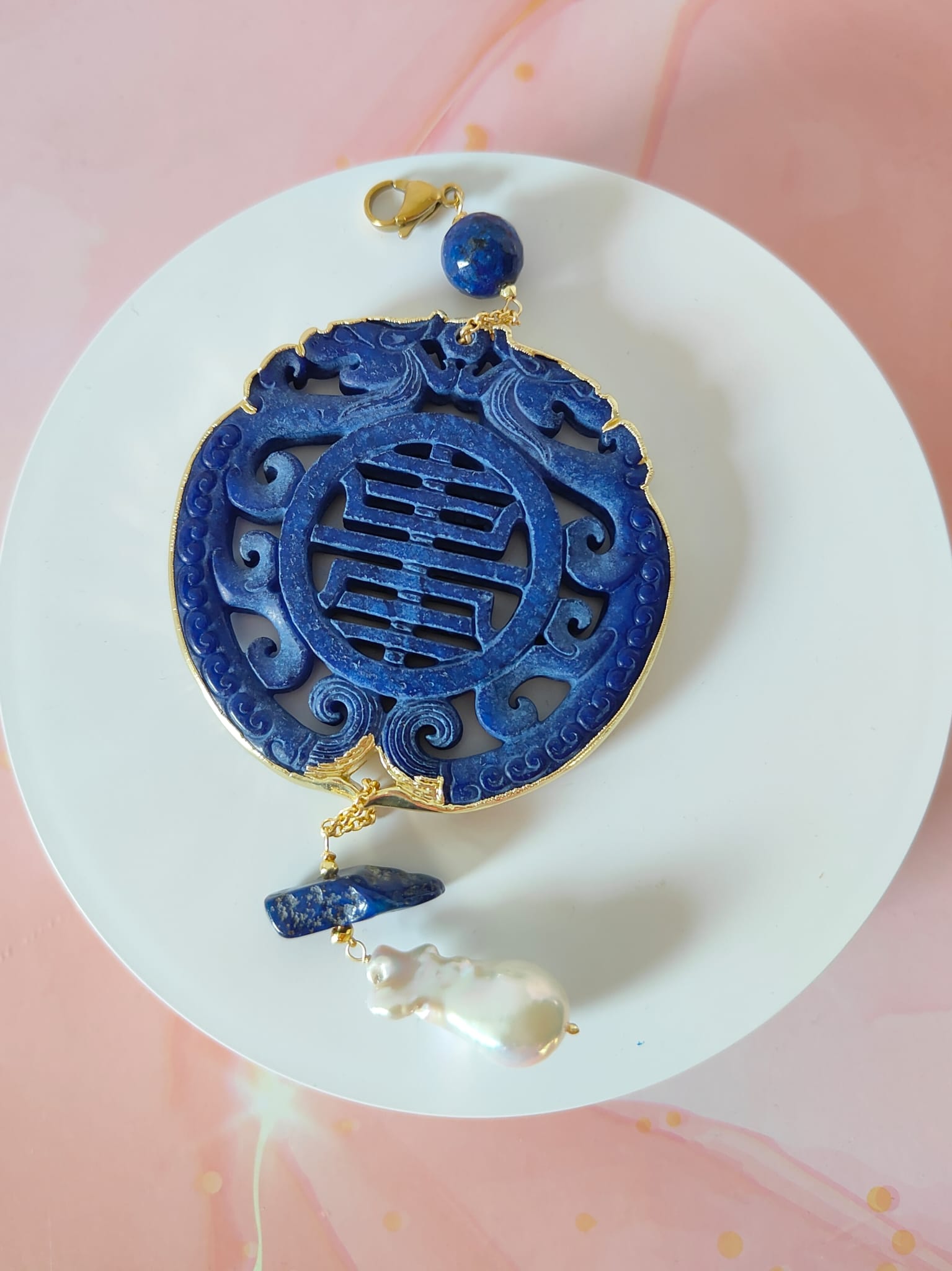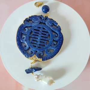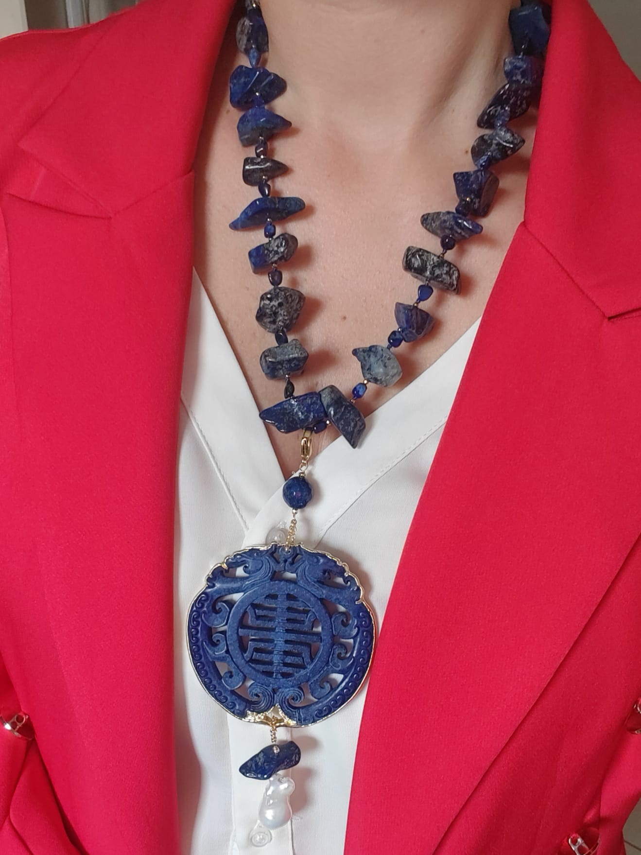 Materiali: giada blu intagliata e bordata oro, lapislazzuli naturale, perla barocca