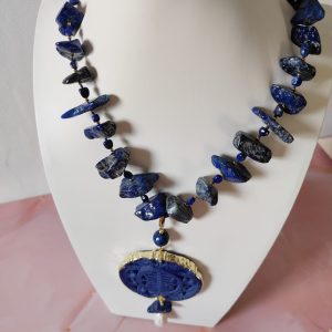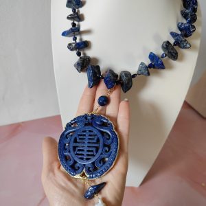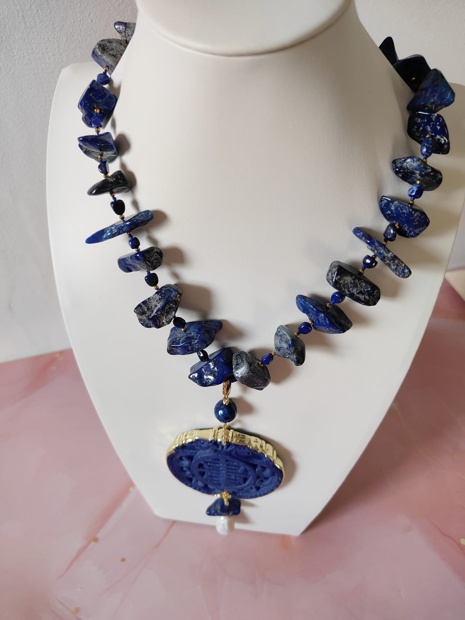 La collana è composta da chips irregolari di lapislazzuli, intervallati da piccole sfere blu e dettagli dorati che esaltano la profondità della pietra. La montatura è interamente realizzata a mano e il pendente è rimovibile grazie al moschettone dorato, per poter essere indossato anche separatamente su altre catene o collier.