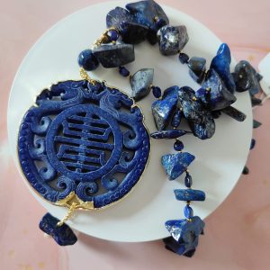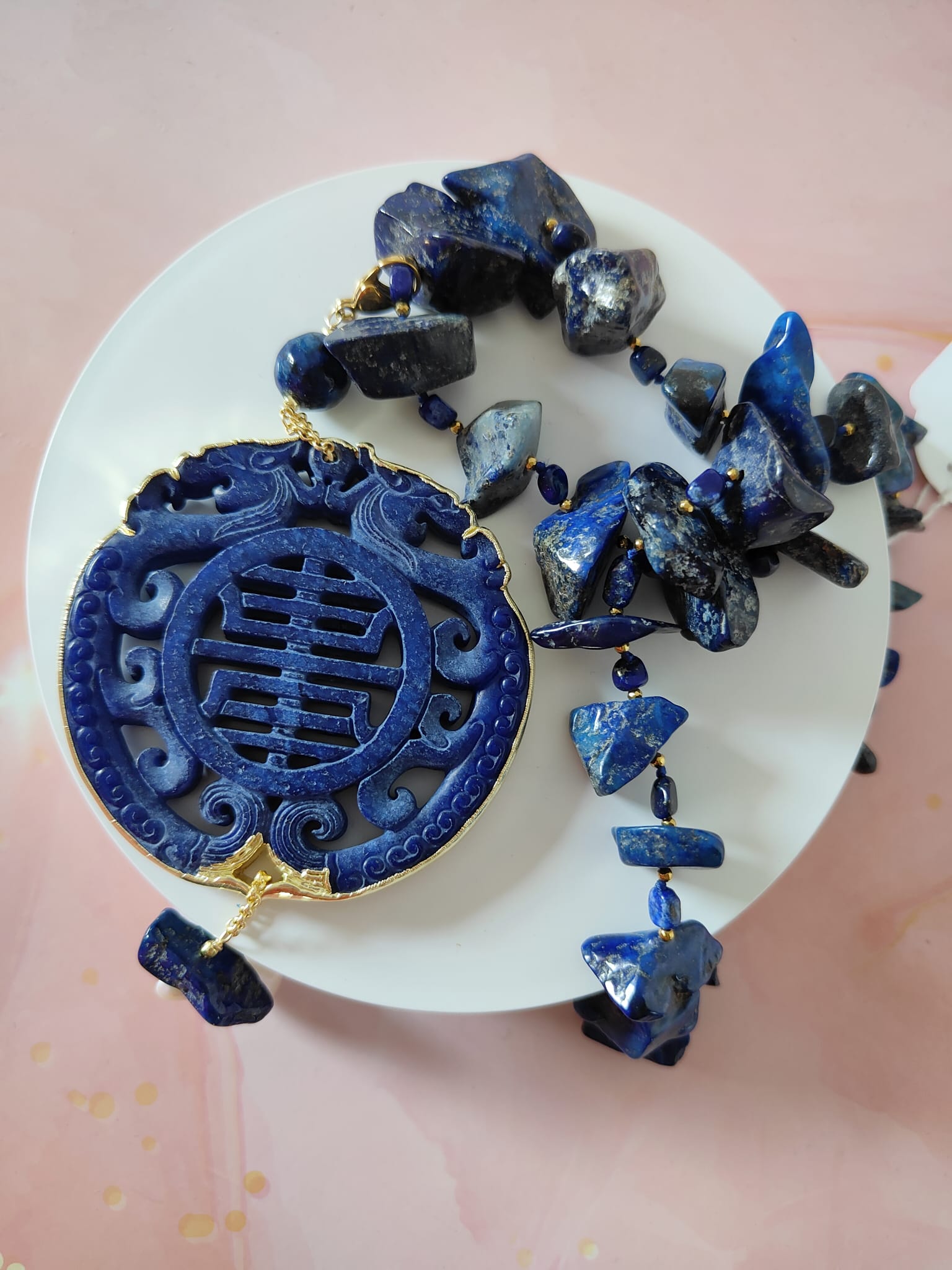 Il protagonista è il grande pendente in giada blu intagliata, bordato in oro lucido. Le sue incisioni raffigurano un mandala orientale, simbolo di armonia e rinascita, rendendo questo gioiello non solo un accessorio, ma un talismano di equilibrio e forza interiore.