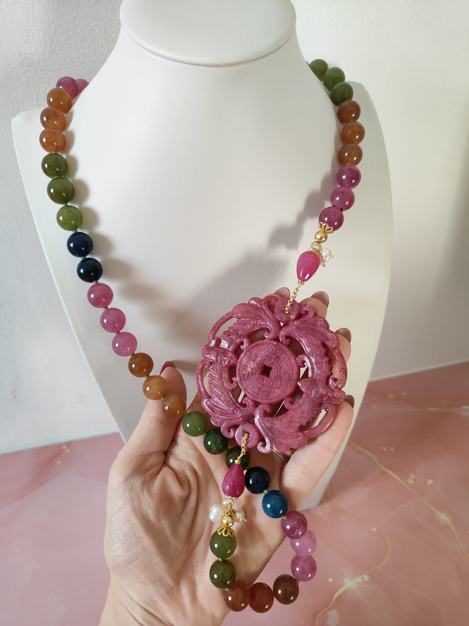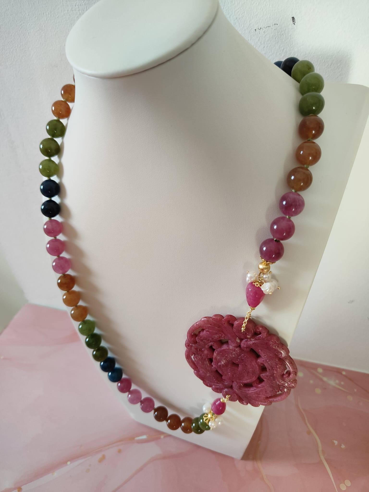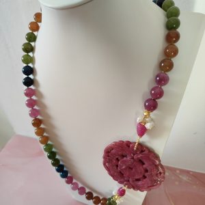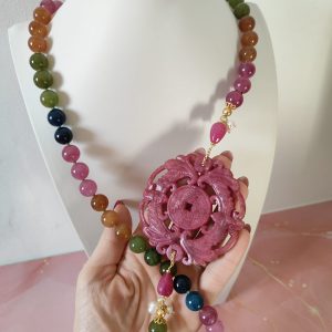 Materiali: giada rosa intagliata, tormaline naturali, perle di fiume