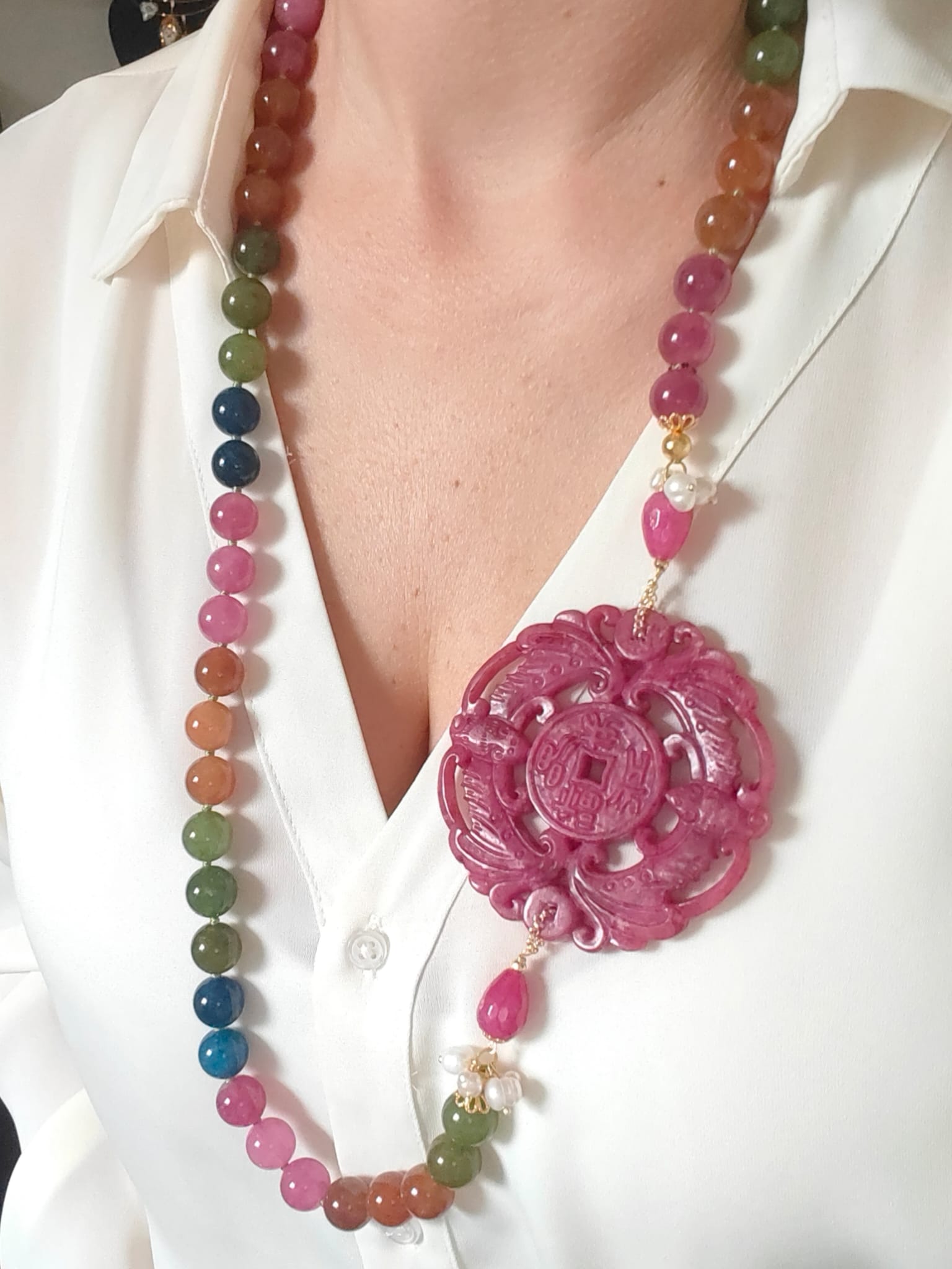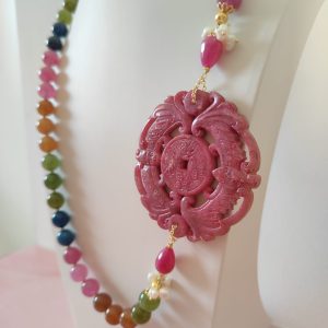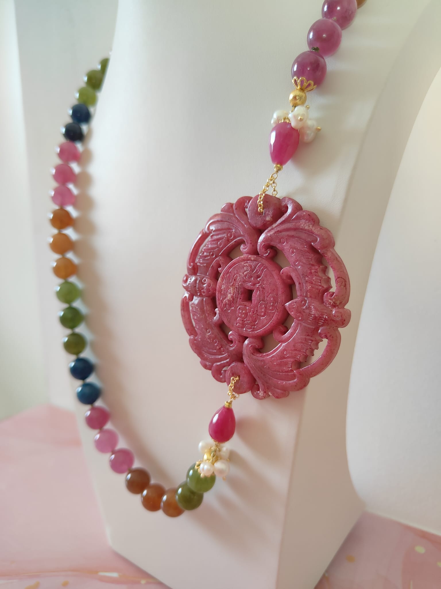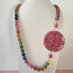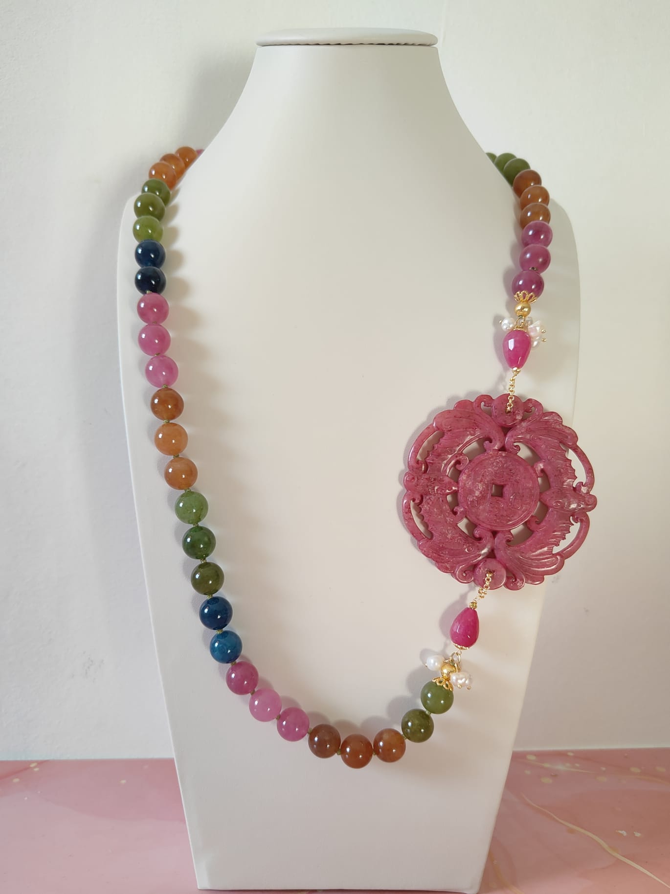 Materiali: giada rosa intagliata, tormaline naturali, perle di fiume
