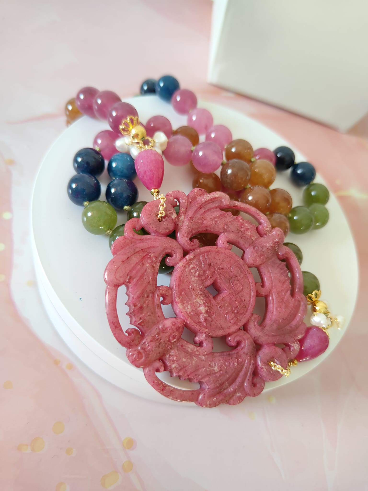 Il protagonista è il grande mandala in giada rosa intagliata, simbolo di armonia e rinascita. La lavorazione minuziosa mette in risalto i dettagli scultorei, rendendo ogni incisione una piccola opera d’arte. La giada, pietra associata alla serenità e alla protezione, in questa delicata tonalità rosata aggiunge un tocco di grazia e femminilità.