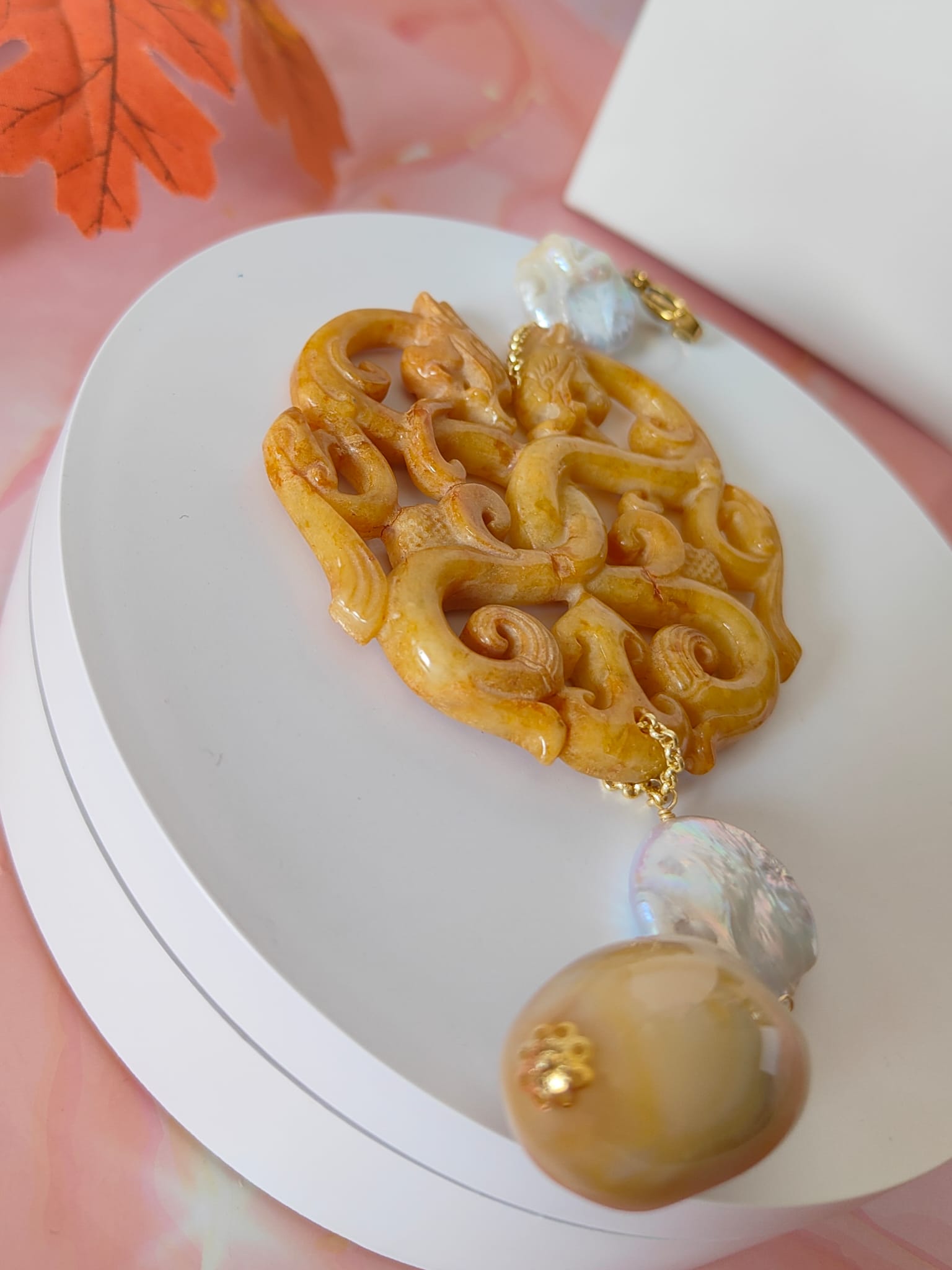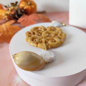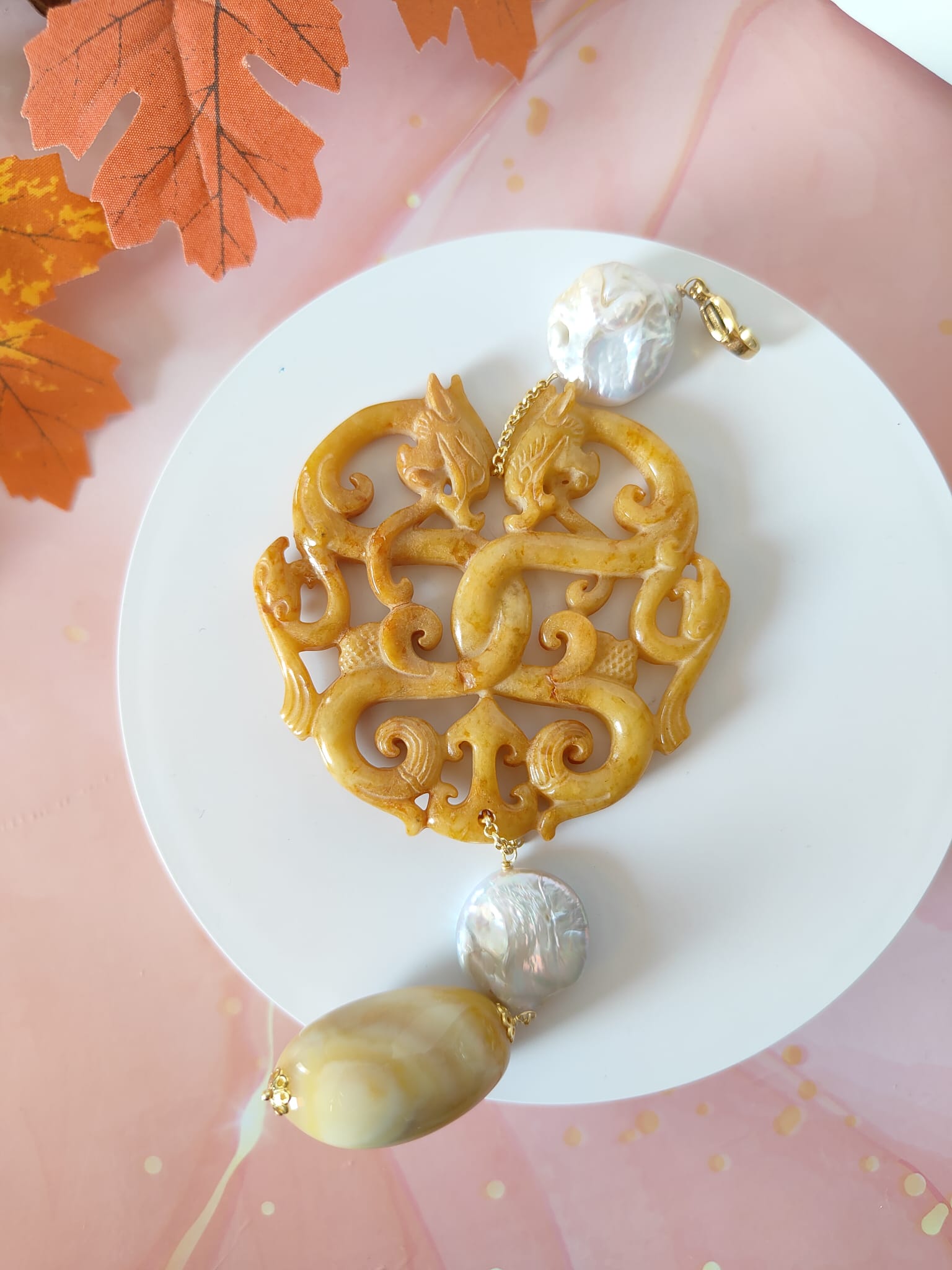Il protagonista assoluto è il mandala in giada intagliata color miele, una pietra da sempre associata a energia positiva, equilibrio interiore e protezione. Le linee fluide e i motivi intarsiati conferiscono al gioiello un aspetto prezioso e raffinato, che richiama l’arte antica e i simboli di armonia.