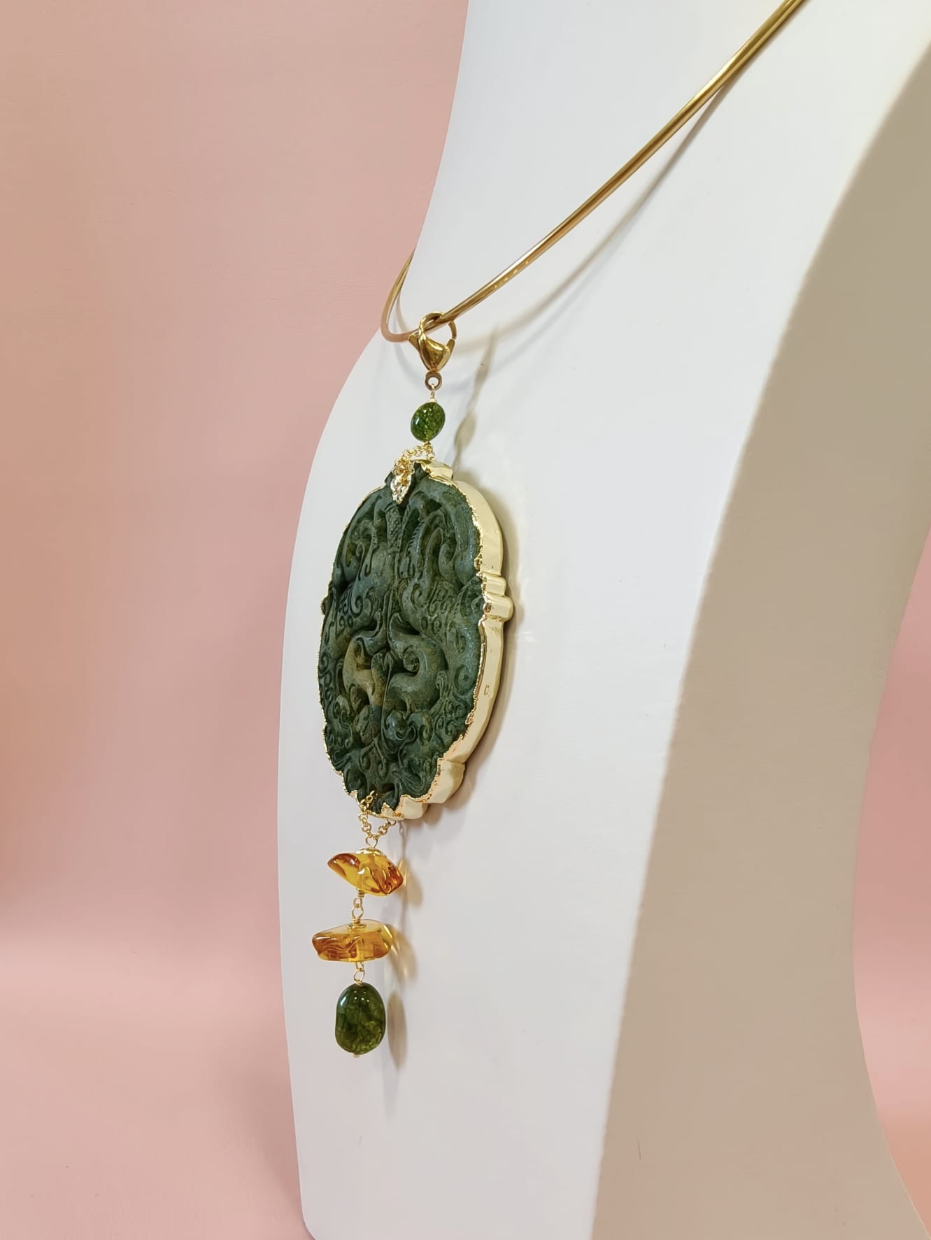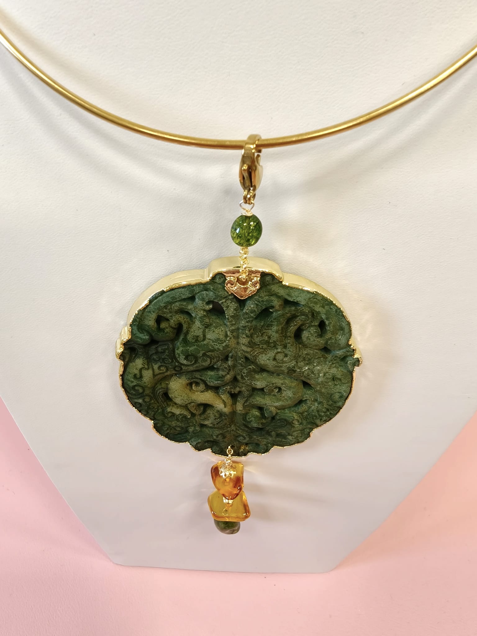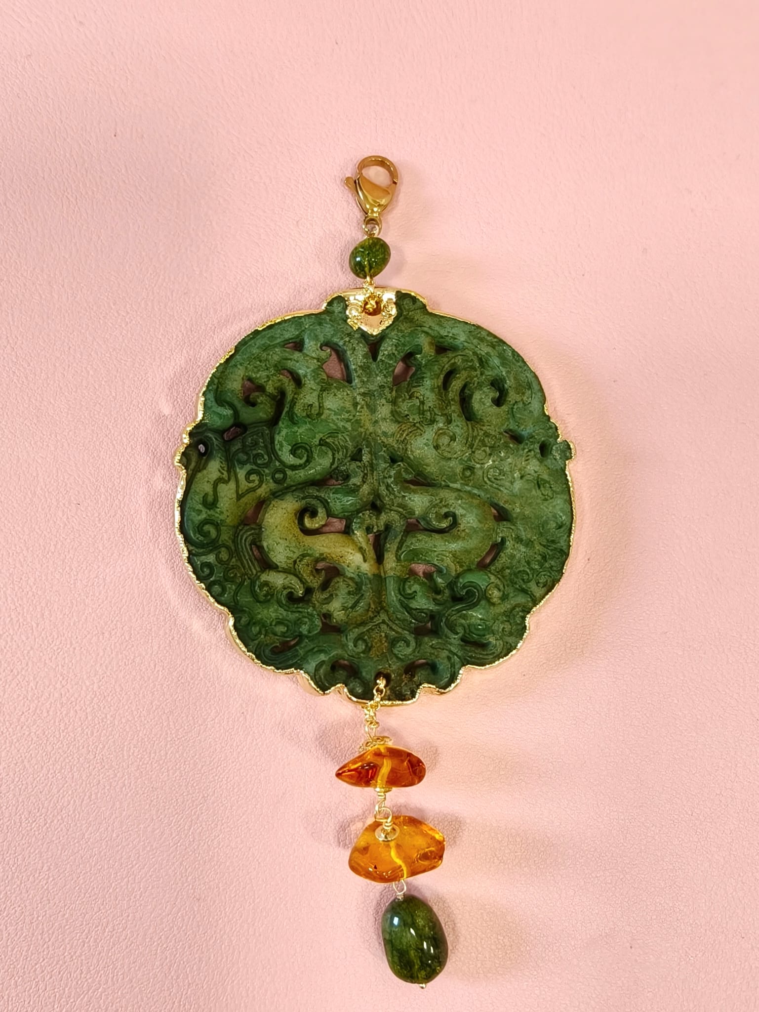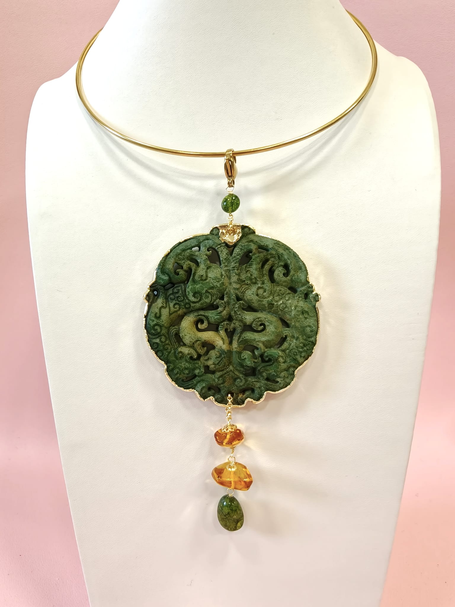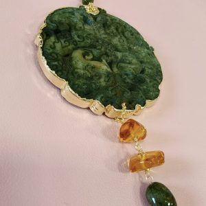 Materiali: giada antica intagliata, tormalina verde, ambra baltica naturale, acciaio