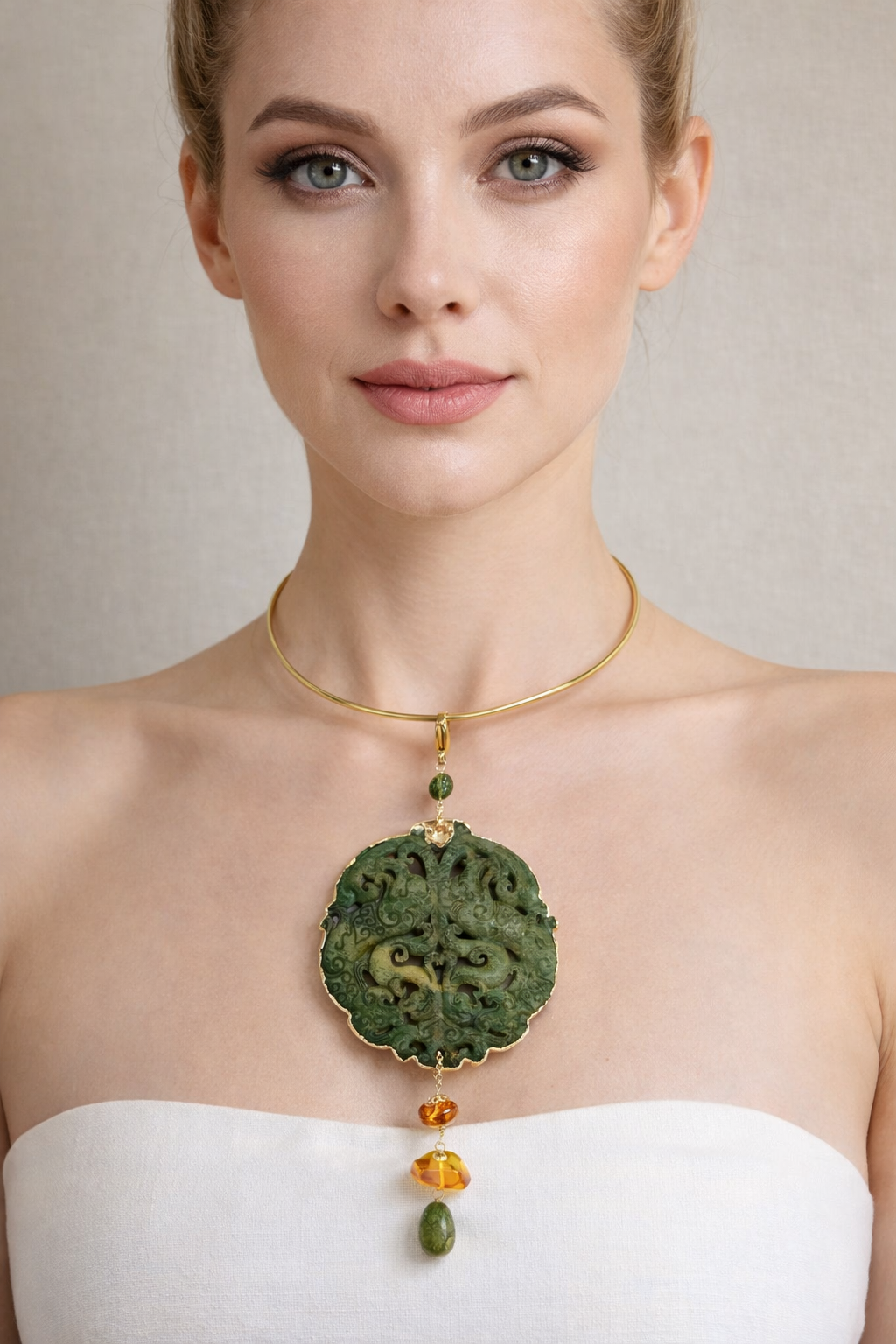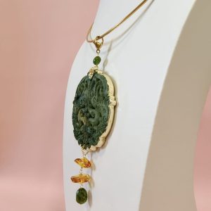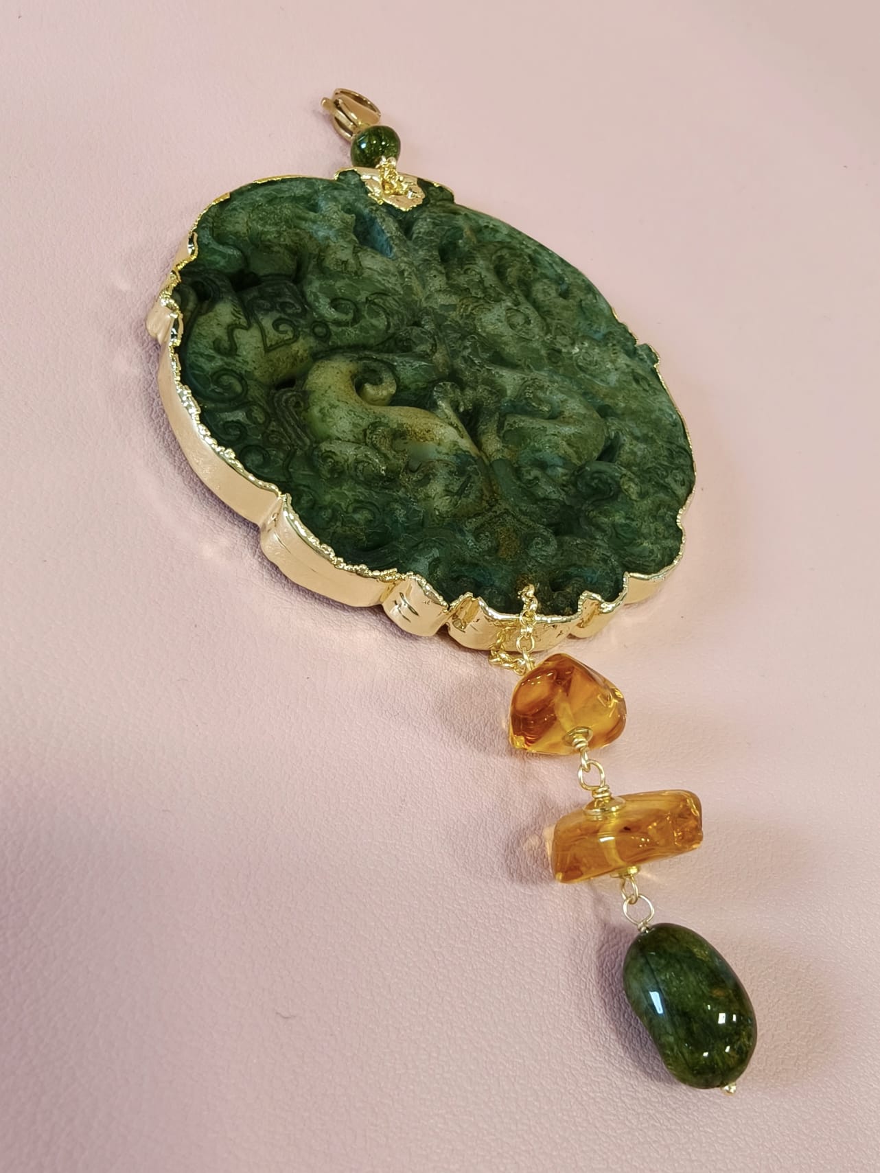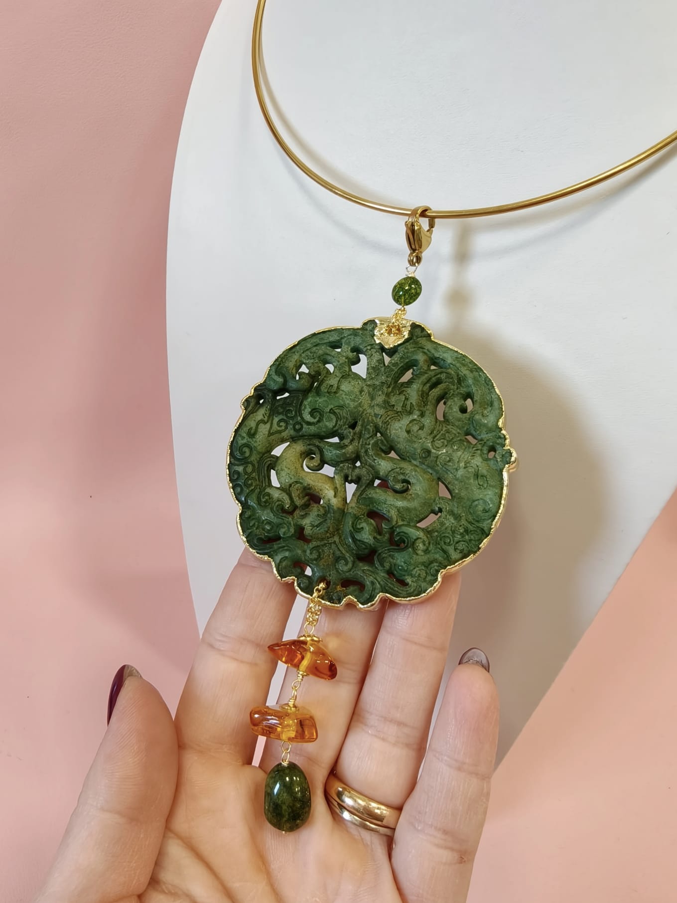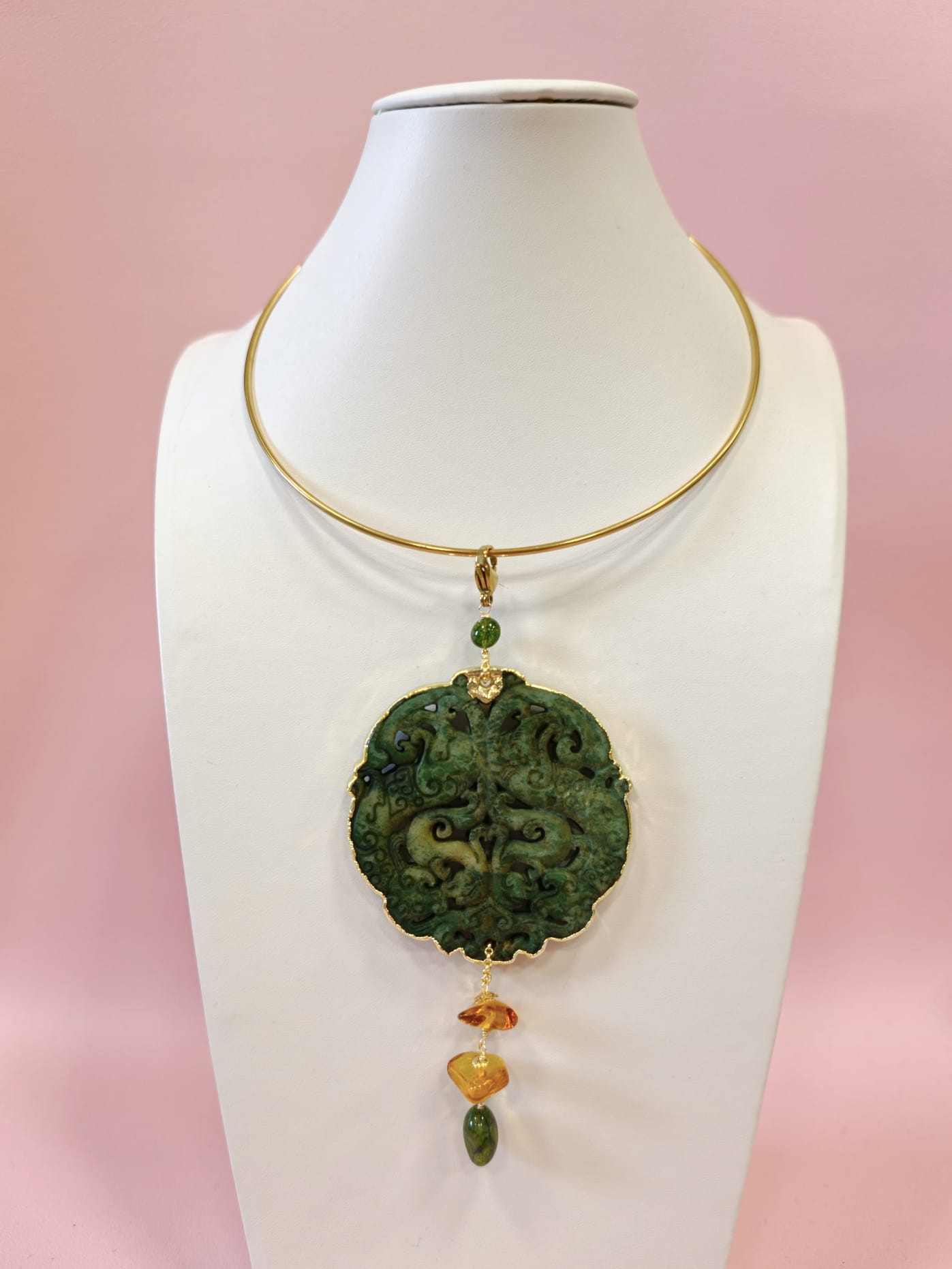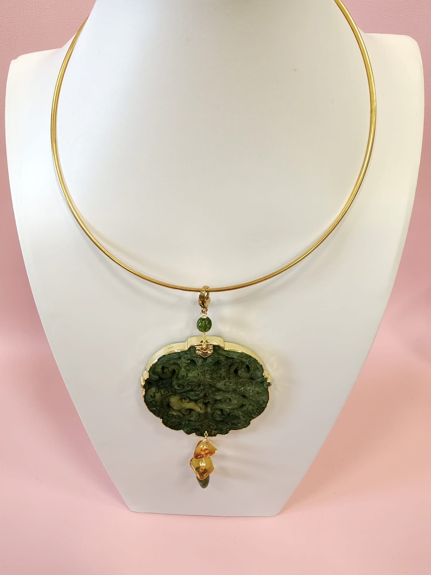 Materiali: giada antica intagliata, tormalina verde, ambra baltica naturale, acciaio