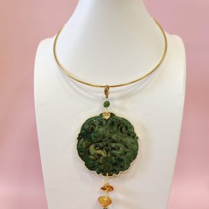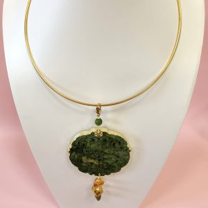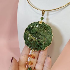 La collana mandala giada verde è una creazione esclusiva, fedele alle immagini, pensata per chi desidera indossare un gioiello importante, ricco di significato e carattere. Il protagonista è un grande ciondolo in giada antica finemente intagliata a motivo mandala, con decori sinuosi e profondi che richiamano simboli ornamentali orientali e forme naturali.