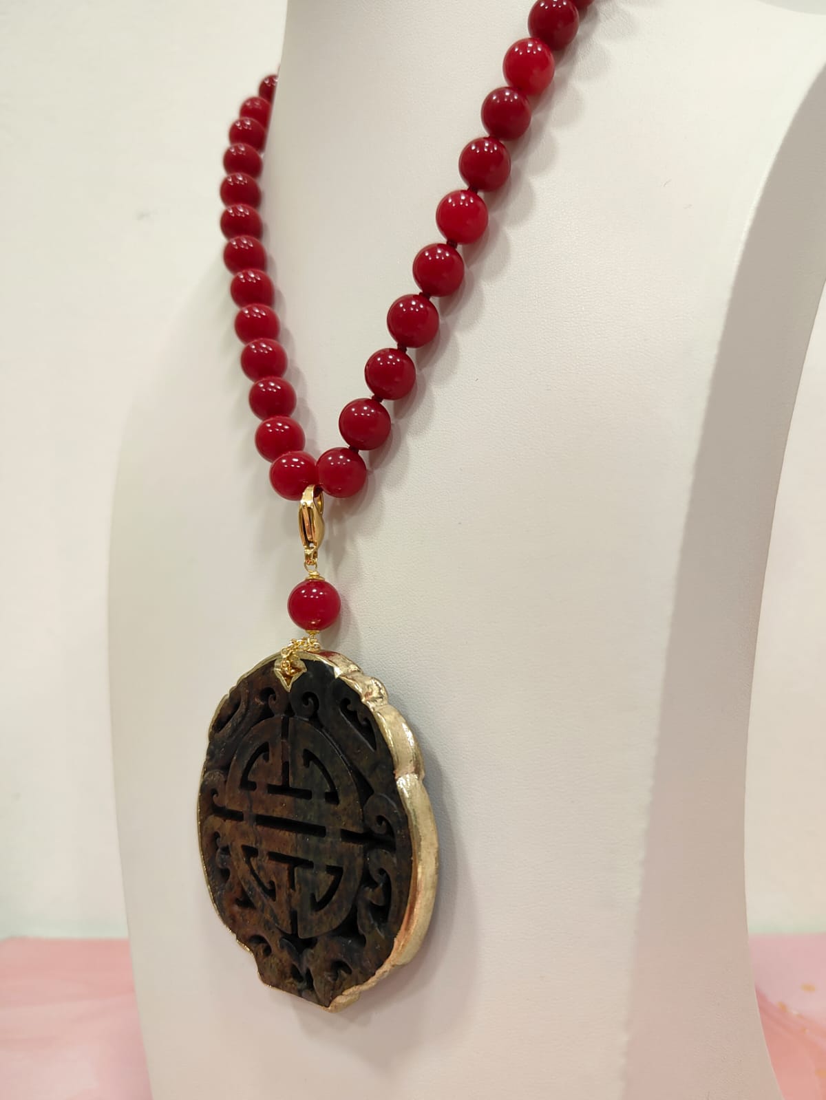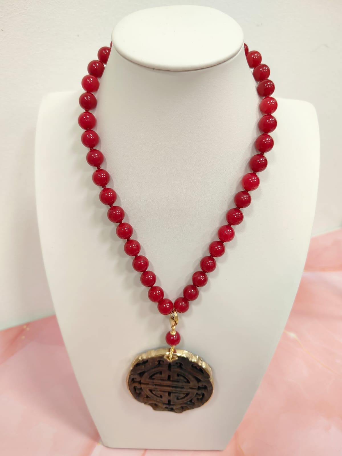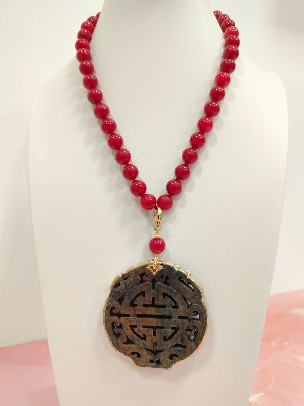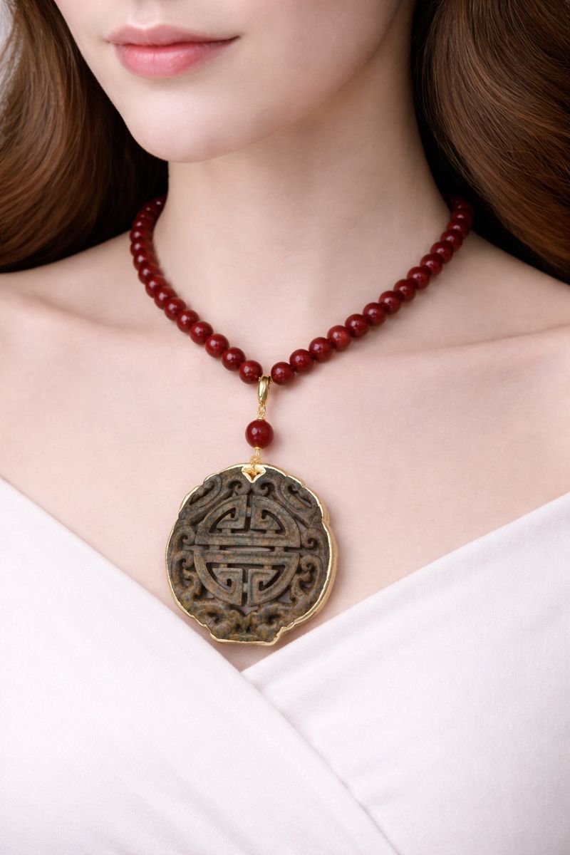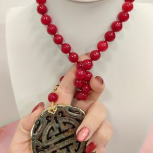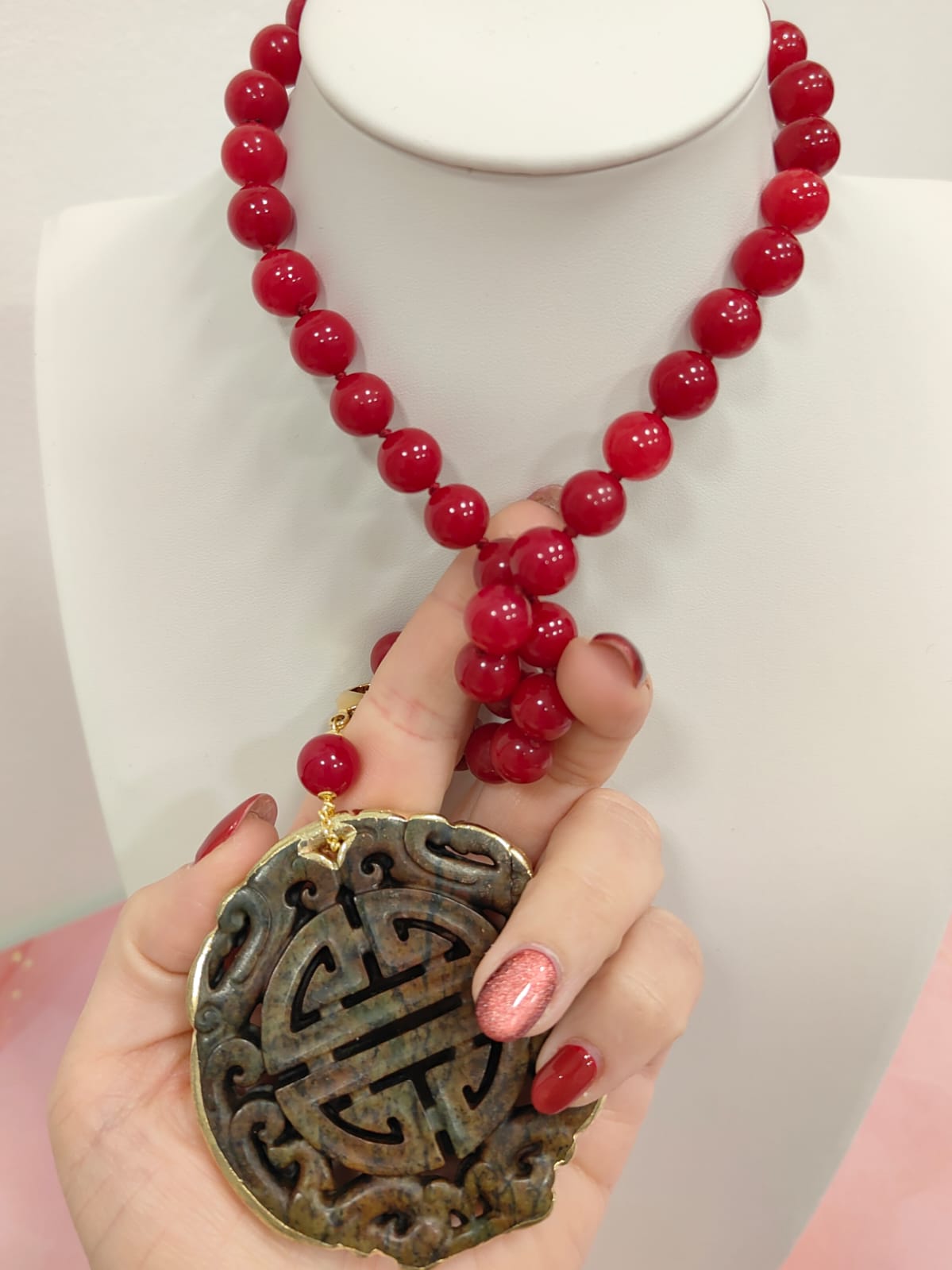 La collana è composta da sfere in agata rossa, annodate interamente a mano. Questa pietra naturale, leggermente più scura rispetto al rosso acceso, dona calore e intensità alla composizione. L’agata rossa è tradizionalmente legata all’energia vitale e al radicamento. Per questo motivo, crea un dialogo armonioso con la giada antica del ciondolo.
