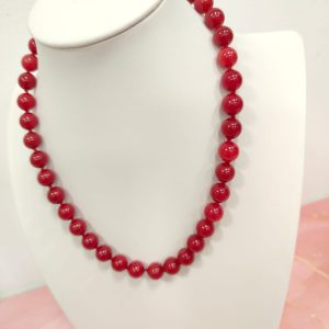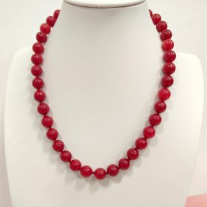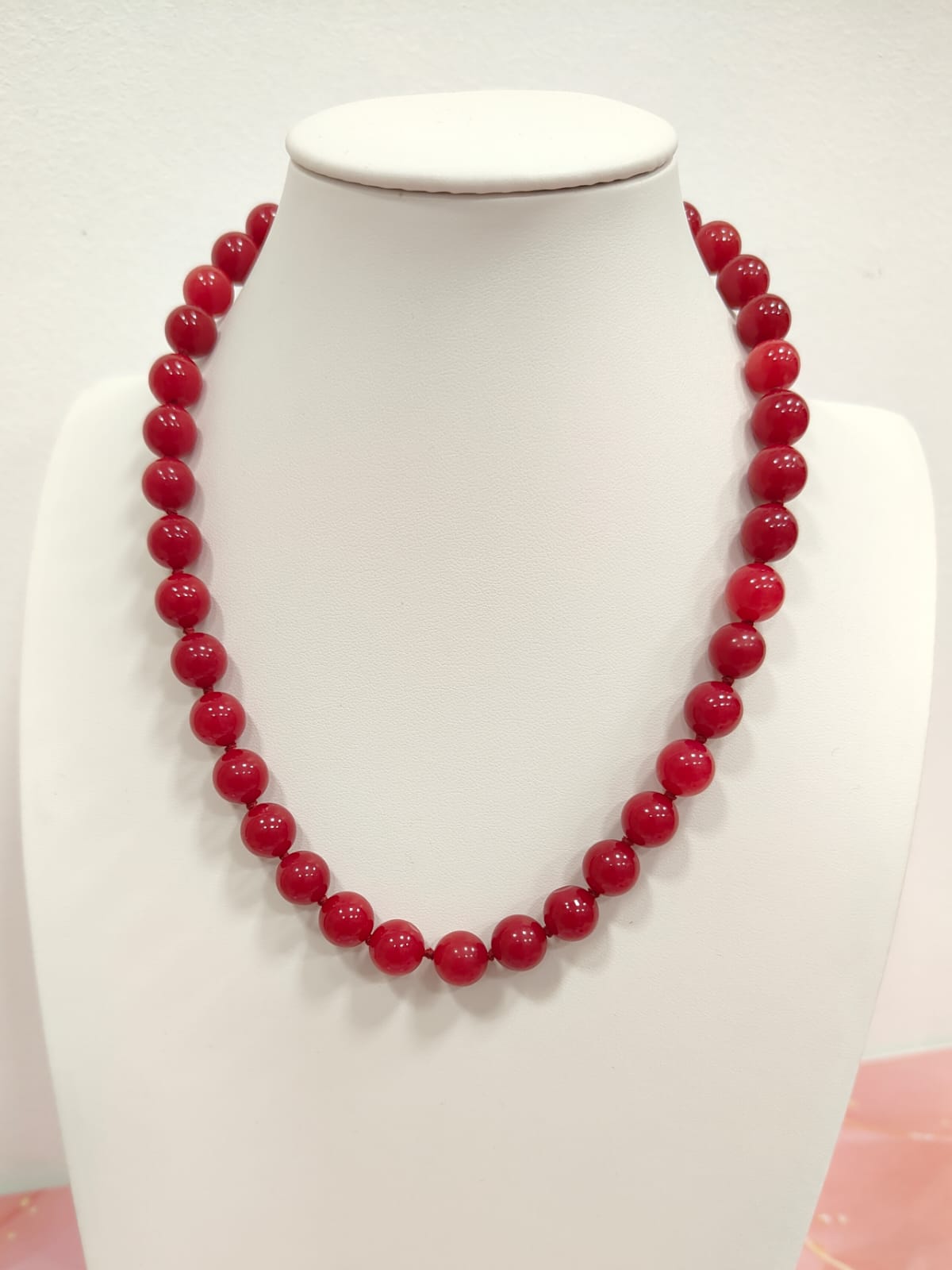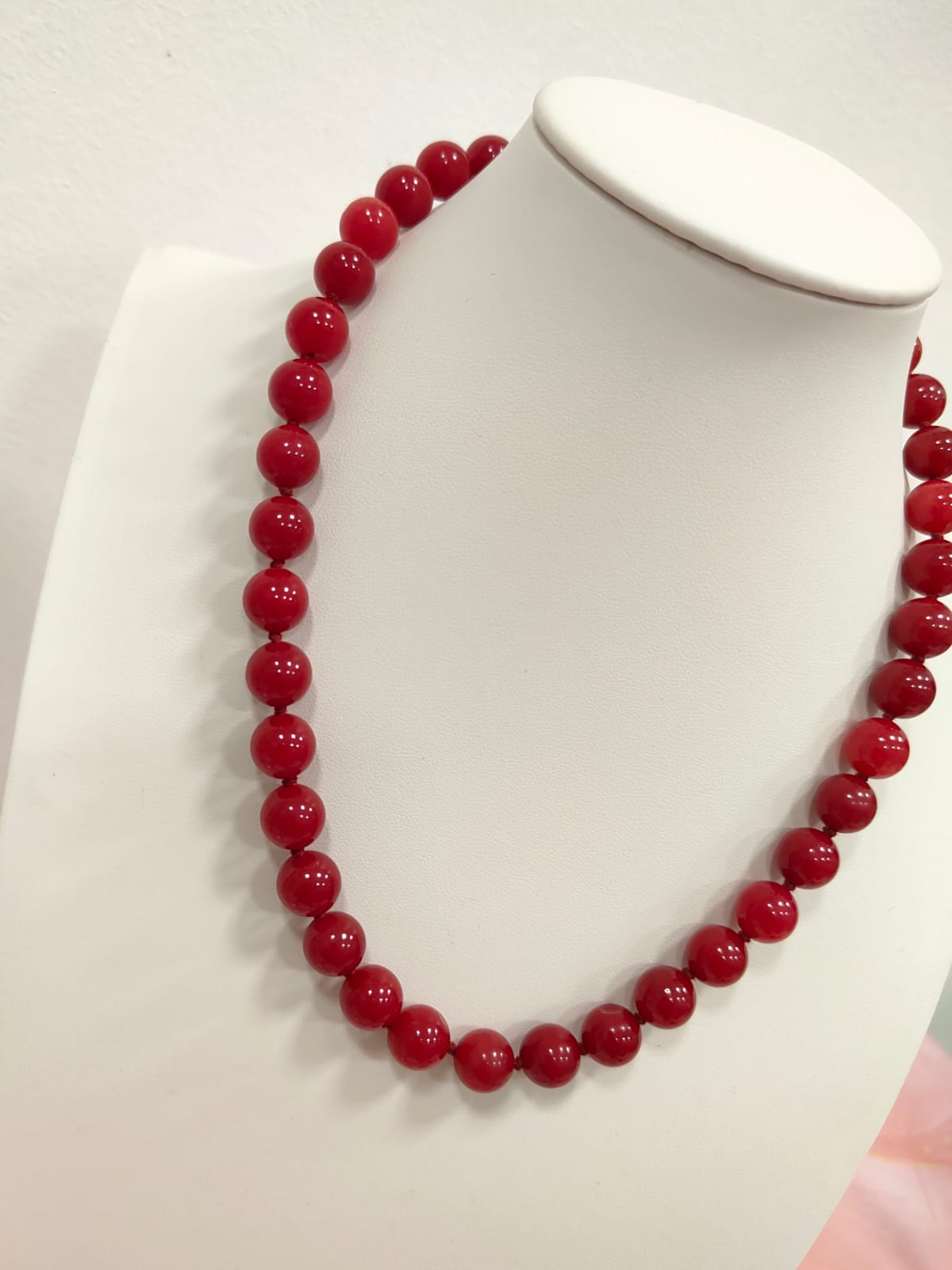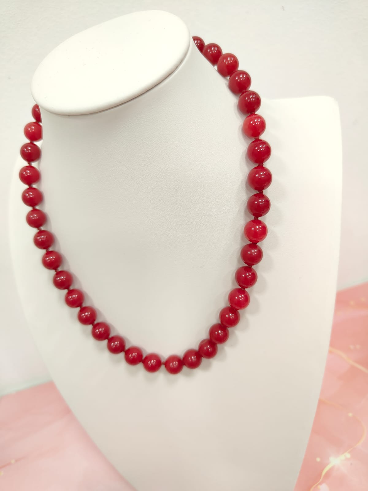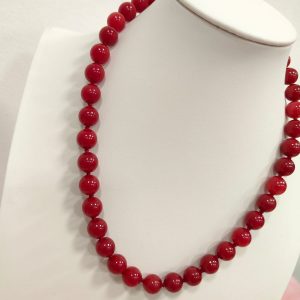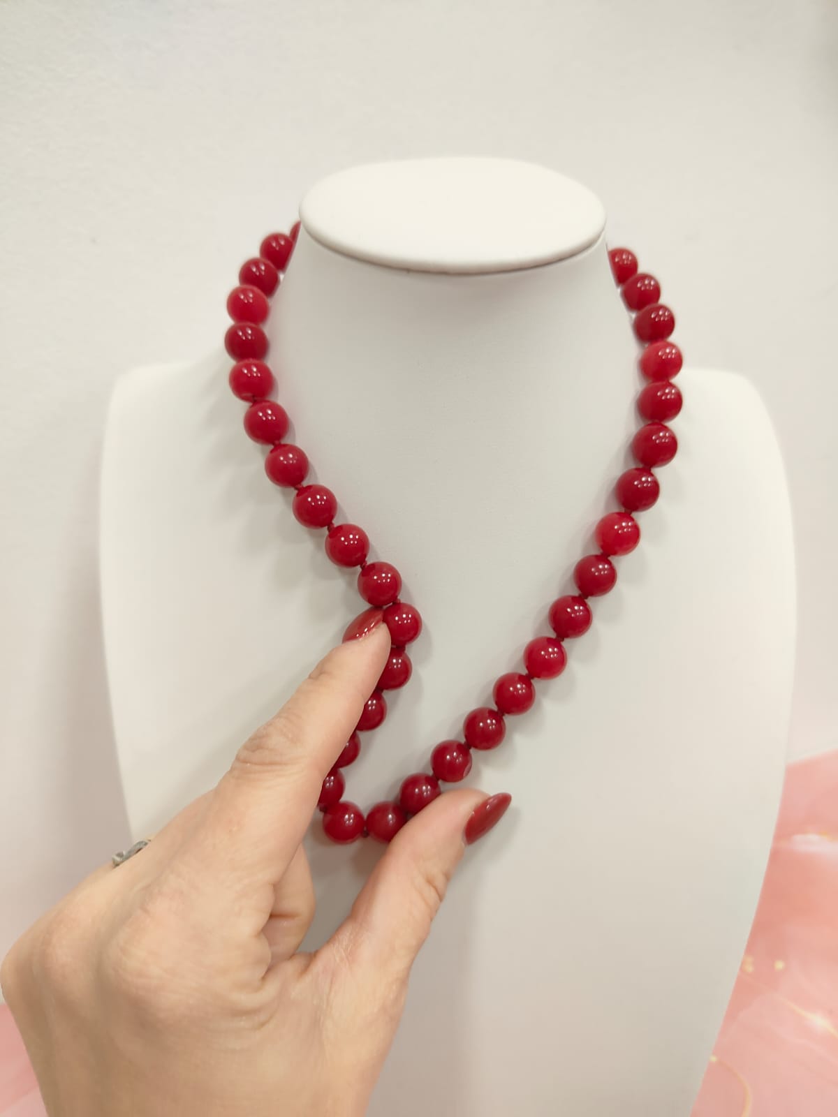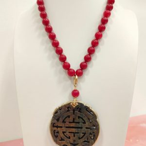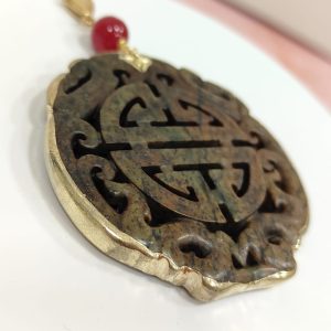 La collana è composta da sfere in agata rossa, annodate interamente a mano. Questa pietra naturale, leggermente più scura rispetto al rosso acceso, dona calore e intensità alla composizione. L’agata rossa è tradizionalmente legata all’energia vitale e al radicamento. Per questo motivo, crea un dialogo armonioso con la giada antica del ciondolo.