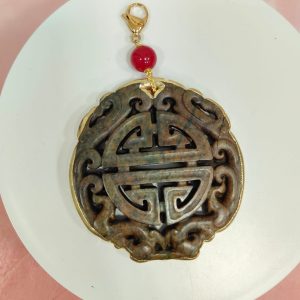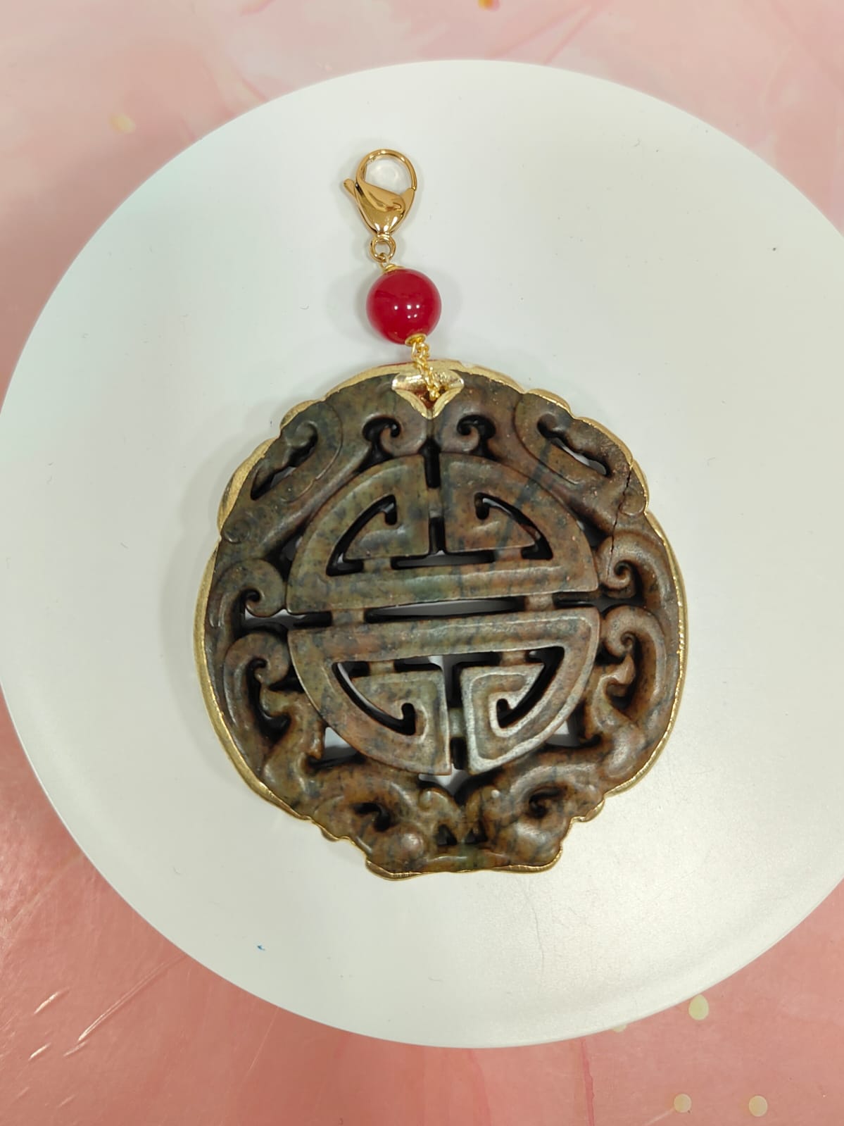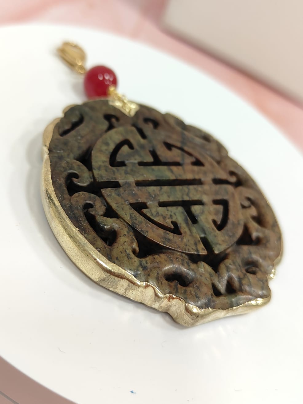 Il ciondolo centrale è realizzato in giada antica finemente lavorata, con un elegante bordo dorato che ne valorizza le incisioni e la profondità materica della pietra. La giada, da sempre associata a protezione e saggezza, rende questo gioiello particolarmente significativo. Inoltre, la presenza del simbolo del mandala rafforza il messaggio di equilibrio interiore e stabilità.