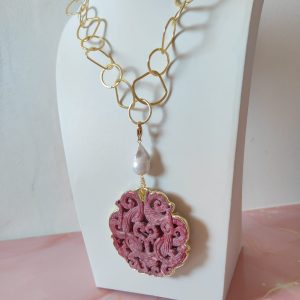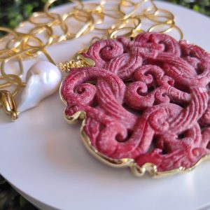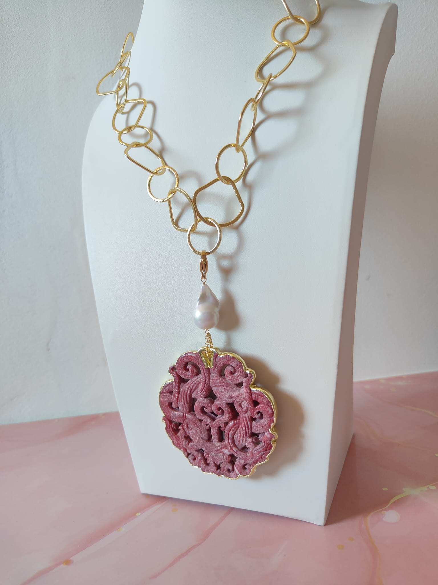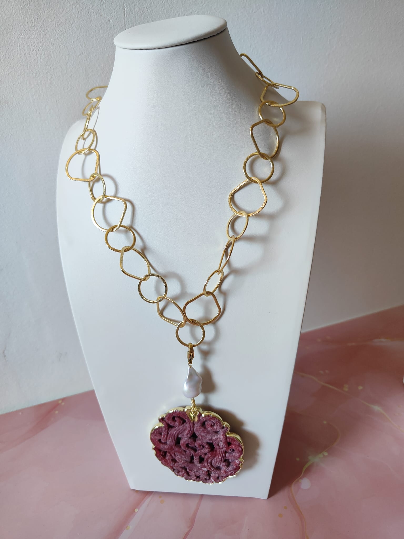 La collana mandala in giada bordeaux è una creazione che fonde eleganza e significato simbolico. La sua catena a maglia larga in ottone dorato nickel free dona luce e carattere al collo, valorizzando ogni look con un tocco di originalità contemporanea. Al centro, protagonista indiscusso, il grande ciondolo mandala in giada bordeaux, finemente intagliato a mano con motivi sinuosi e ricco di dettagli, incorniciato da un raffinato bordo dorato che ne esalta la profondità e la luminosità.