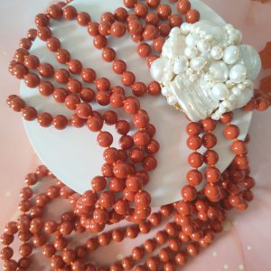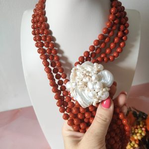 Esemplare artigianale, pezzo unico ma comunque ripetibile: ogni creazione potrà presentare leggere differenze nelle sfumature del corallo e nella disposizione delle perle, mantenendo sempre l’inconfondibile fascino dell’artigianalità.