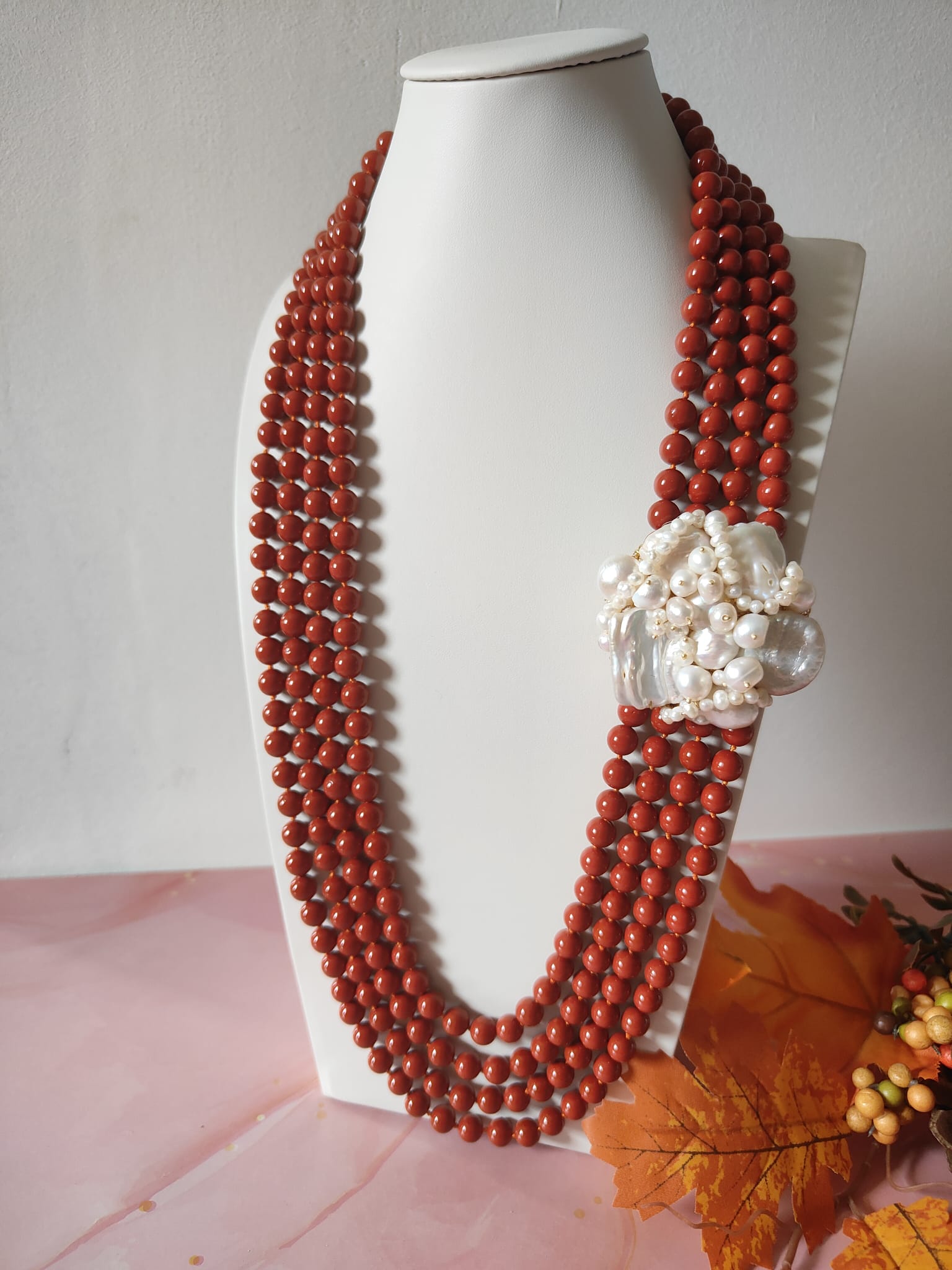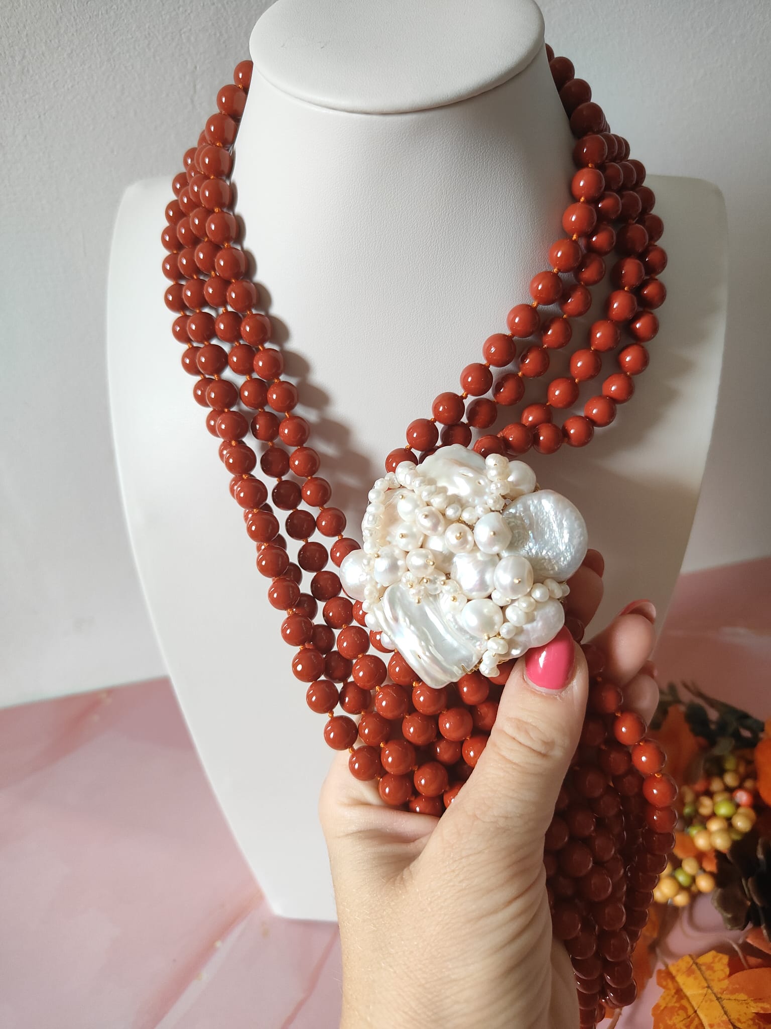 I fili di pasta di corallo, dal colore rosso/arancio vivido e intenso, si moltiplicano creando una cascata di eleganza che avvolge il décolleté con calore e carattere. Al centro, a impreziosire la composizione, troviamo un connettore interamente realizzato a mano, composto da perle naturali di diverse dimensioni e forme. Questo elemento artigianale, ricco di movimento e dettagli, conferisce alla collana una personalità forte e al tempo stesso delicata, in grado di rendere ogni outfit speciale.