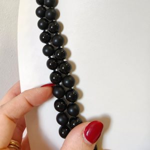 La collana è realizzata con sfere di onice nero naturale da 10 mm. Le pietre alternano finitura lucida e satinata, creando un ritmo visivo sofisticato. Inoltre, questa scelta dona profondità e movimento alla composizione. Ogni elemento è annodato a mano singolarmente, garantendo resistenza e una vestibilità armoniosa.