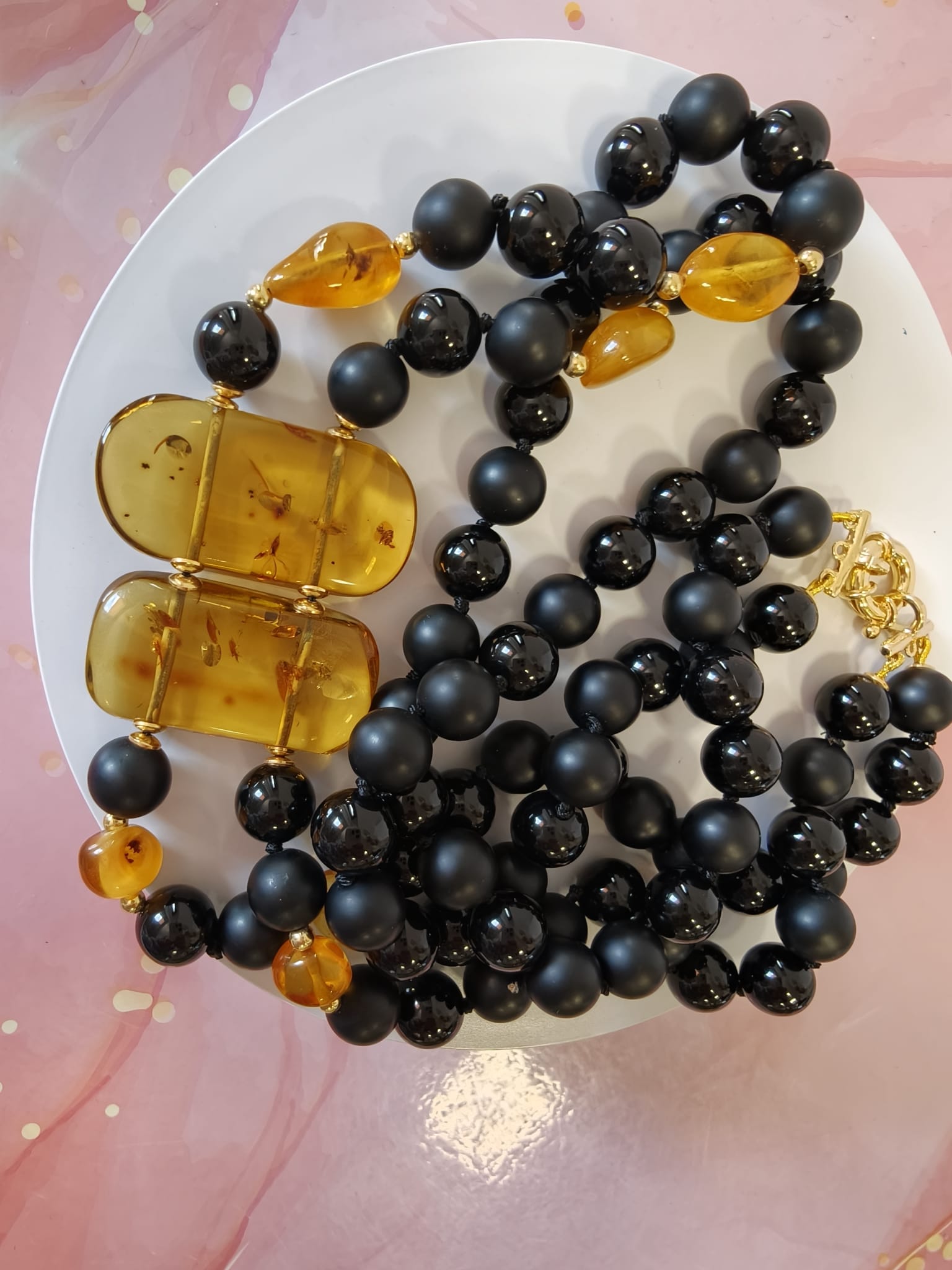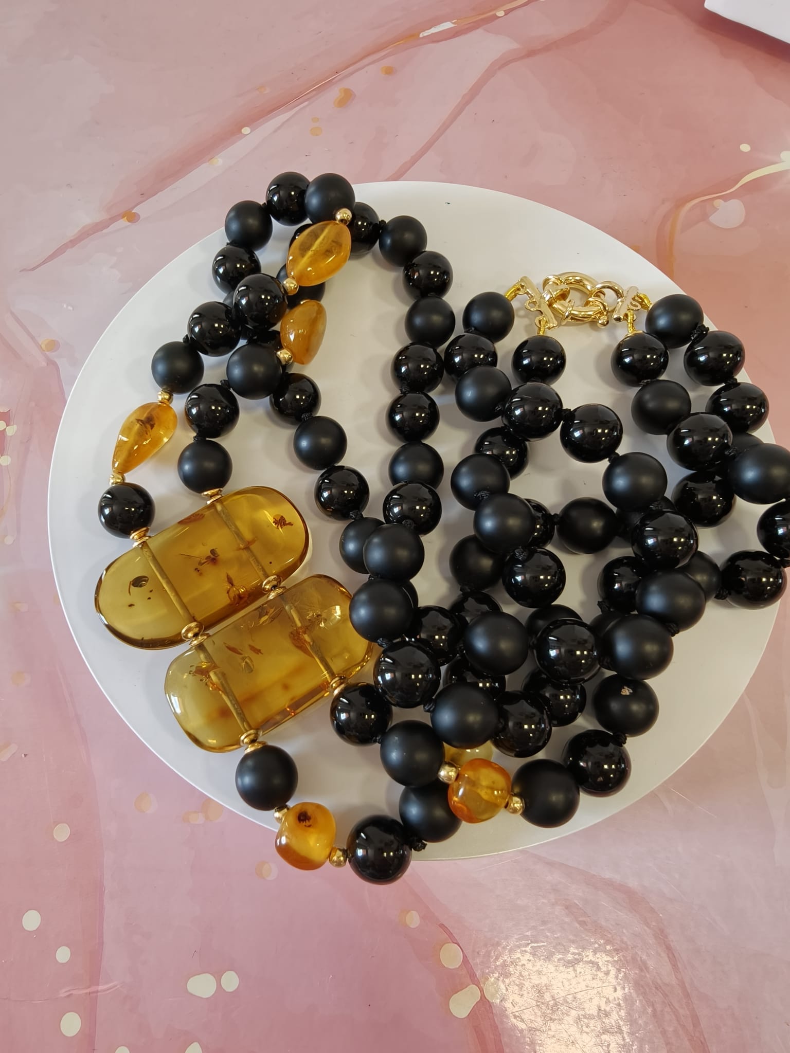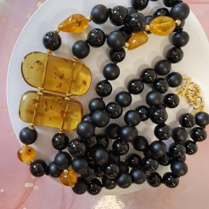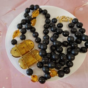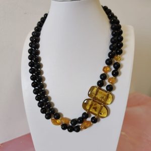 Questa collana onice e ambra miele è una creazione artigianale dal carattere deciso ed elegante. È pensata per chi ama gioielli materici, raffinati e senza tempo. Fin dal primo sguardo, il contrasto cromatico cattura l’attenzione e valorizza il décolleté con equilibrio.